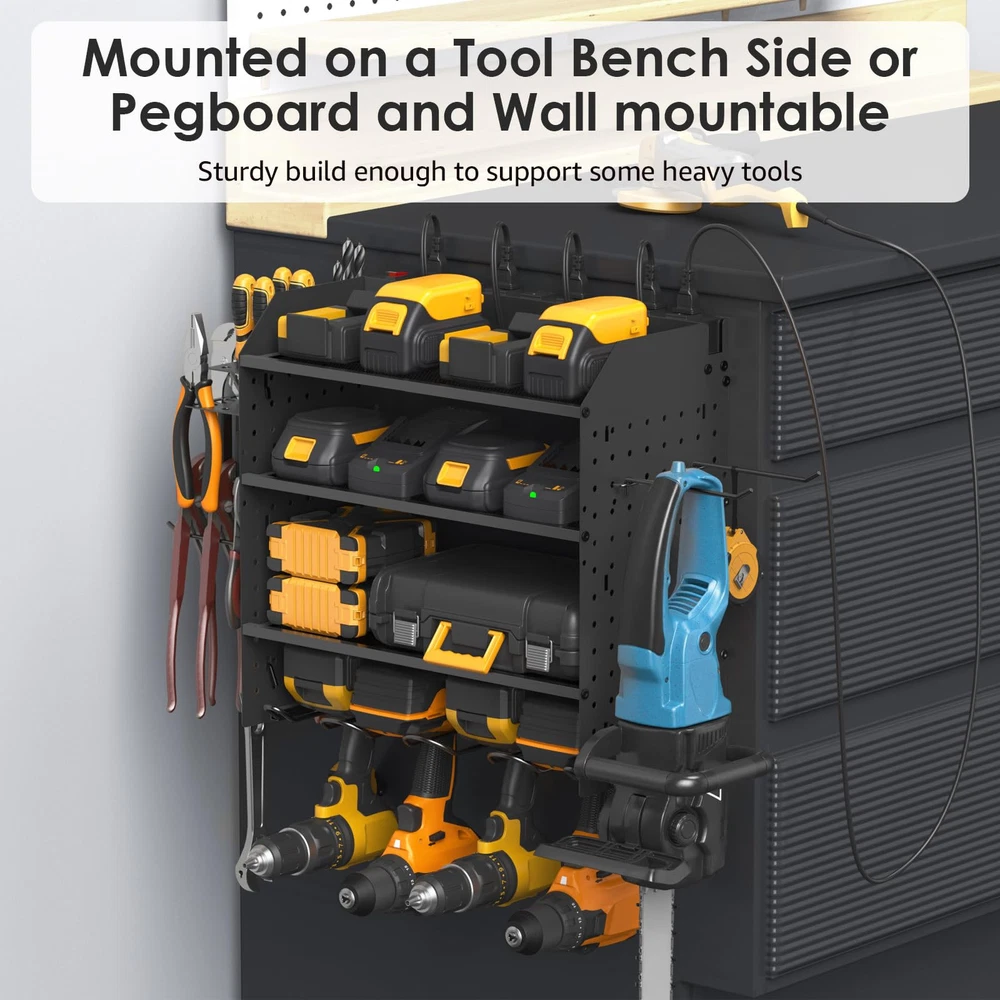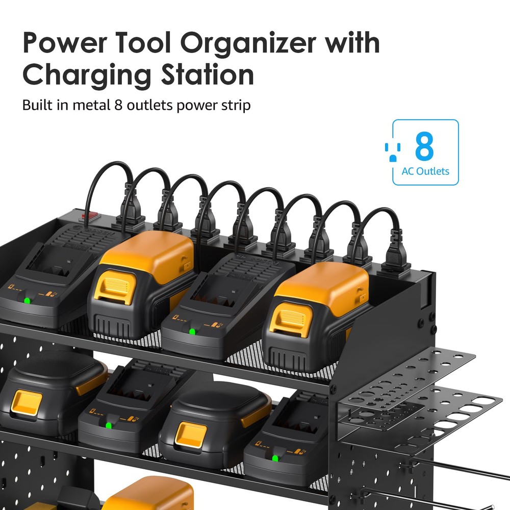 Black wall mount power tools organizer with power strip, pegboard design, 4 slots, 4 hooks, 4 pegboard hooks and side tools organizer, 4 layer structure shelf and one layer adjustable for actual needs, can keep rechargeable tools organized in the work area and save your bench space. Power tool organizer with charging station, come with 8 outlets. If you have a lot of rechargeable tools and cordless drills batteries, you can charge everything right in the rack and avoid searching for sockets. 6ft 14AWG power cord included. The tools in the picture are for demonstration purposes only and are not included. Very convenient for charging your tool batteries, All-in-one design and the metal power strip with surge protection of 1200J, Able to protect your device to a certain extent, output: 125V/15A/1875W. Utility rack size: L:16.5in * W:8.7in * H:16.57in. Can be mounted on pegboard. Add a tool box on the side to store multiple types of gadgets - Commonly used drill bits, tweezers, screwdrivers. Side panels are 0.25" pegboard design, come with four 5.4" long hooks and 4 hooks to hang tools, Strong enough and can hang heavy machines. to increase the diversity of storage. Easy to assemble and mount on a peg board, If you need more storage space, you can connect the two shelves (or more) by screws (Same height). Each layer of the grid can support a maximum weight of 33IB. Made from heavy gauge steel. Amazing christmas or father's day gift for men.