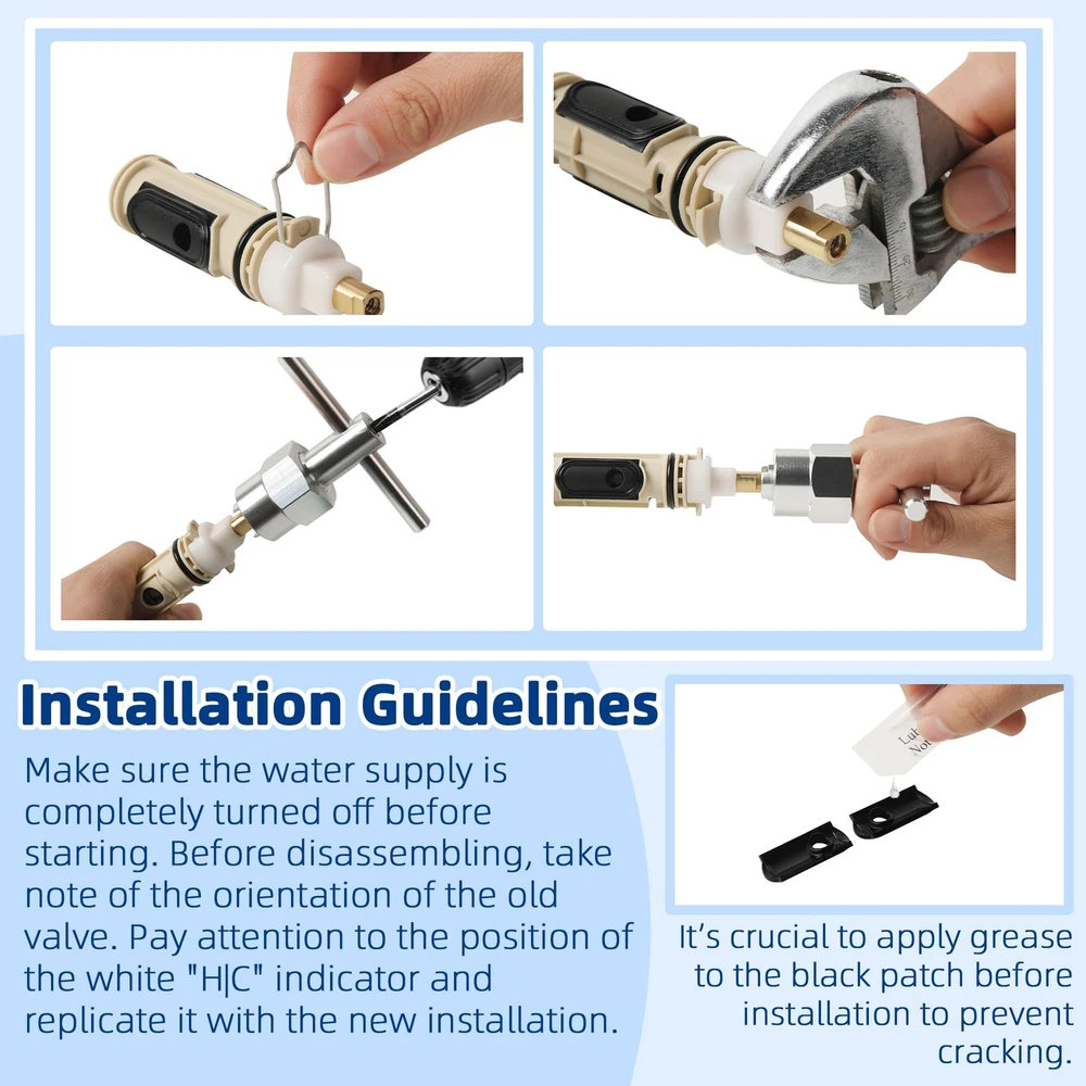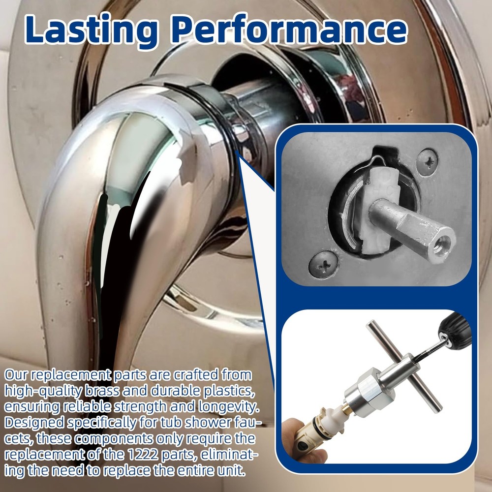 Lasting Performance: Our replacement parts are crafted from high-quality brass and durable plastics, ensuring reliable strength and longevity. Designed specifically for tub shower faucets, these components only require the replacement of the 1222 parts, eliminating the need to replace the entire unit. The latest version boasts enhanced durability and cost-effectiveness, providing reliable solutions for your plumbing needs Lasting Performance: Our shower faucet replacements are crafted from durable brass and plastics, ensuring reliable strength and longevity. Designed specifically for tub shower faucets, these components only require the replacement of the 1222 parts, eliminating the need to replace the entire unit. The latest version boasts enhanced durability and cost-effectiveness Complete Installation Kit: The shower valve kit includes a 1222 replacement cartridge, a retainer clip, a shower cartridge puller tool, detailed installation and disassembly instructions, and a small tube of lubricant. The included lubricant and retainer clip save you money and streamline the process Quality Construction: Constructed from durable aluminum, our cartridge removal tool is built for reliability. Its sturdy design ensures that it withstands the rigors of regular use. Whether you're dealing with an old, worn-out cartridge or installing a new one, this faucet cartridge removal tool simplifies the process and enhances your efficiency Installation Guidelines: To ensure a successful installation, please follow these important tips. Make sure the water supply is completely turned off before starting. Before disassembling, take note of the orientation of the old valve. Pay attention to the position of the white "H|C" indicator and replicate it with the new installation. It’s crucial to apply grease to the black patch before installation to prevent cracking Efficient and Cost-Effective: The replacement cartridge is specifically designed for single-handle positive temperature faucets in bathtubs and showers. It effectively resolves issues related to water pressure loss or leaks caused by wear over time, helping you conserve water and save on utility bills