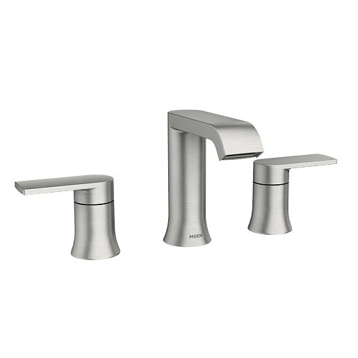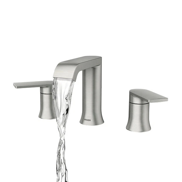 Moen 84763SRN Spot Resist Brushed Nickel Genta 2 Handle Bathroom Faucet Moen 84763SRN Spot Resist Brushed Nickel Genta 2 Handle Bathroom Faucet The Genta bath suite boasts contemporary, curved edges for an appealing, yet substantial style that brings a sleek feeling to the Bath. Spot Resist™ brushed nickel finish resists fingerprints and water spots for a cleaner looking bath two-handle lever handle makes it easy to adjust the water faucet handles can be installed between 8" to 16" for a more customized widespread installation complies with Americans with Disabilities Act (ADA) specifications features Duralock™ quick connect system for easy installation aerated flow is ideal for everyday bathroom tasks, like brushing teeth and washing hands meets current legislation, including ab1953 (california) and s152 (vermont) Listing and template services provided by inkFrog