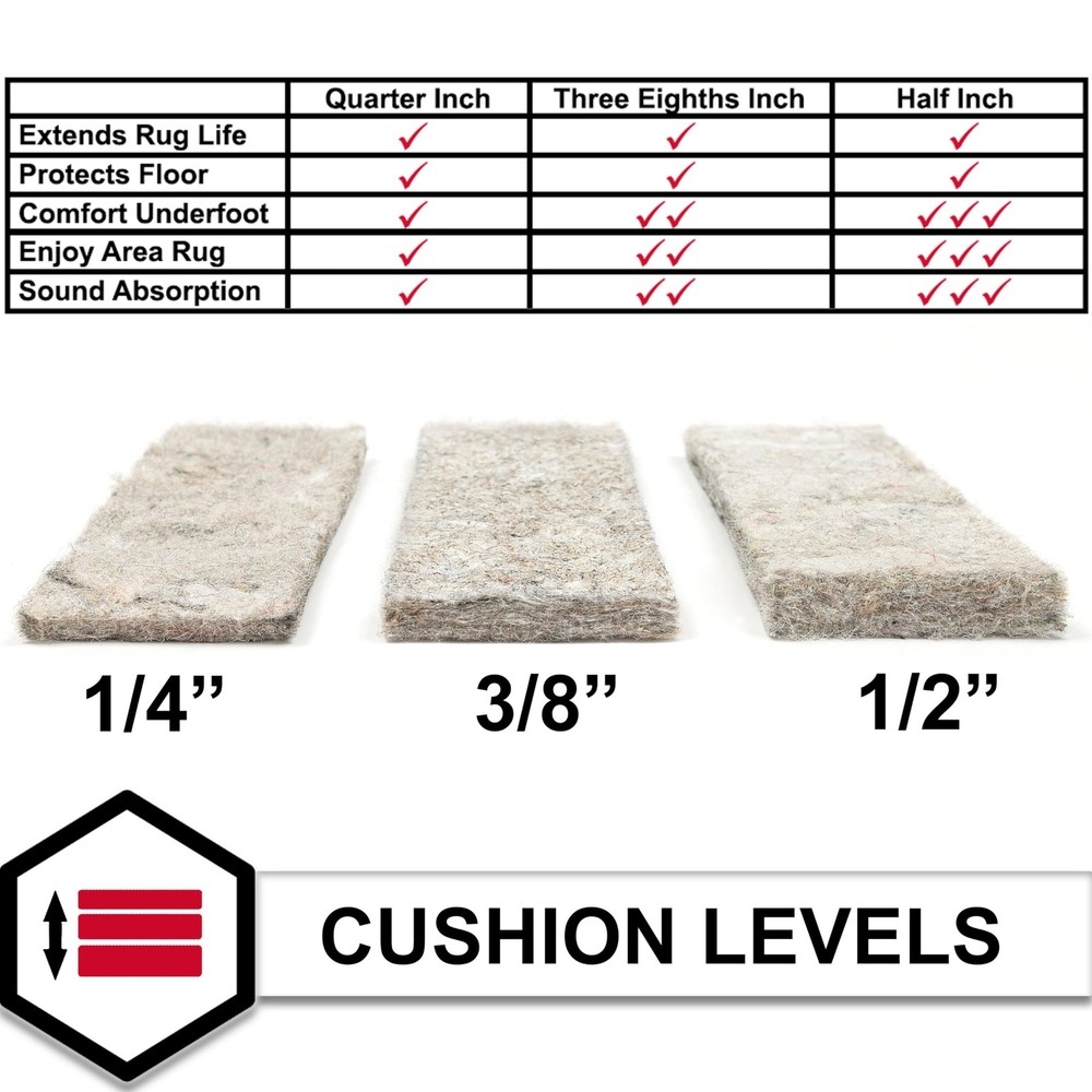 PLUSH FELT CUSHION: Choose from three thickness options - 1/4", 3/8”, and 1/2" - offering various levels of a soft feel underfoot, sound absorption, insulation, and extra comfort for your area rugs in busy spaces. RECOMMENDED USE: This FELT ONLY rug pad is not intended to stop area rugs from slipping. These rug pads are crafted for use under area rugs that are anchored down by heavy items such as furniture, large household décor pieces, or heavier area rugs. LONG-LASTING PROTECTION: The durable felt protects your flooring from long-term damage, such as scratches, scrapes, punctures, other types of abrasion wear, and discoloration from your area rug backing. EXTEND LIFE OF RUG: Prevents area rugs from creasing, bunching, and wrinkling, and keeps your rug surface smooth on the floor to make vacuuming easier. (AREA RUG NOT INCLUDED) CUSTOMIZABLE SIZING: Simply score the surface and trim your rug pad with scissors to fit any area rug size or shape by cutting approximately 1-2 inch short of your area rugs perimeter.