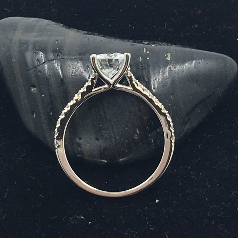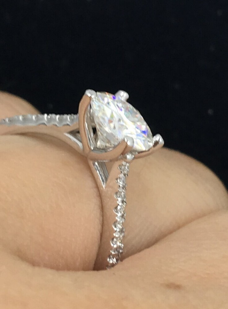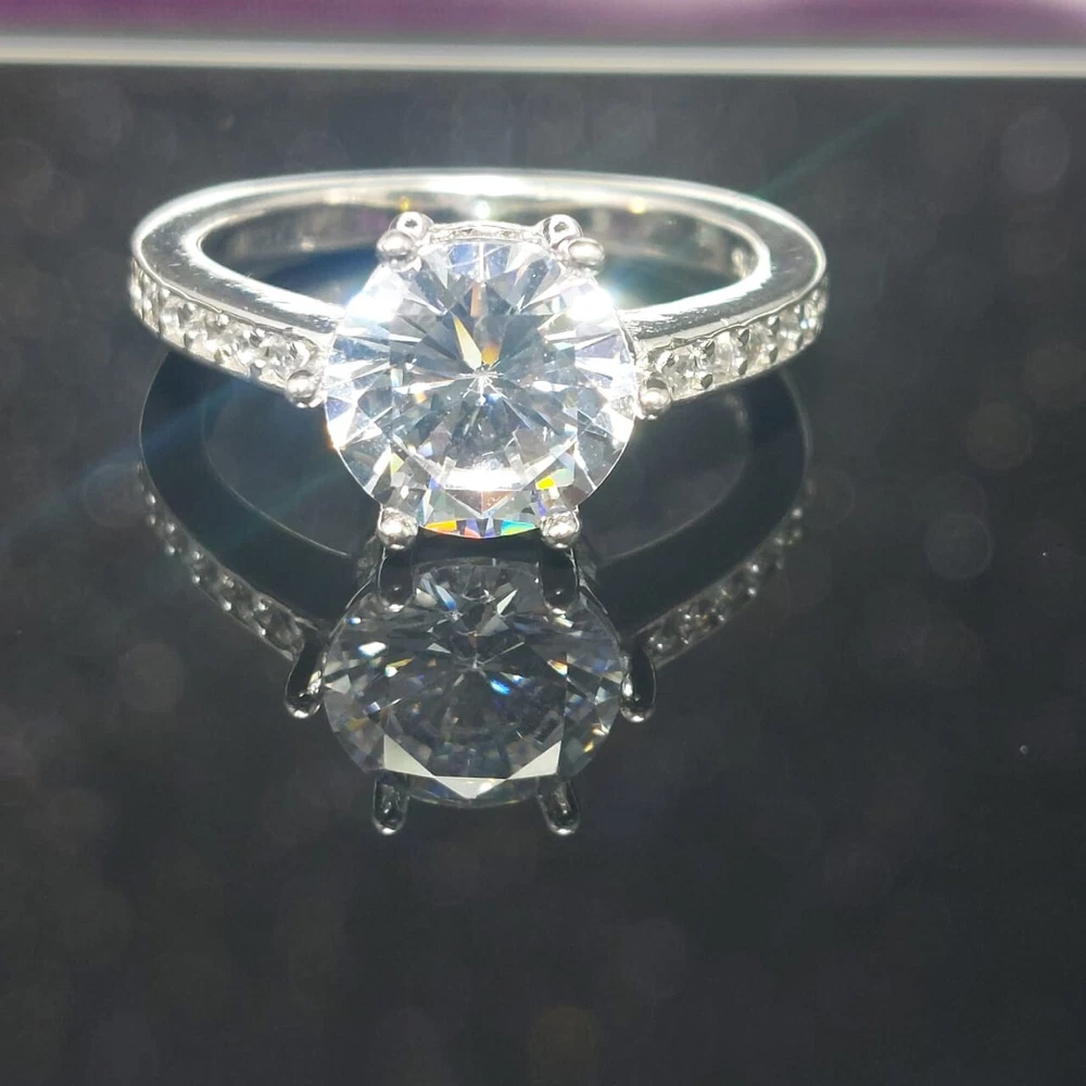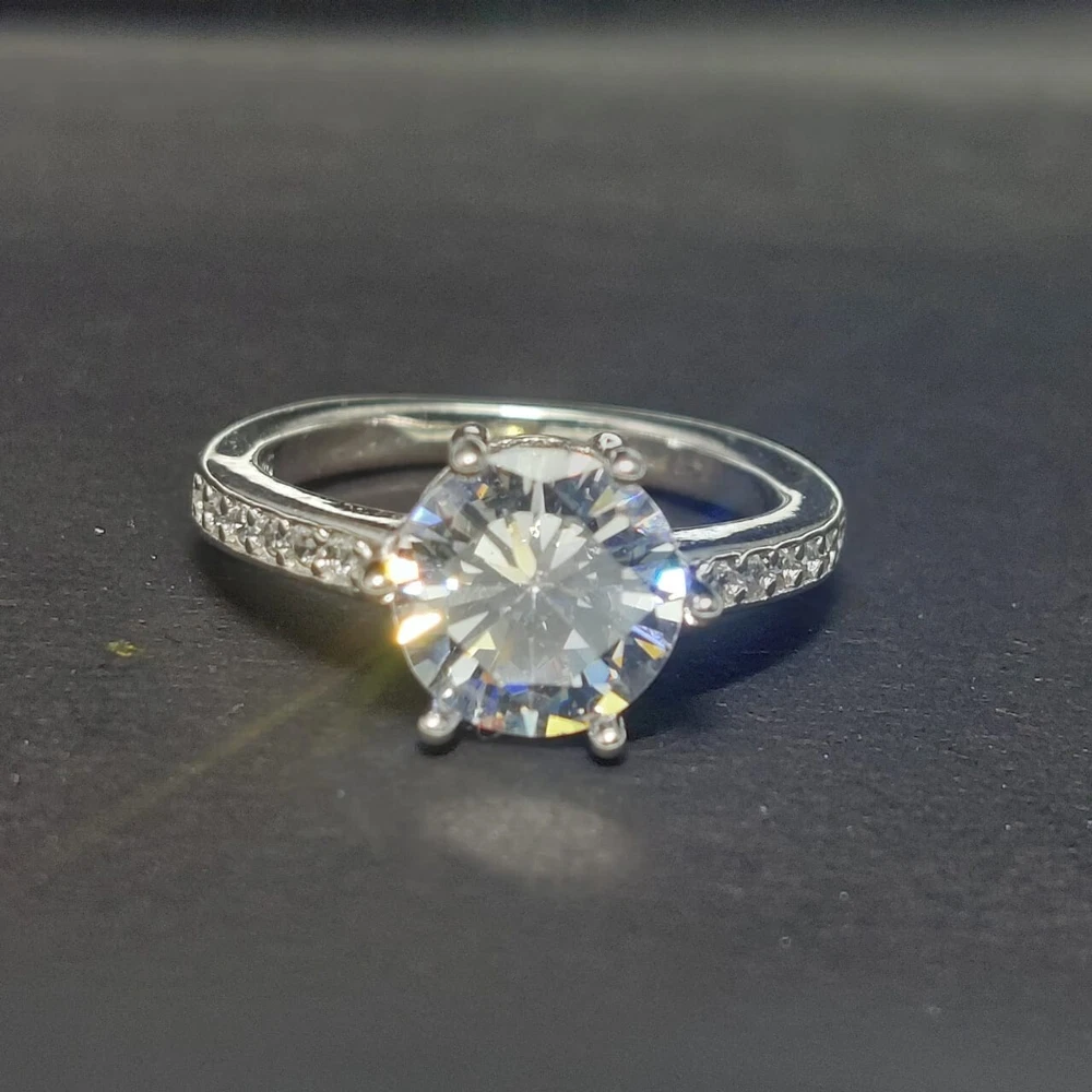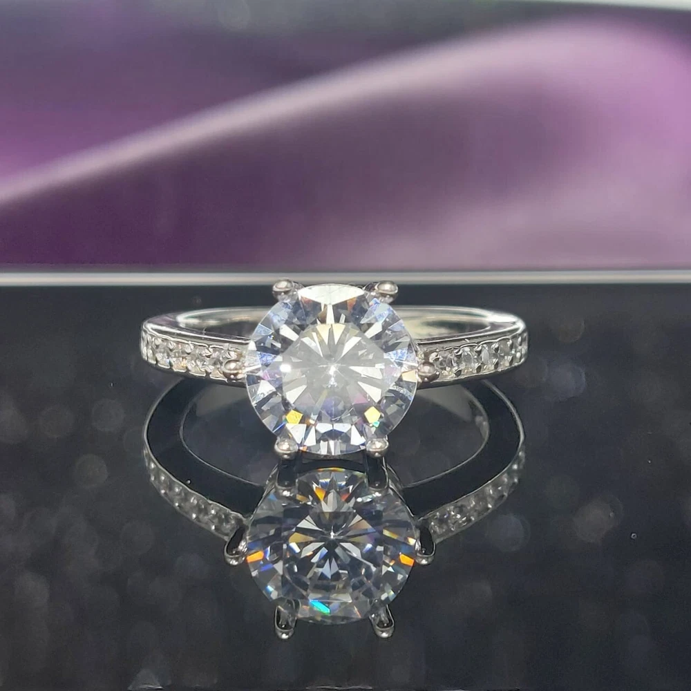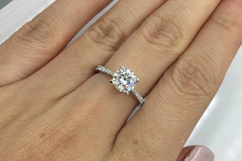 This beautiful ring is the perfect choice for anyone looking for a statement piece of jewelry. Crafted from high-quality materials, it features a stunning round moissanite stone with excellent cut grade and eye-clean clarity grade. The prong setting style ensures that the stone is securely held in place, while the nickel-free feature makes it comfortable to wear. The ring is made of 925 silver plated sterling silver and is completely handmade. It is perfect for any occasion, whether it's for an engagement, wedding, anniversary, or Valentine's Day. The band width is 2 mm, and the ring is available in size 6. This ring is customizable, and the seller offers a wide range of options to choose from.
