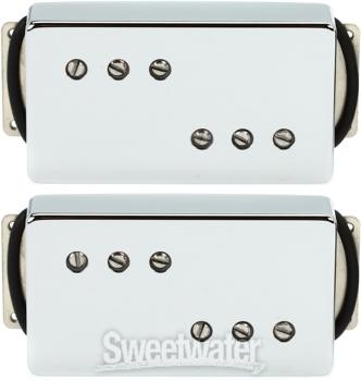 '72 Humbucker Clones with All-American Mojo If you're looking for American-made, vintage-vibe 'buckers for your F-style guitar, look no further than the Mojotone '72 Wide Range Clone Humbucking Pickup Set. These high-quality pickups are made on American soil, in Burgaw, NC, entirely of American parts. They bring back the chime, clarity, and focus of the original '72 F-style wide range humbucker by using threaded magnets rather than the magnetized steel poles used in the '72 reissues. Mojotone also slightly underwinds the neck humbucker, yielding a better tonal balance between the neck and bridge pickup — plus, they use 4-conductor wiring to give you options like coil taps and series/parallel setups. Guitarists at Sweetwater love the sound of Mojotone '72 Wide Range Clone Humbucker Pickups, and we think you will, too!Mojotone '72 Wide Range Clone Humbucking Pickup Set Features: 1 neck and 1 bridge position American-made humbucker replacement set for your Sweetwater is an Authorized Mojotone Dealer Genuine New Item Sweetwater's 2-year warranty Mojotone '72 Clone Humbucker 2-piece Pickup Set - Chrome Humbucking '72-style Neck and Bridge Pickup Set with Chrome Covers - Hardware Included '72 Humbucker Clones with All-American Mojo If you're looking for American-made, vintage-vibe 'buckers for your F-style guitar, look no further than the Mojotone '72 Wide Range Clone Humbucking Pickup Set. These high-quality pickups are made on American soil, in Burgaw, NC, entirely of American parts. They bring back the chime, clarity, and focus of the original '72 F-style wide range humbucker by using threaded magnets rather than the magnetized steel poles used in the '72 reissues. Mojotone also slightly underwinds the neck humbucker, yielding a better tonal balance between the neck and bridge pickup — plus, they use 4-conductor wiring to give you options like coil taps and series/parallel setups. Guitarists at Sweetwater love the sound of Mojotone '72 Wide Range Clone Humbucker Pickups, and we think you will, too! Mojotone '72 Wide Range Clone Humbucking Pickup Set Features: 1 neck and 1 bridge position American-made humbucker replacement set for your F-style guitar Captures the original pickups' chime, clarity, and focus with significant updates Threaded through-bobbin magnets instead of magnetized steel poles yield authentic tone 4-conductor wiring allows options such as coil tapping and series/parallel setup 500k potentiometers recommended Will not fit standard humbucker cavities; specifically designed to replace '72 reissue humbuckers Specification Detail Type Set: Wide Range Humbucker Active/Passive Passive Configuration HH Set Number of Conductors 4 wire plus ground DC Resistance 10.7K (bridge), 9.8K (neck) Connectivity Soldered Number of Strings 6 Covering Covered Color Chrome Features 3+3 Pole Pieces RETURN INFORMATION We want you to be completely happy with your purchase from Sweetwater. If you are not satisfied with your product, you may return it for a refund of the purchase price within 30 days. If your purchase was eligible for Free Shipping, the shipping cost will be deducted from your credit or refund. Returns must be in the complete and original packaging with all accessories and complete documentation (Owner's Manual, warranty card, quick start guides, etc.), show no signs of wear or use, and include a Return Authorization number or be subject to a restocking fee.