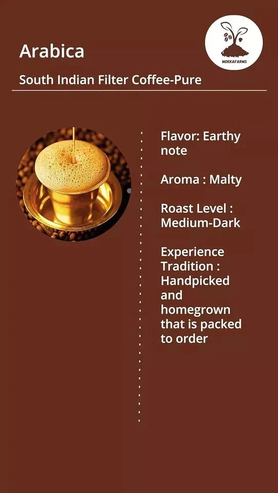 MokkaFarms 100% Pure Arabica Roasted Coffee Beans 350g Free Shipping World Wide About this item FLAVOURFUL COFFEE: Treat yourself to the exquisite flavors of MokkaFarms Arabica Coffee, a sensory experience like no other FARM to FORK: From planting, harvesting, grading, roasting, grinding to processing and packaging, we carefully track every step of the coffee production process to give high quality and maintain consistency HANDCRAFTED: Our coffee is carefully handcrafted in small batches to deliver a rich and remarkable flavor, strength and aroma while ensuring consistency AROMATIC, GREAT TASTE: Arabica coffee has a toasty aroma and a velvety taste CONVENIENCE, REUSABLE PACKAGING: Comes in a convenient, tamper-proof, one-way valve, resealable zip-lock pouch for maximum freshness Legal Disclaimer: Actual product packaging and materials may contain more and different information than what is shown on our app or website. We recommend that you do not rely solely on the information presented here and that you always read labels, warnings, and directions before using or consuming a product. Product description High-quality Arabica coffee beans sourced from the best coffee-growing regions in India. The beans are carefully selected and roasted to perfection to create a rich and aromatic coffee experience. The result is a smooth and balanced cup of coffee with a unique flavor profile. The Arabica beans give the coffee a mild and fruity taste with a hint of chocolate. The brewing method enhances the flavors and aromas, resulting in a full-bodied and satisfying cup of coffee. The coffee with Arabica beans can be enjoyed hot or cold and is perfect for those who appreciate a strong and flavorful coffee. Whether you prefer a classic cup of black coffee or a creamy and sweet latte, this coffee blend will satisfy your cravings. Indulge in the rich and authentic taste of South Indian filter coffee with Arabica beans and experience the true essence of Indian coffee culture. Proudly Made in India! Shipping All item will be shipped directly from Malaysia . Registered Post Item delivered will required signatures at the time of receiving. Dispatched items tracking number will be updated within 24 hrs. Of the dispatch. All items ordered will be dispatched within 48 hour after receiving the clear payment. All items require 15 to 30 business days to arrive at the given address. Please do not order if you are not willing to wait for above given time. All our items will be shipped worldwide, In any case the item is been stuck to the buyers custom department the buyer has to pay the custom charges for the receiving of the item. If you need express delivery we can arrange by DHL,Aramex,Fedex & UPS delivery time period 3-5 working days for more details please contact us through eBay message. *condition apply* 9398 SMR WWS