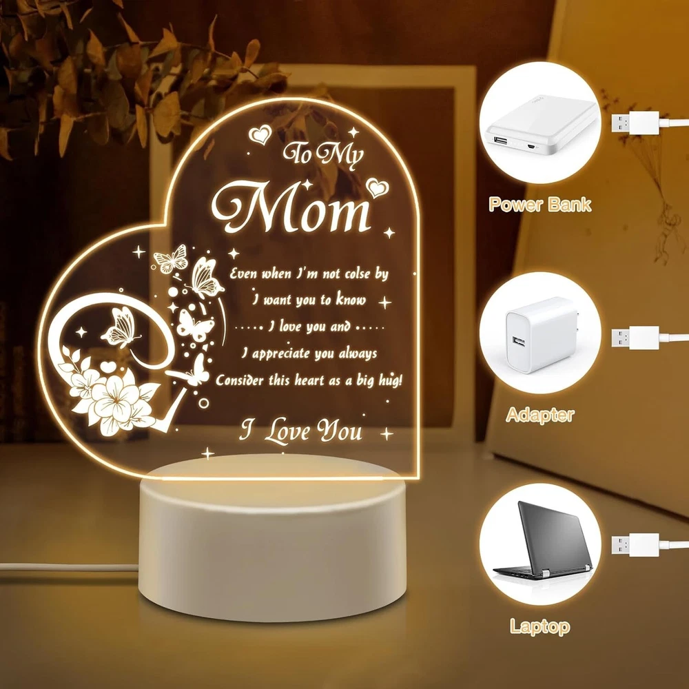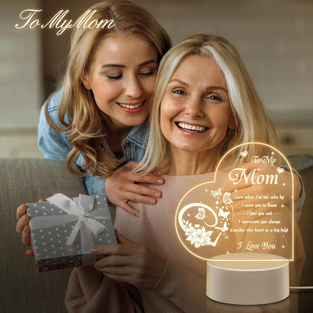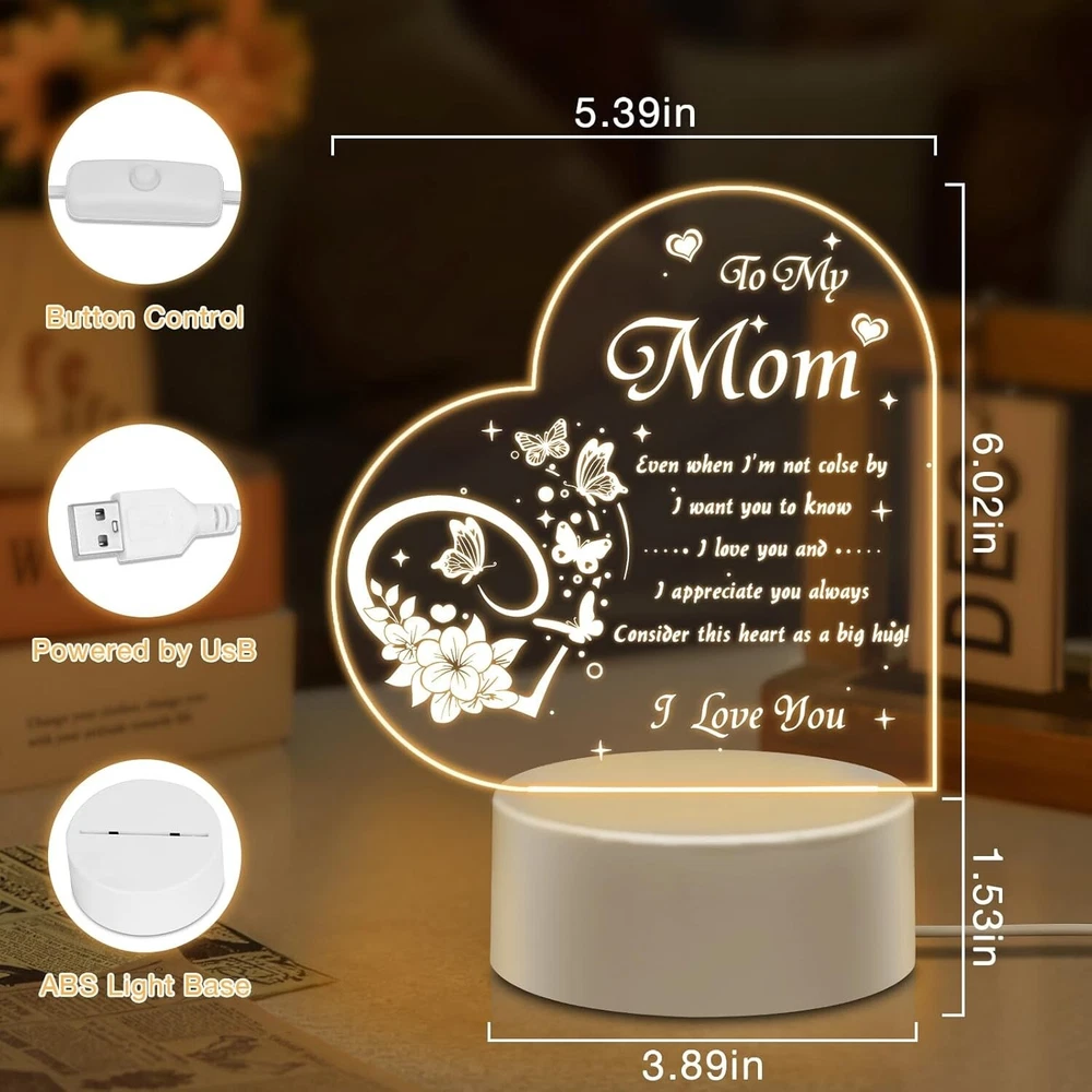 Mother: 【Gifts for Mom】 This personalized night light is engraved with heartwarming words -"Even when I'm not colse by I want you to know I Love you and I appreciate you always consider this heart as a big hug! I Love you"; This night lamp present to express your love for your mother, mom is a great woman that we are most thankful. 【Mom Birthday Gifts Ideas】The night light is made of acrylic and a base, with acrylic light guide plate to bring you a soft lighting effect, the light will not be too strong or too weak, non-flickering and non-glaring, even if you wake up in the middle night, it won’t be dazzling and create the ideal sleep environment for your family. Expressing sincere gratitude for her. USB charging port for PC, charger and mobile devices, et 【Gifts Birthday Gifts For Mom】When you receive the goods, you will find that there is a protective film on the night light. You need to tear it off before use. Be careful not to leave fingerprints when installing. if you are not careful, you can wipe it off to achieve the best visual effect. This LED lamp is great gifted for different special occasions. 【Happy Gifts for Mom 】Every time mom sees this night light engraved with heart-warming words, she will feel strong love. This is a surprise and amazing gift to your Mom.This mom night light for women is the choice. Wife: 【Gifts For Wife 】This personalized night light is engraved with heartwarming words - "To my Wife My Love Your smile ignites MY SOUL your touch heals me and your presence Completer me you are my everying My Forever and ALWAYS". This night light present to express your love for your wife. 【Mothers Day Gifts For Wife 】The night light is made of acrylic and a base, with acrylic light guide plate to bring you a soft lighting effect, the light will not be too strong or too weak, non-flickering and non-glaring, even if you wake up in the middle night, it won’t be dazzling and create the ideal sleep environment for your family. Expressing sincere gratitude for her. USB charging port for PC, charger and mobile devices, et. 【Wife Gifts 】When you receive the goods, you will find that there is a protective film on the night light. You need to tear it off before use. Be careful not to leave fingerprints when installing. if you are not careful, you can wipe it off to achieve the best visual effect. This LED lamp is great gifted for different special occasions. The night lamp marriage will bring wife lucky and happiness. Let your wife know that she will always be in your heart. Let your wife know how important she means to you. 【Birthday Gifts For Wife】Every time sister sees this night light engraved with heart-warming words, she will feel strong love from her sisterhood . This is a surprise and amazing to your sister. She will love it. Suitable to apply as home decoration in your bedroom, living room, dining room, etc.