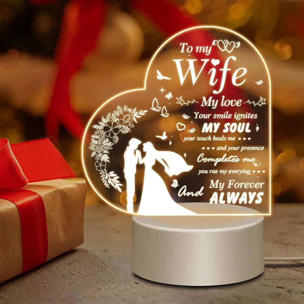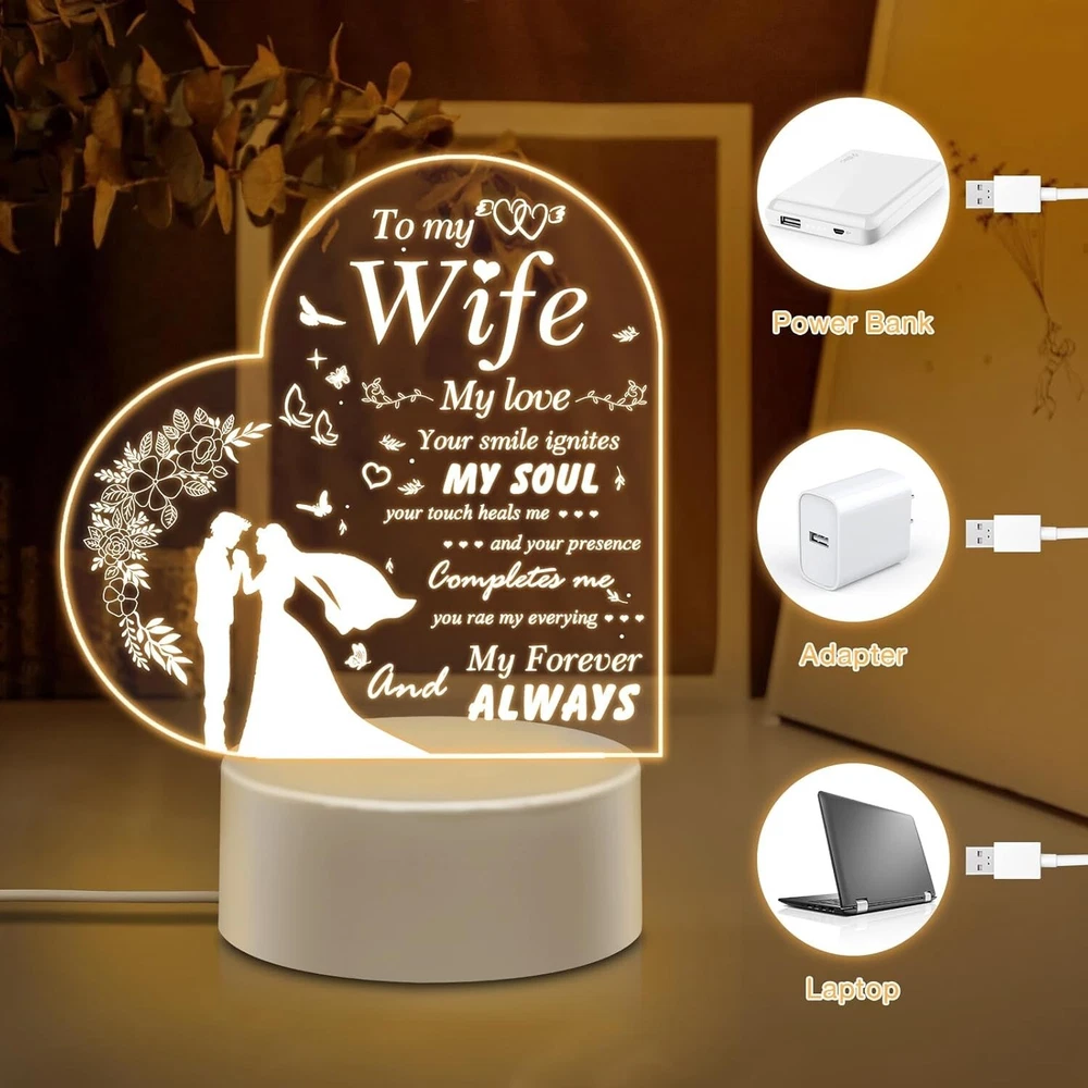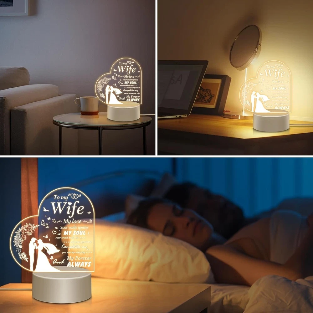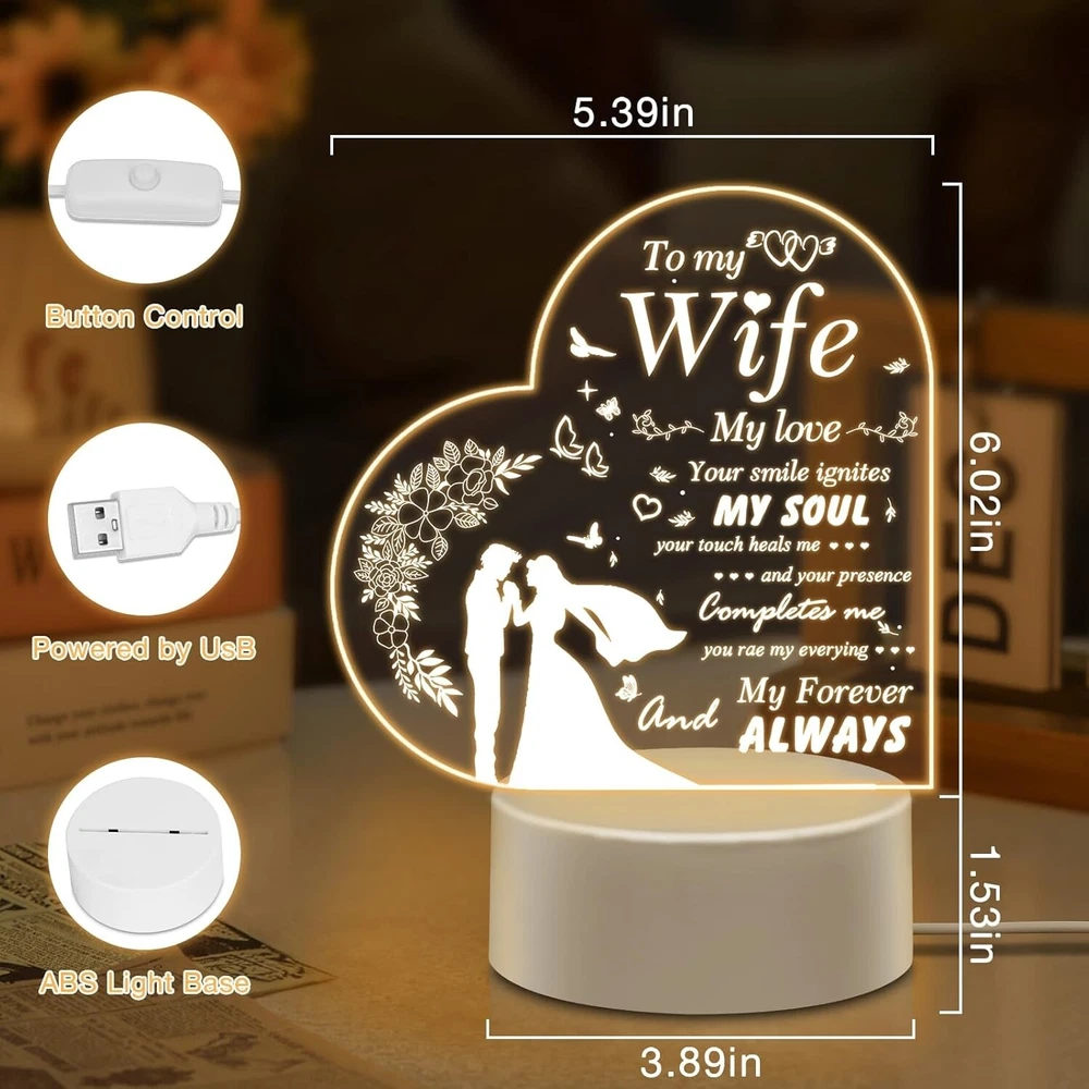 Mother: 【Gifts for Mom】 This personalized night light is engraved with heartwarming words -"Even when I'm not colse by I want you to know I Love you and I appreciate you always consider this heart as a big hug! I Love you"; This night lamp present to express your love for your mother, mom is a great woman that we are most thankful. 【Mom Birthday Gifts Ideas】The night light is made of acrylic and a base, with acrylic light guide plate to bring you a soft lighting effect, the light will not be too strong or too weak, non-flickering and non-glaring, even if you wake up in the middle night, it won’t be dazzling and create the ideal sleep environment for your family. Expressing sincere gratitude for her. USB charging port for PC, charger and mobile devices, et 【Gifts Birthday Gifts For Mom】When you receive the goods, you will find that there is a protective film on the night light. You need to tear it off before use. Be careful not to leave fingerprints when installing. if you are not careful, you can wipe it off to achieve the best visual effect. This LED lamp is great gifted for different special occasions. 【Happy Gifts for Mom 】Every time mom sees this night light engraved with heart-warming words, she will feel strong love. This is a surprise and amazing gift to your Mom.This mom night light for women is the choice. Wife: 【Gifts For Wife 】This personalized night light is engraved with heartwarming words - "To my Wife My Love Your smile ignites MY SOUL your touch heals me and your presence Completer me you are my everying My Forever and ALWAYS". This night light present to express your love for your wife. 【Mothers Day Gifts For Wife 】The night light is made of acrylic and a base, with acrylic light guide plate to bring you a soft lighting effect, the light will not be too strong or too weak, non-flickering and non-glaring, even if you wake up in the middle night, it won’t be dazzling and create the ideal sleep environment for your family. Expressing sincere gratitude for her. USB charging port for PC, charger and mobile devices, et. 【Wife Gifts 】When you receive the goods, you will find that there is a protective film on the night light. You need to tear it off before use. Be careful not to leave fingerprints when installing. if you are not careful, you can wipe it off to achieve the best visual effect. This LED lamp is great gifted for different special occasions. The night lamp marriage will bring wife lucky and happiness. Let your wife know that she will always be in your heart. Let your wife know how important she means to you. 【Birthday Gifts For Wife】Every time sister sees this night light engraved with heart-warming words, she will feel strong love from her sisterhood . This is a surprise and amazing to your sister. She will love it. Suitable to apply as home decoration in your bedroom, living room, dining room, etc.