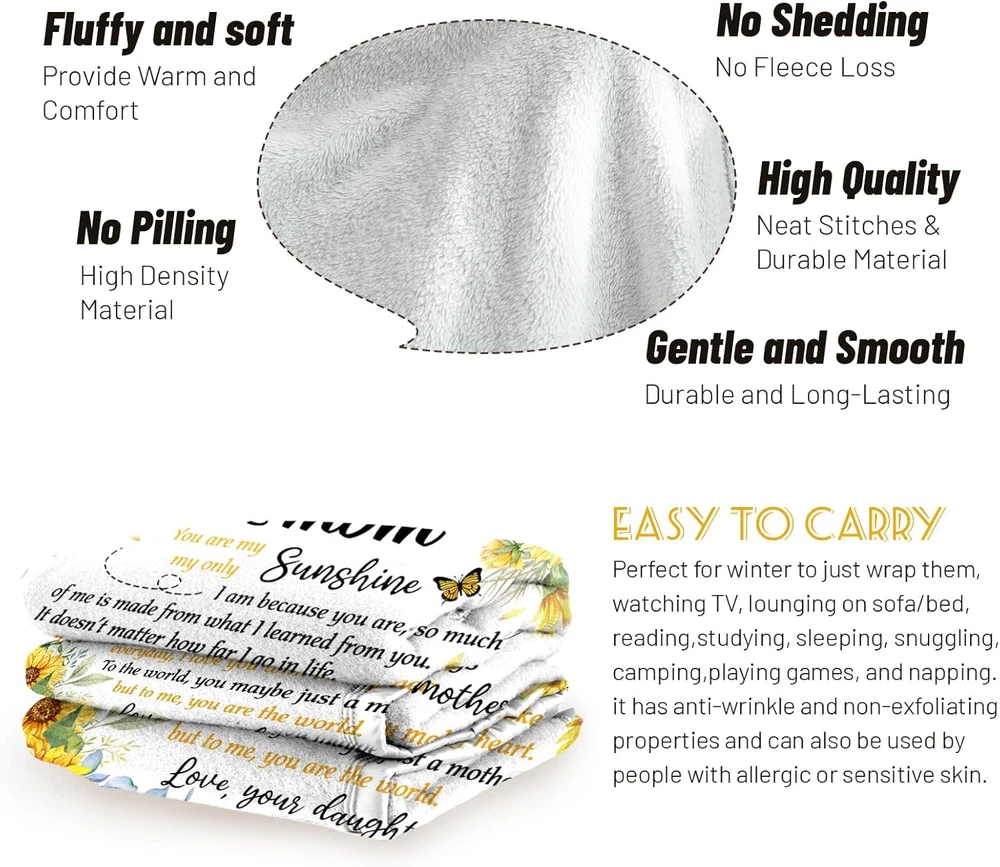 Store New Arrivals Add to Favorite View Feedback Contact Fast deliveries to the customer's home Quality customer service John Make the customers happy! Mom Blanket from Daughter on Christmas, Mom Birthday Gifts, Birthday Gifts for Mom Who Has Everything, to My Mom Soft Flannel Throw Blanket 50 X 60 Inch Description 【Perfect Mom Gifts from Daughter】- Give your mom the ultimate expression of love with our unique and practical mom blanket. Featuring a heartfelt message in a creative design, this blanket offers comfort and healing through all of life's challenges. 【Mom Birthday Gifts】- This mom blanket is more than just a gift, it's a warm hug from a loving daughter. Perfect for any occasion such as Mother's Day, Thanksgiving, or Christmas, this blanket is the perfect way to show your mom just how much you care. 【Soft and Premium Quality】- Our mom blanket is made from soft and fleecy material that feels great on both sides. It doesn't pill or pull, and the stitching is strong and reliable. 【Lightweight & Versatile Use】 - Whether it's a cold winter night or a summer nap on the couch, our mom blanket is perfect for any occasion. It's lightweight and easy to take with you wherever you go, and it can even be used as a children's crawling blanket. 【Easy To Care & Well-Packed】 - Our mom blanket is not only comfortable and convenient but also easy to care for. It's machine washable in cold water and won't lose its shape or color over time. Plus, our vacuum packing ensures that it stays clean and moisture-resistant until you're ready to use it. Product Description Age Range Description Adult Style mom Number of Items 1 Pattern Floral Material Type Flannel Blanket Form Throw Blanket Theme Love Fabric Type Polyester Material Flannel Model Name LHY001 Seasons All Additional Features Skin Friendly, Breathable Water Resistance Level Not Water Resistant Sport Type Camping Special Feature Skin Friendly, Breathable Item Dimensions L x W 60"L x 50"W Fabric Warmth Description Lightweight Color White Style Name mom Recommended Uses For Product Working, Travel, Reading, Napping Product Care Instructions Machine Wash Size 50 x 60 inch ABOUT US We offer the best prices around on high quality products. Our E-store includes media such as books, movies, music and games while offering electronics, toys, sporting apparel, clothing, tools, general home, garden items and more. SHIPPING We are always working hard to ensure your package arrives as soon as possible. Please understand that some factors like weather, high postal traffic, and the performance of shipping companies are outside of our control. We offer free shipping to the lower 48 states and ship within 2 business days of payment, usually sooner. We do not accept P.O. Boxes. Please provide a physical address. For shipping outside of the continental USA, we only use eBay's Global Shipping Program. The item is shipped to KY and then sent to the rest of the world. International customers are responsible for all duties and taxes. Continue to 'check out' to calculate costs for shipping the item to your country. Messages regarding eBay's Global Shipping Program MUST be directed at eBay EXCLUSIVELY. RETURNS We offer a 30-Day Return Policy on items in which you are not completely satisfied with. You have the option of a full-refund or an exchange of the item. No returns are available on items shipped outside of the USA PAYMENT We accept PayPal. CONTACT US This page content is yet to come Please ad us to your favorite seller and visit again later Thank You CUSTOMER SATISFACTION We try our very best to make sure every customer is completely satisfied. If there's a problem, message us! We're happy to help. WE ACCEPT