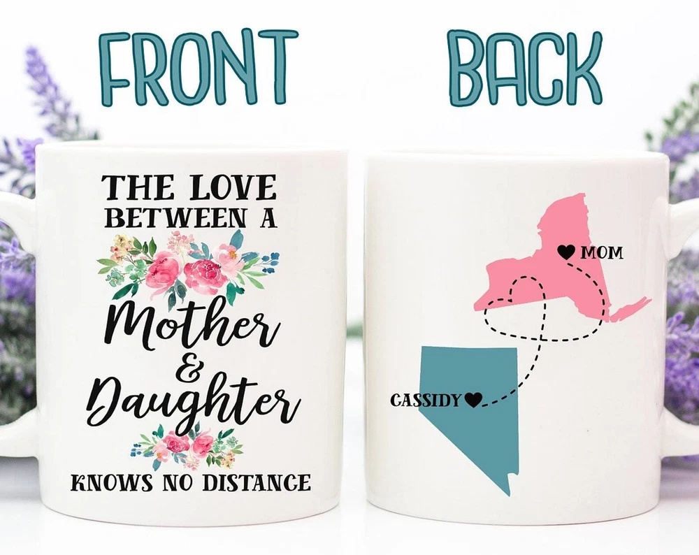 Mom Distance Mug Long Distance Mug Mom Coffee Mug State To State Mug Mom Mug Product Details.. This high quality 11oz. ceramic white mug has a premium hard coat that provides crisp and vibrant color reproduction sure to last for years. Perfect for all hot & cold beverages. The highest quality printing possible is used. It will never fade no matter how many times you wash it. Material: 100% Ceramic. Print both sides. Dishwasher and Microwave Safe. High Gloss + Premium White Finish. Printed in the U.S.A. Personalized & Custom. We support personalized and custom mug to add custom, when placing an order, you can add notes to the "order note" in shipping address section. Also you can contact us directly via message. Shipping Info. Ready to ship in 1 to 2 business days, All products are made-to-order and proudly printed in the United States. Shipped by USPS and DHL, You will receive your order in 5-7 days. Replace & Refund. All products are defective during shipping broken, chipped will be replaced free of charge. You are not satisfied with the product, we will refund 100% money to you. If any other issues arise, please do not hesitate to message, we would be more than happy to assist you.