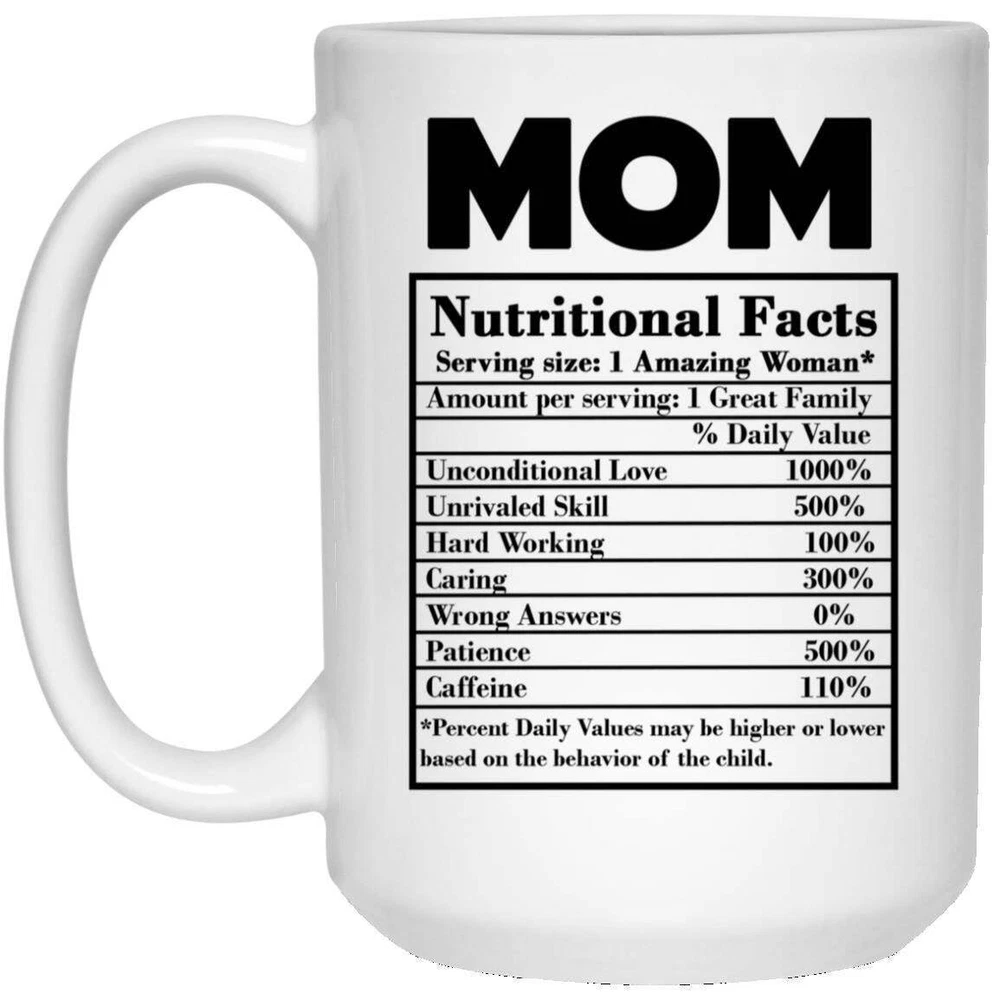 Mom Nutritional Facts Coffee Mug For Mom Funny Gift For Mommy Mother's Day Product Details.. This high quality 11oz. ceramic white mug has a premium hard coat that provides crisp and vibrant color reproduction sure to last for years. Perfect for all hot & cold beverages. The highest quality printing possible is used. It will never fade no matter how many times you wash it. Material: 100% Ceramic. Print both sides. Dishwasher and Microwave Safe. High Gloss + Premium White Finish. Printed in the U.S.A. Personalized & Custom. We support personalized and custom mug to add custom, when placing an order, you can add notes to the "order note" in shipping address section. Also you can contact us directly via message. Shipping Info. Ready to ship in 1 to 2 business days, All products are made-to-order and proudly printed in the United States. Shipped by USPS and DHL, You will receive your order in 5-7 days. Replace & Refund. All products are defective during shipping broken, chipped will be replaced free of charge. You are not satisfied with the product, we will refund 100% money to you. If any other issues arise, please do not hesitate to message, we would be more than happy to assist you.
