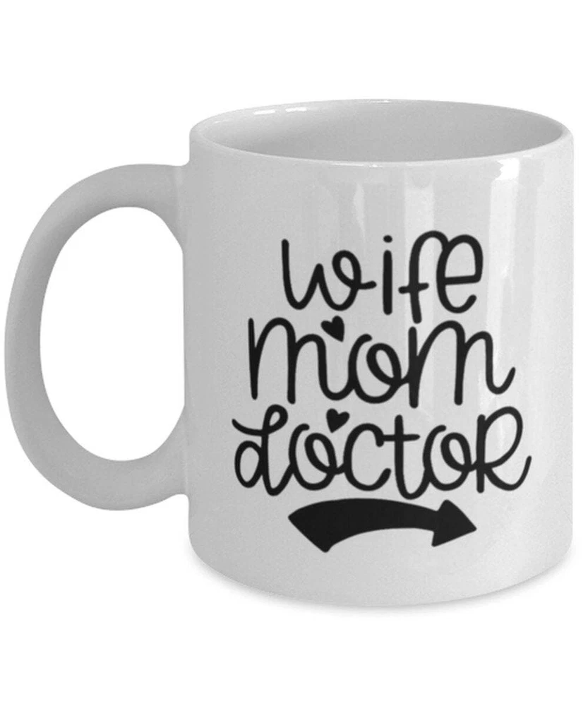 Mom Wife Doctor Graduation Coffee Mug Wife Mom Doctor Graduate Medical School Product Details.. This high quality 11oz. ceramic white mug has a premium hard coat that provides crisp and vibrant color reproduction sure to last for years. Perfect for all hot & cold beverages. The highest quality printing possible is used. It will never fade no matter how many times you wash it. Material: 100% Ceramic. Print both sides. Dishwasher and Microwave Safe. High Gloss + Premium White Finish. Printed in the U.S.A. Personalized & Custom. We support personalized and custom mug to add custom, when placing an order, you can add notes to the "order note" in shipping address section. Also you can contact us directly via message. Shipping Info. Ready to ship in 1 to 2 business days, All products are made-to-order and proudly printed in the United States. Shipped by USPS and DHL, You will receive your order in 5-7 days. Replace & Refund. All products are defective during shipping broken, chipped will be replaced free of charge. You are not satisfied with the product, we will refund 100% money to you. If any other issues arise, please do not hesitate to message, we would be more than happy to assist you.