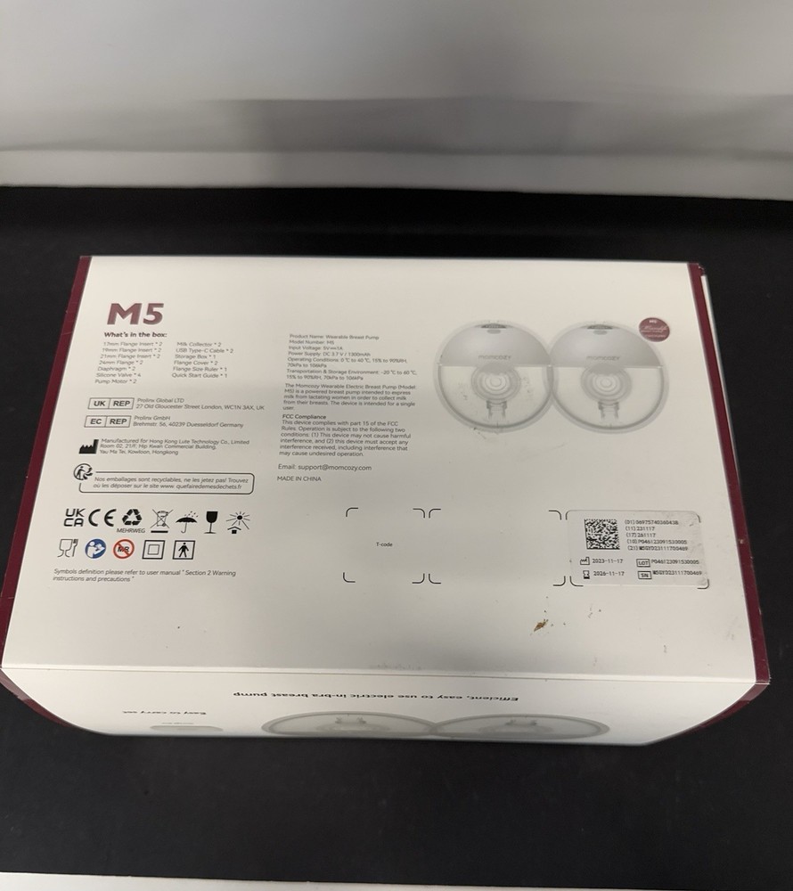 Power: usb Color: White Country of Origin: China Type: Hands-Free Pumping Bustier Brand: Momcozy Features: Adjustable Settings, Hands-free Model: Momcozy M5 Breastpump Set Includes: Collection Bottle, Double Pumping Kit, Multiple Breast Shell/Nipple Shield Sizes