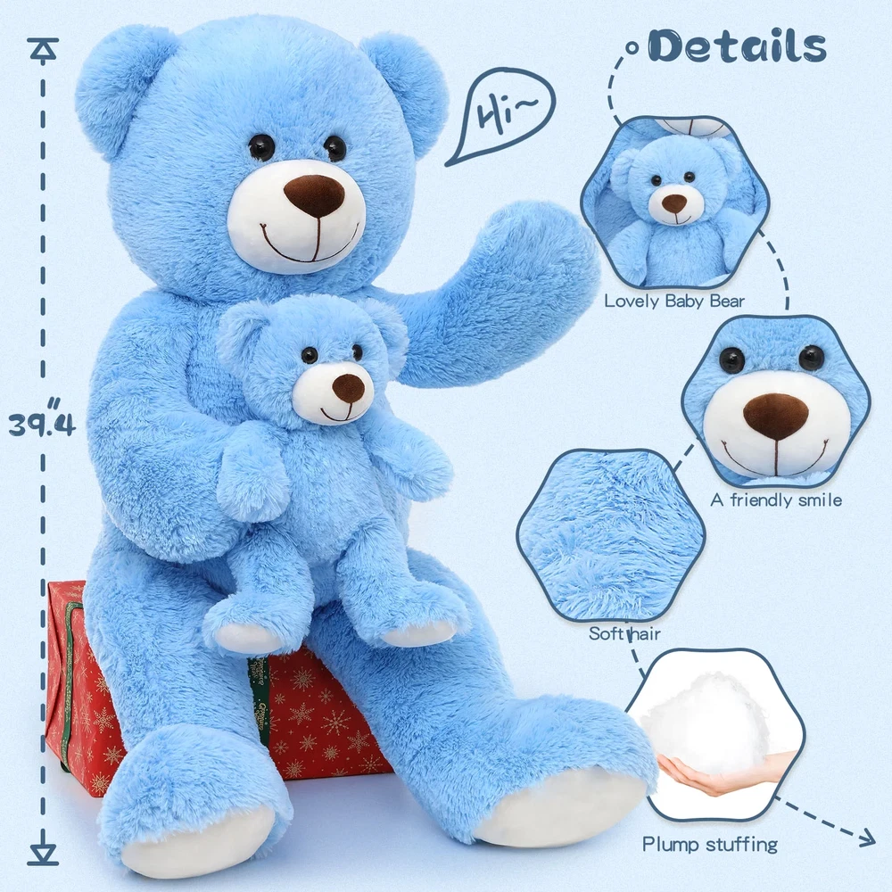 Our blue mommy teddy bear is 39" in height. The design of the mother teddy bear with a bright smile holds the lovely baby bear full of love. The big teddy bear is made of 100% safe materials, providing softness and comfort, and relieving fatigue and stress. This teddy bear stuffed animal is the perfect size for hugging and a bright decoration for a baby shower or a nice gift for others. Suitable Size & Color: The 39" large mommy bear with 13.8" small baby bear has several colors (brown, pink, blue...) for your choice Unique Design: The mother teddy bear with a bright smile holds the lovely baby bear. The zipper on the back can help the lovely bear recover its fluffy High Quality: These adorable giant teddy bears are made from 100% recycled stuffing and Eco-friendly polyester material for maximum softness and comfort. Lock-washer eyes and stitched nose ensure safe and durable use Easy Care: This giant stuffed bear is vacuum-packed. We usually recommend hand washing in cold water and air drying. It can effectively keep fluffy when put into the dryer. Also, the easy care for the large teddy bear will be better for your playtime Best Gifts: The stuffed bear is regarded as a super surprise gift to delight your family or friends at Christmas, Thanksgiving Day, Valentine's Day, Birthday or Any Anniversaries