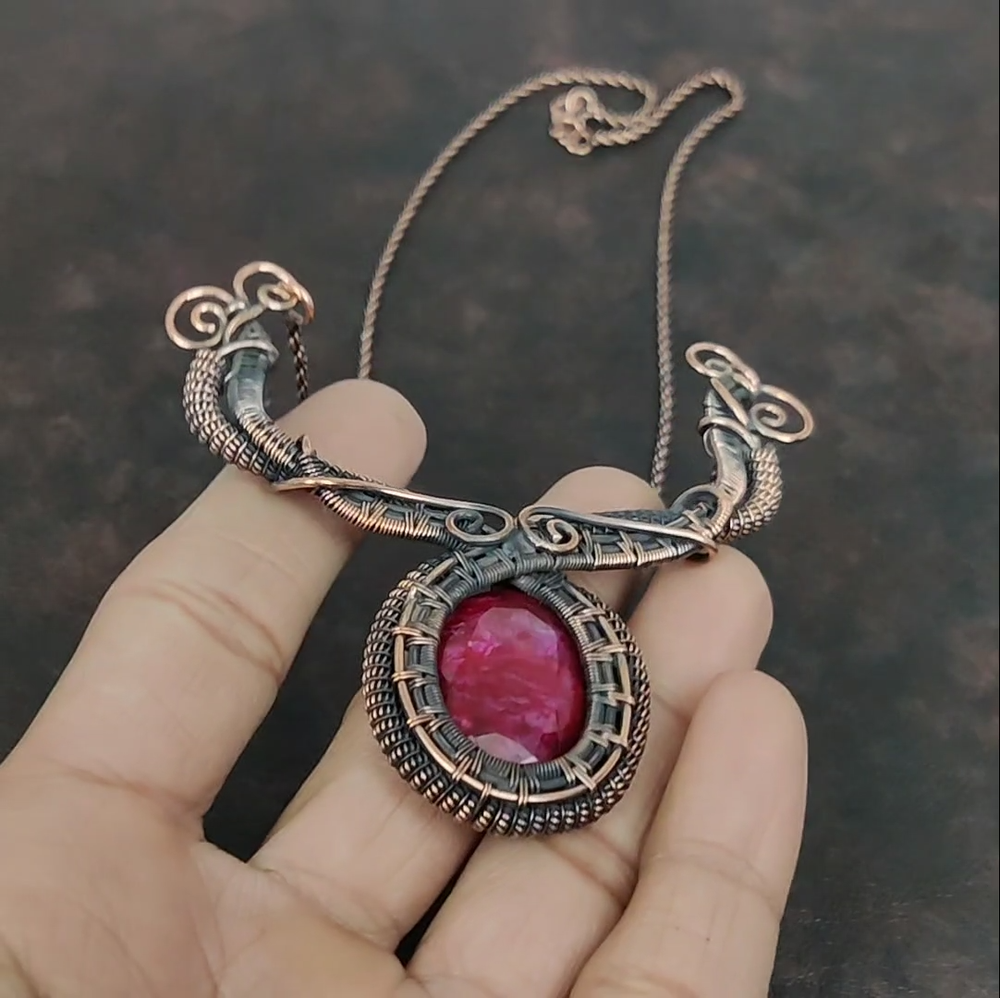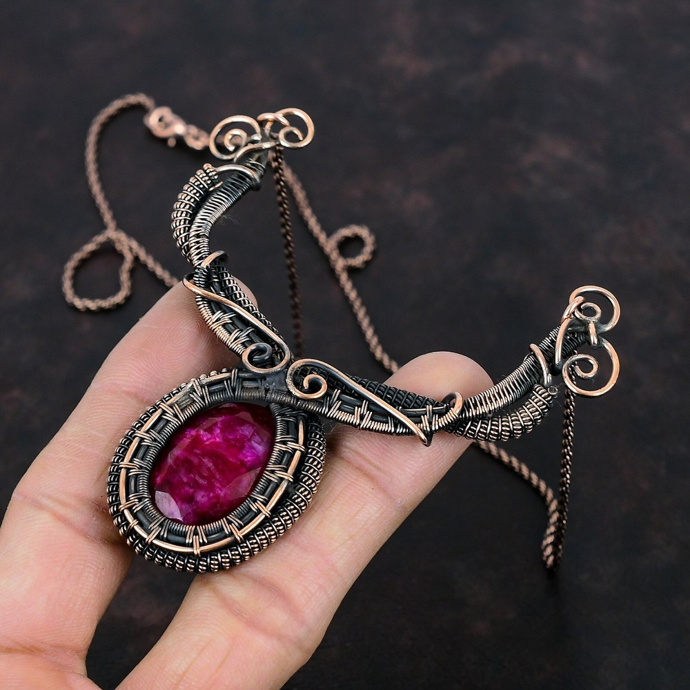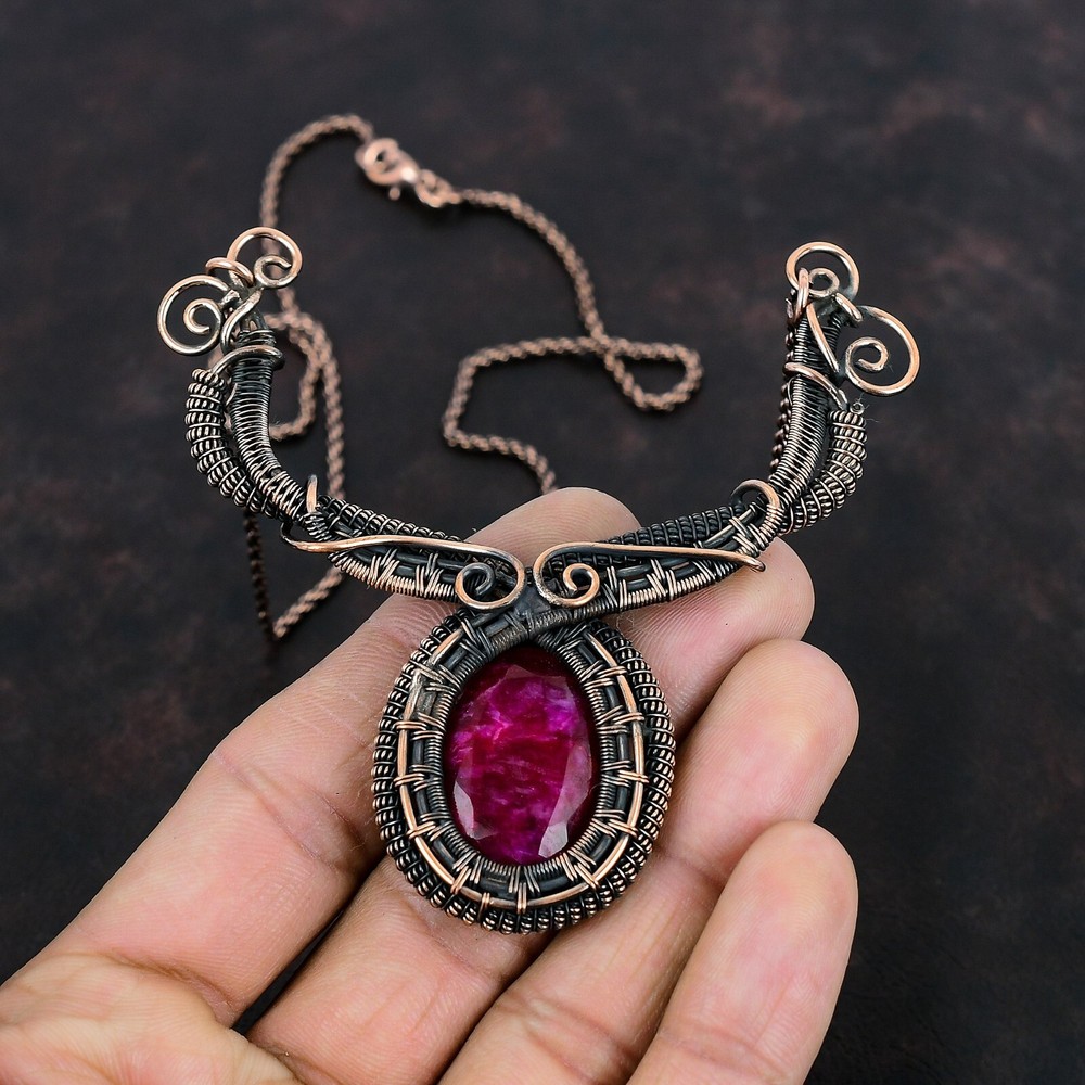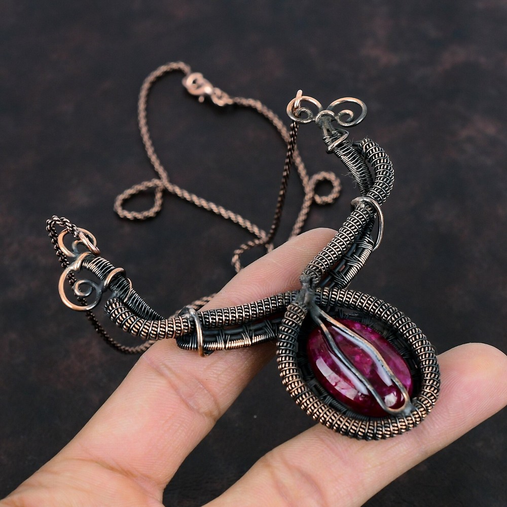 Note : Due to the natural formation of this gemstone. Slight variation in design and color are to be expected. Welcome to Silver Creation Mothers day Deal Natural Kashmir Rubi Artisan Wire Wrapped Chain Necklace Copper Handmade Necklace, Wire Wrapped Necklace, Wire Wrapped Jewelry, Copper Pendant, Copper Wire Necklace, Wrapped Jewelry, Wire Wrap Necklace, Wire Wrap Jewelry SKU : VFWN-312 Stone Shape : Oval Metal Purity : Unknown Copper Length : 18 Inches Width : Inches Copper has been used for jewelry making for thousands of years, dating back to ancient civilizations such as the Egyptians, Romans, and Aztecs. Copper was valued for its beauty, versatility, and durability, and was often used to make everything from jewelry and coins to cookware and tools. In addition to its historical significance, copper jewelry also offers several benefits. Copper is a natural conductor of heat and electricity, which makes it ideal for energy healing and therapeutic purposes. Wearing copper jewelry is believed to have various health benefits, such as improving circulation, reducing inflammation, and boosting the immune system. Some people also believe that copper jewelry has the ability to balance energy and improve mood. For Mother's Day Gift For Father's Day Gift For Promise For Valentine' Day For Halloween Party For Christmas Day Gift For New Year Party For Mom For Her If you can't find the information you need or need some advice for your design? Feel free to contact us. We are fast to reply :) All our work is made by hand with Love and Care in our workshop Thank you so much for visiting and hope you enjoy shopping with us Silvercreations is committed to delivering the best quality sterling silver jewelry to customers. As a handmade jewelry manufacturer, we offer an extensive selection of copper gemstone jewelry that showcases the brilliance of our craftsmanship. We are an experienced handmade jewelry supplier with expertise in embellishing gemstones to suit every style. We offer you the liberty to create your jewelry ensemble with sparkling, earthy, and pure gemstones. Our Talented artisans masterfully handcraft each piece of jewelry you see here. Our pieces are made with genuine gemstones.