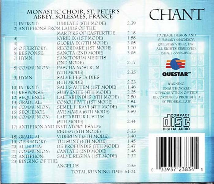 Buy more - save more 10% off 2, 15% off 3, 20% off 4 or more on all items. Buy more - save more 10% off 2, 15% off 3, 20% off 4 or more on all items. Click Here to add ChainMan Books and Music your Favorite Seller's List Credits Choir - Chœur Des Moines De L'Abbaye Saint-Pierre De Solesmes Directed By - Dom Jean Claire # Title/Songwriter Time 1 Introit: Jubilate (8th Mode) 2:39 2 Antiphons From Lands Of The Martyrs At Eastertide 2:18 3 Kyrie IX (1st Mode) 1:58 4 Gloria IX (7th Mode) 3:05 5 Offertory: Recordare (1st Mode) 1:10 6 Responsory: Sancta (2nd Mode) 3:05 7 Hymn: Sanctorum Meritis (2nd Mode) 2:17 8 Communion: Pascha Nostrum (7th Mode) 2:35 9 Hymn: Salve Festa Dies (4th Mode) 2:23 10 Introit: Salus Autem (1st Mode) 1:46 11 Responsory: Subvenite (4th Mode) 2:25 12 Sequence: Laetabundus (6th Mode) 2:50 13 Gradual: Concupivit (1st Mode) 2:54 14 Communion: Semel Iuravi (4th Mode) 3:50 15 Sequence: Ave Maria (6th Mode) 3:59 16 Communion: Laetabitur Iustus (5th Mode) 2:44 17 Antiphon And Invitatory Psalm: Regem (6th Mode) 5:33 18 Gradual: Viderunt (5th Mode) 3:40 19 Offertory: Tui Sunt (4th Mode) 1:45 20 Alleluia: De Profundis (7th Mode) 2:47 21 Communion: Cantate (2nd Mode) 2:48 22 Antiphon: Salve Regina (1st Mode) 2:32 23 Ringing Of The Angelus 2:35 To Top Copyright © ChainMan Books and Music 2014 - 2025 Powered by SixBit's eCommerce Solution