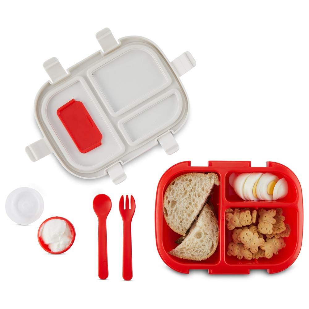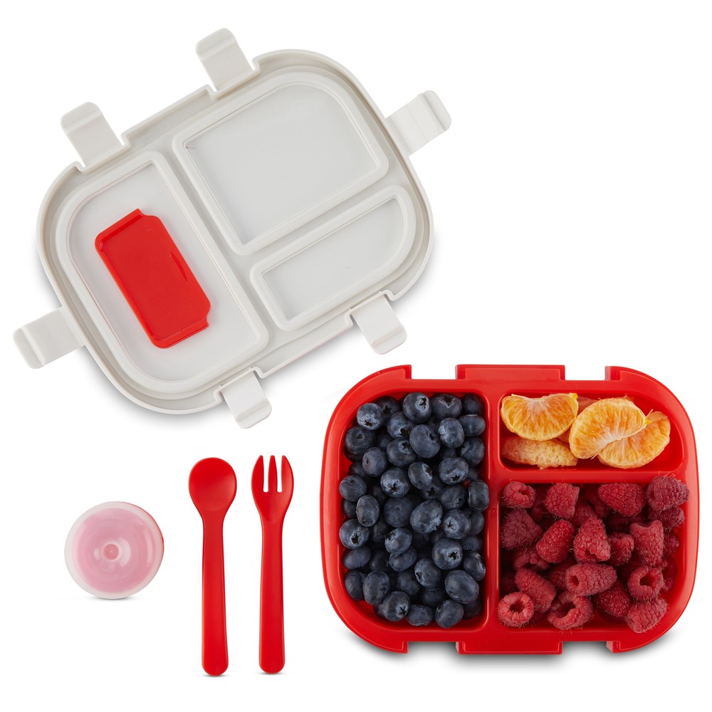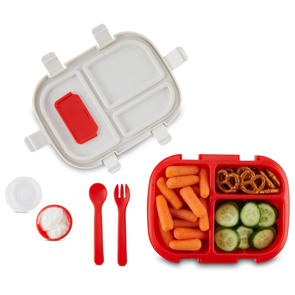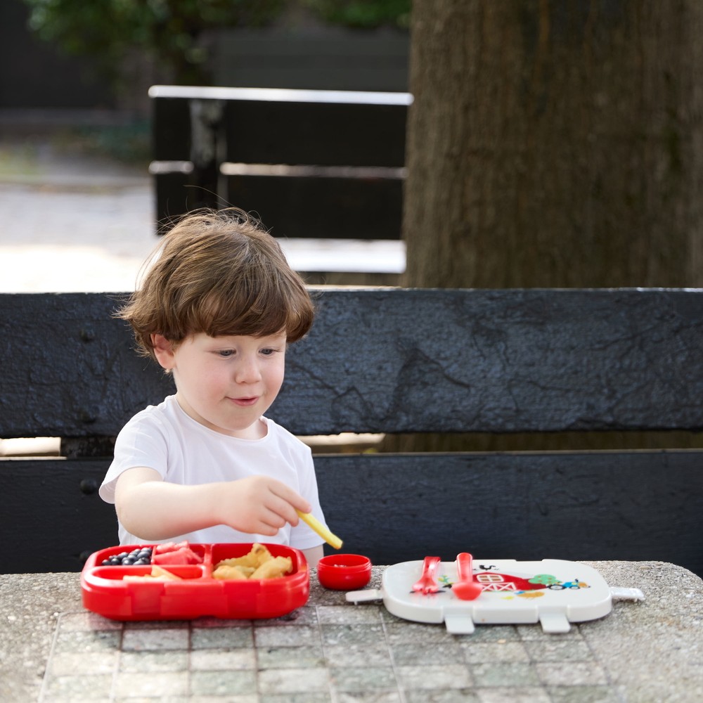 On-the-go meals and snacks are more fun for your little one with the Monbébé® Bento Lunch Box. A fork, spoon, and condiment jar are included, so your kiddo has everything they need when it’s time to eat. Go from 3 to 4 different-sized compartments with the removable divider. The lid features an adorable farm scene and fits snugly onto the bright red container with 6 kid-friendly latches, making it easy to open and secure. The silicone seal is airtight and leak-proof to keep food fresh and make transporting the bento lunch box mess-free. This bento lunch box is a reusable, more sustainable option that reduces the need for single-use plastic bags. Made of food-grade, BPA-free plastic, our bento box is easy to clean. Just separate the lid from the compartment container and hand wash or place it on the top rack of your dishwasher.