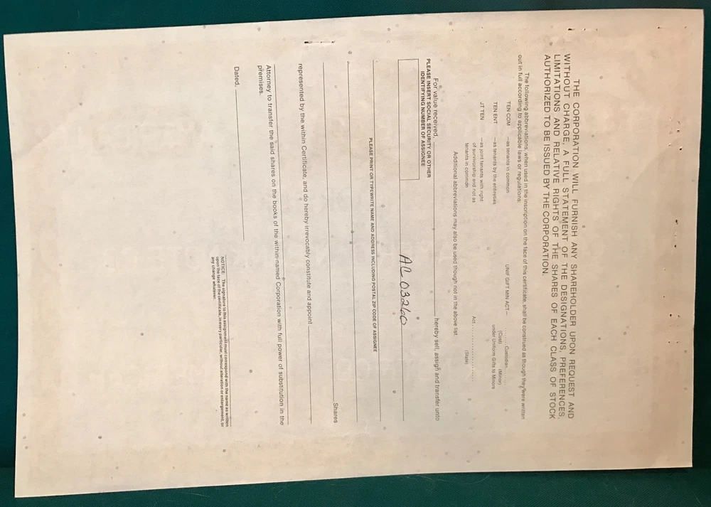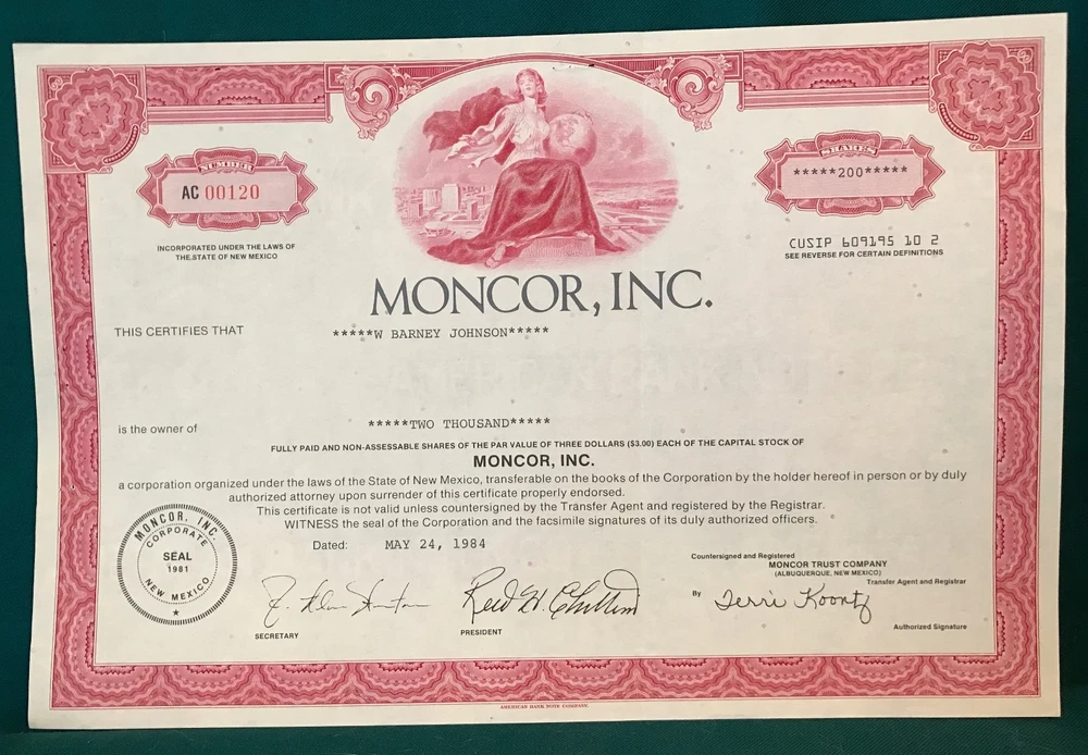 This beautiful stock certificate was issued by Moncor, Inc. of New Mexico for 2000 shares of company stock. The certificate is beautifully engraved by the American Bank Note Co. Moncor National Bank of Hobbs, N.M. started an aggressive loan program in 1981. By 1985 went sour because 'safe and sound lending practices were sacrificed in pursuit of rapid growth and the loan portfolio deteriorated. The loan practices finally exhausted the bank's capital,' federal banking officials said. The certificate has the usual light folds and staple holes, otherwise, in fine condition. Certificate measures roughly 12 inches by 8 inches. All items guaranteed authentic and original. Domestic First Class Mail shipping is $3.00. Please contact for international shipping costs. Shipping is gladly combined for multiple purchases. Please request an invoice before paying for multiple items. Good luck.