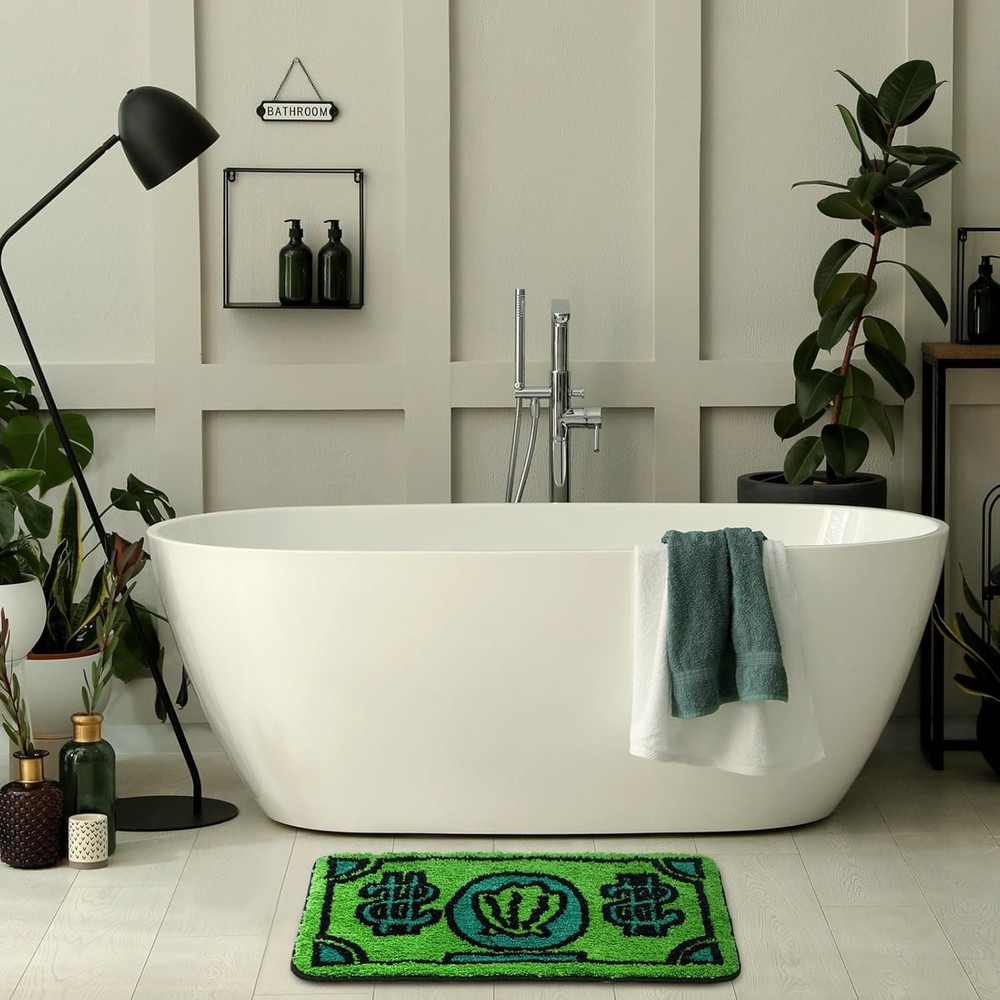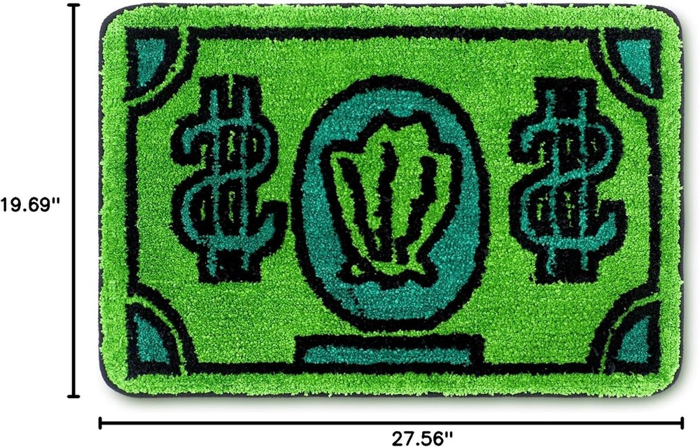 Money Bathroom Rug Gift Cute Bill Door Bath Mat for 2' x 1'2" (Heart), Green Product Details Brand: Drydiet Size: 2' x 1'2" (Heart) Material: polyester microfiber, PVC bottom lining Weave Type: Tufted Pile Height: Low Pile Construction Type: Machine Made Back Material Type: Polyvinyl Chloride Color: Green Indoor/Outdoor Usage: Indoor Theme: money Is Stain Resistant: No Product Care Instructions: Machine Wash Pattern: Cash Shape: Heart Special Feature: Washable Room Type: Bathroom Product Dimensions: 14"L x 24"W Rug Form Type: Bath Mat Style: Modern Occasion: Christmas Min. Required Door Width: 27.56 Inches Number of Pieces: 1 Water Resistance Level: Water Resistant Is Autographed: No Seasons: spring, autumn Age Range (Description): Adult Recommended Uses For Product: Bathroom, kitchen, bedroom, living room, doorway Item Weight: 1.83 pounds Manufacturer: Drydiet Country of Origin: China Firm and Comfortable: this money bath mat is made of quality polyester microfiber and PVC bottom lining that not only ensure its durability but also give a plush and cozy feeling under your feet which enhances your daily routine in the bathroom; The mat is not easy to shed fibers, long lasting and robust and is made up of 2 layers, namely a bottom anti slip layer and a fabric layer; It absorbs water rapidly, allowing your floor to dry and clean Anti Slip Bottom Lining: it features a PVC bottom lining, providing you with a secure footing and keeping the money shaped rug in its place; The bottom lining along with the fabric layer also helps in keeping your bathroom floor clean and dry quickly, avoiding the accidental slips or falls; Plus, the fiber height is about 1 inch long, soft and thick, can reduce foot tension and exhaustion Cute Bath Rug: the main color of this funky bathroom rug is green; The playful, money shape, the passionate green color make this rug a charming addition to your bathroom decor Easy Maintenance: this money rug is designed with ease of use and maintenance in mind; The materials applied allow for easy cleaning; After a simple machine wash cycle, it looks as good as fresh, saving you time and energy; You can choose to wash it with a mild cleaner, and there is no need to worry about fading Multifunctional Purposes: in addition to using as a green bath rug, you can place it in the kitchen, bedroom, living room, or even doorway; Its wide use makes this rug a good addition for your home