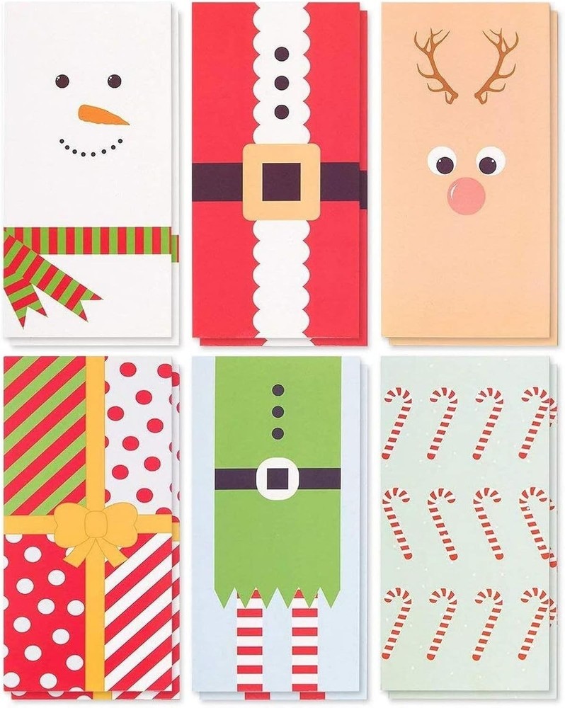 Money Envelopes for Cash Gifts - 36 Pack, x Inch, 6 Assorted Designs - Cash Gift Envelopes Festive Money Envelope: This 36-pack of Christmas money envelopes for cash gifts offers an elegant solution for holiday cash gifts with its beautifully crafted designs. Each Christmas money holder cards with envelopes ensure your monetary gifts are presented in a polished, sophisticated manner Charming Holiday Designs: Enjoy six unique holiday designs, including snowmen and candy canes, perfect for adding a personal touch to your festive money card gifts. These Christmas money card holders make your presents stand out under the Christmas tree Craftsmanship: Crafted from high quality cardstock, these money gift card holders offer durability and a sophisticated appearance. The Christmas cards with envelopes offer sturdy construction, ensuring they remain a stunning display throughout the festive season, enhancing any gift Thoughtful Presentation Options: Each money cards for cash is designed to securely hold cash or a gift card, making holiday gift-giving effortless and elegant. With 36 Christmas money card holders in this bulk set, you'll have ample options for every loved one on your list Versatile Gifting Solutions: These holiday cash gift envelopes are perfect for Christmas and various other occasions, offering a unique way to present your thoughtful gifts. Whether displayed on a mantle or included with a greeting card, they create a festive atmosphere