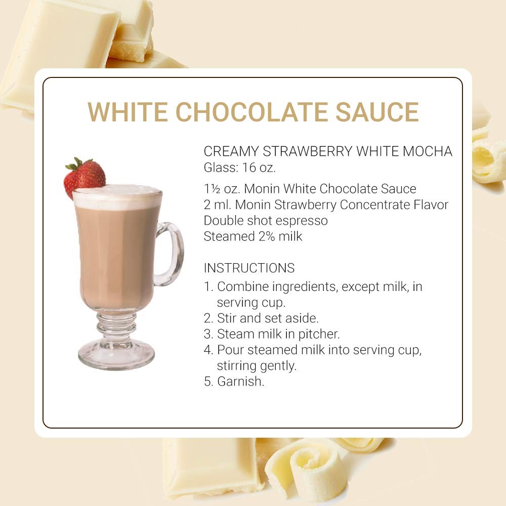 Monin - Gourmet White Chocolate Sauce, Creamy and 12 Fl Oz (Pack of 1) Description White Chocolate Mochas have never tasted so good, when made with this sweet and creamy gourmet sauce. The rich, buttery flavor of our White Chocolate Sauce is the perfect complement to premium espresso coffee drinks as well as other fruit and nut flavored beverages or desserts. Monin White Chocolate Sauce is the essential ingredient in any gourmet White Chocolate Mocha, and it also add delicious flavor to lattes, dessert cocktails and desserts. Features: GREAT FOR DESSERTS, COFFEE, AND SNACKS: The rich, buttery flavor of our White Chocolate Sauce is the perfect complement to premium espresso coffee drinks as well as other fruit and nut flavored beverages or desserts. TASTING NOTES: Light cocoa butter aroma and buttery, creamy white chocolate taste. White Chocolate Mochas have never tasted so good, when made with this sweet and creamy gourmet sauce. SPECIFICATIONS: Our Gourmet White Chocolate Sauces are always allergen free, gluten free, Kosher, contain no artificial colors, no artificial flavors, no artificial sweeteners, and are non-GMO. SYRUP TO SUPPORT BEE COLONIES: Colony Collapse Disorder is greatly reducing bee populations worldwide. Our syrup recycling initiative has been sending waste syrup to feed bees since 2008, and has fed over 374 billion bees! GREEN PACKAGING & LABELING: With BPA free bottles, 100% recyclable boxes comprised of 30% recycled content, printed with biodegradable water-based ink containing zero pollutants, and pulp inserts, we’re doing our part for the environment. Product Details: Is Discontinued By Manufacturer : No Package Dimensions : 6.3 x 2.4 x 2.4 inches; 12 ounces Item model number : M-KC063B Manufacturer : Monin Units : 12 Fluid Ounces Brand: Monin Flavor: White Chocolate Unit Count: 12 Fluid Ounces Number of Items: 1 Package Information: Bottle Handling We will ship all orders within 1 business day of payment. Delivery We Do Not Ship Outside of the Continental US. Return Policy All items qualify for returns within 30 days of receipt. Buyer is responsible for return shipping on any item that is not damaged. Feedback We take our reputation seriously, we buy and sell online, so we understand the value of trust. If you are unsatisfied with your order, please contact us and we will work with you to resolve it to your satisfaction.