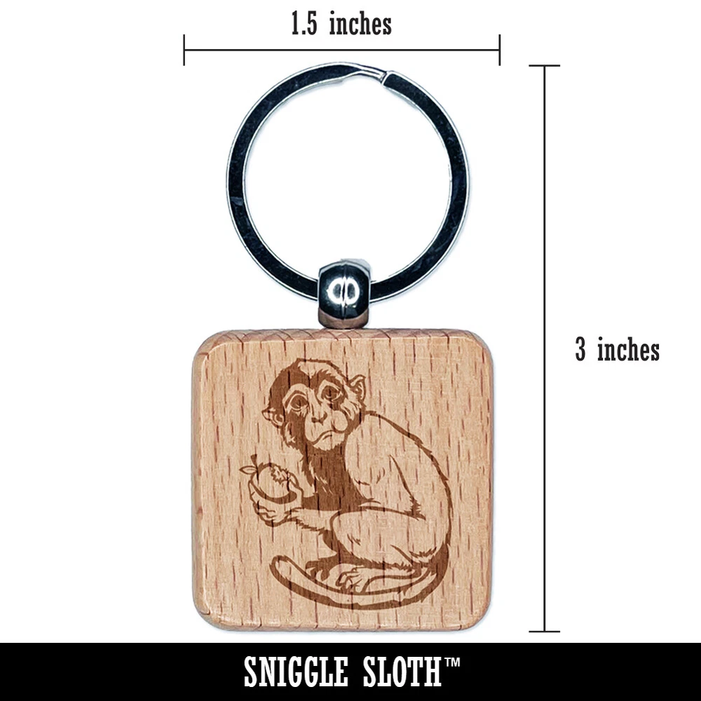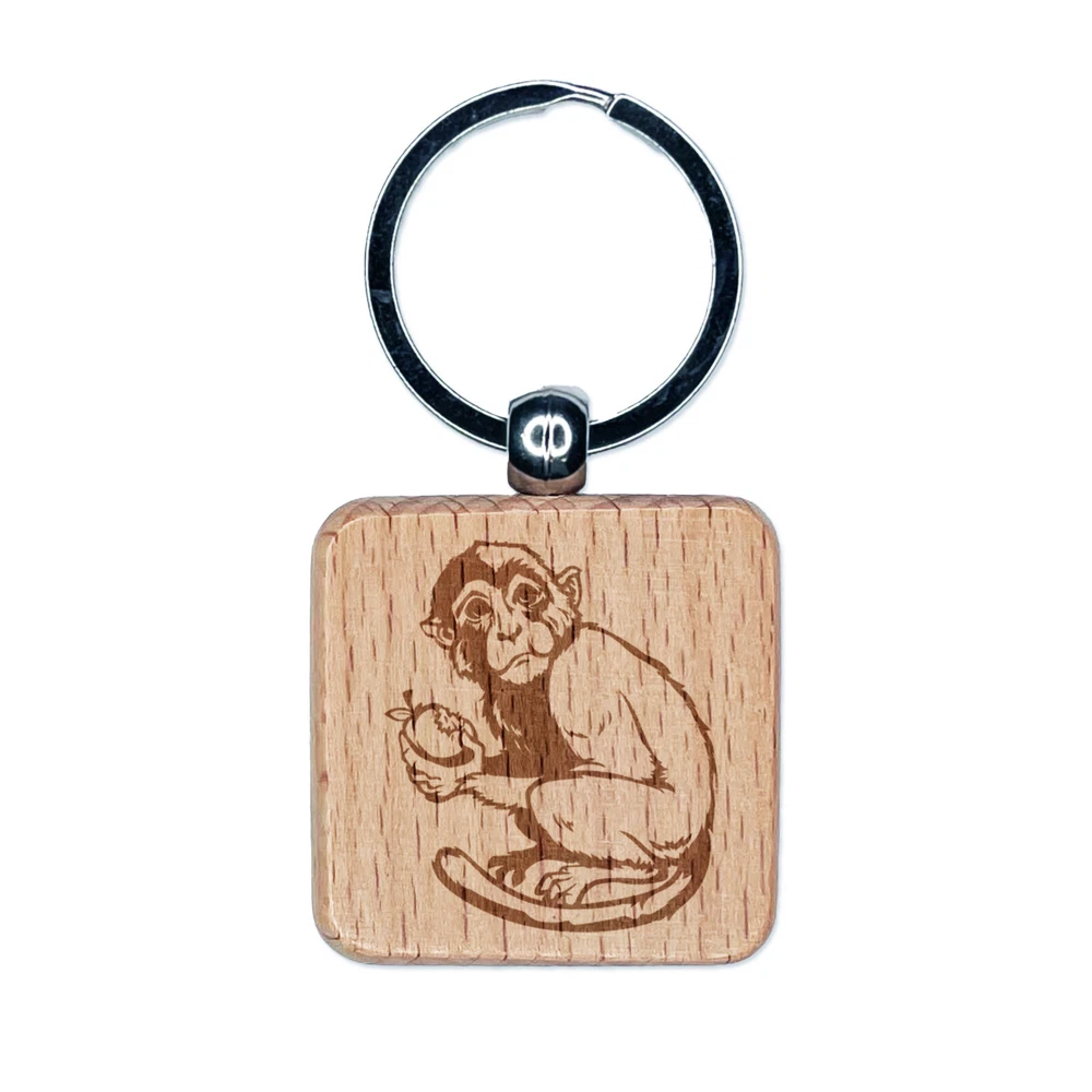 Monkey Eating Fruit Engraved Wood Square Keychain Tag Charm