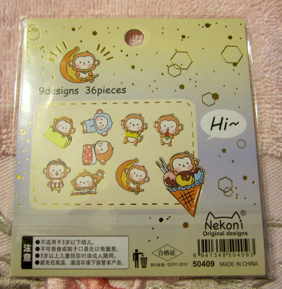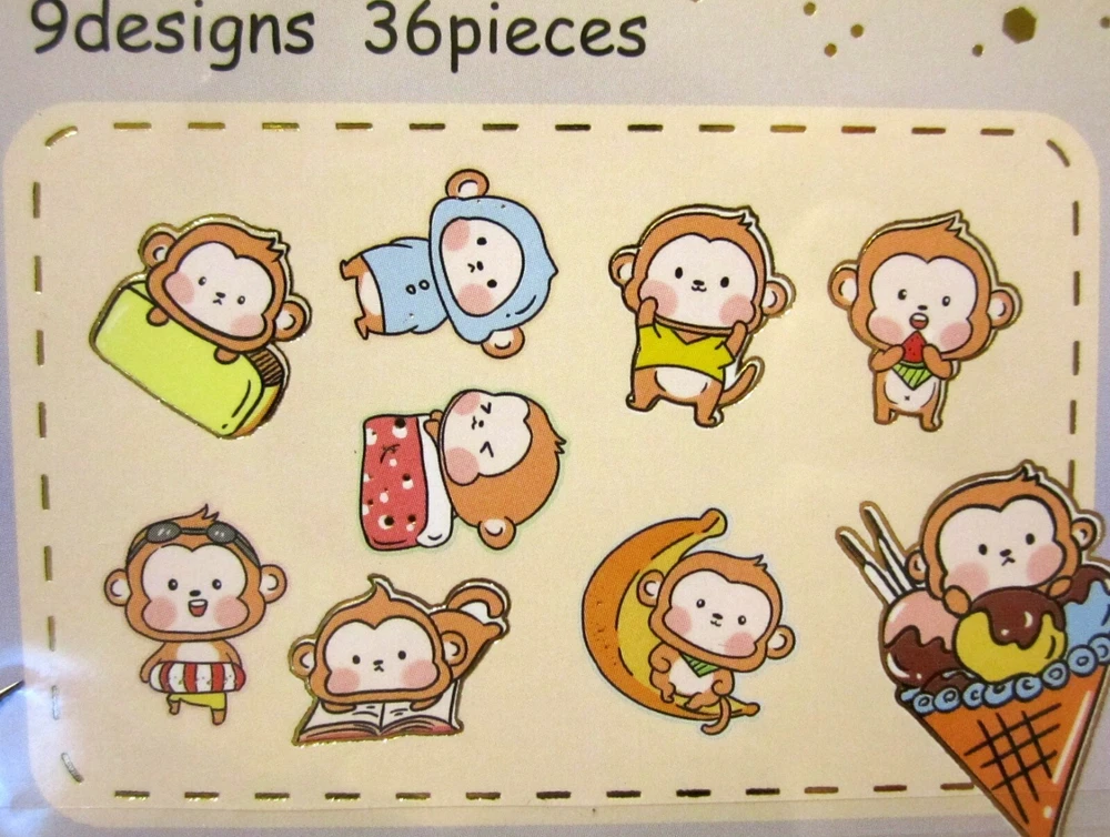 DETAILS This listing is for a pack of adorable kawaii monkey stickers containing approx. 36 pieces. The stickers range in size, the average being approx. 1 inch. They are paper stickers with a gold trim. If you have any questions, please ask! FEEDBACK POLICY DUE TO A LARGE NUMBER OF BUYERS THAT NEVER RETURN FEEDBACK...I WILL ONLY GIVE IT AFTER THE BUYER DOES. WHEN THE BUYER RECEIVES THEIR ITEM AND LEAVES ME POSITIVE FEEDBACK, I PROMISE TO RETURN THE FEEDBACK TO THEM. SOMETIMES IT TAKES ME A FEW DAYS BUT I WILL GET IT TO YOU!! IF THE BUYER IS NOT HAPPY WITH SOMETHING I ASK THEM TO PLEASE CONTACT ME BEFORE LEAVING FEEDBACK AND GIVE ME THE FAIR CHANCE TO MAKE THINGS RIGHT!! I HOPE THAT MY BUYERS WILL UNDERSTAND AND I THANK YOU!! Ask any question that you may have. If you are not happy with this item when you receive it.... please contact us instead of leaving a negative feedback. We are always willing to work anything out. Our customers come first and we want them to be happy. We always promise excellent customer service. A happy customer comes back!! We stand 100% behind our products and 100% guarantee all of them!!