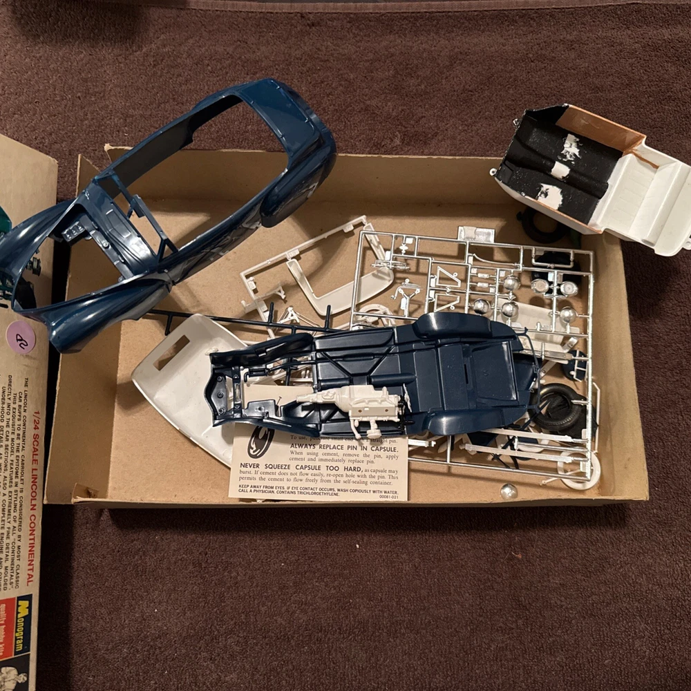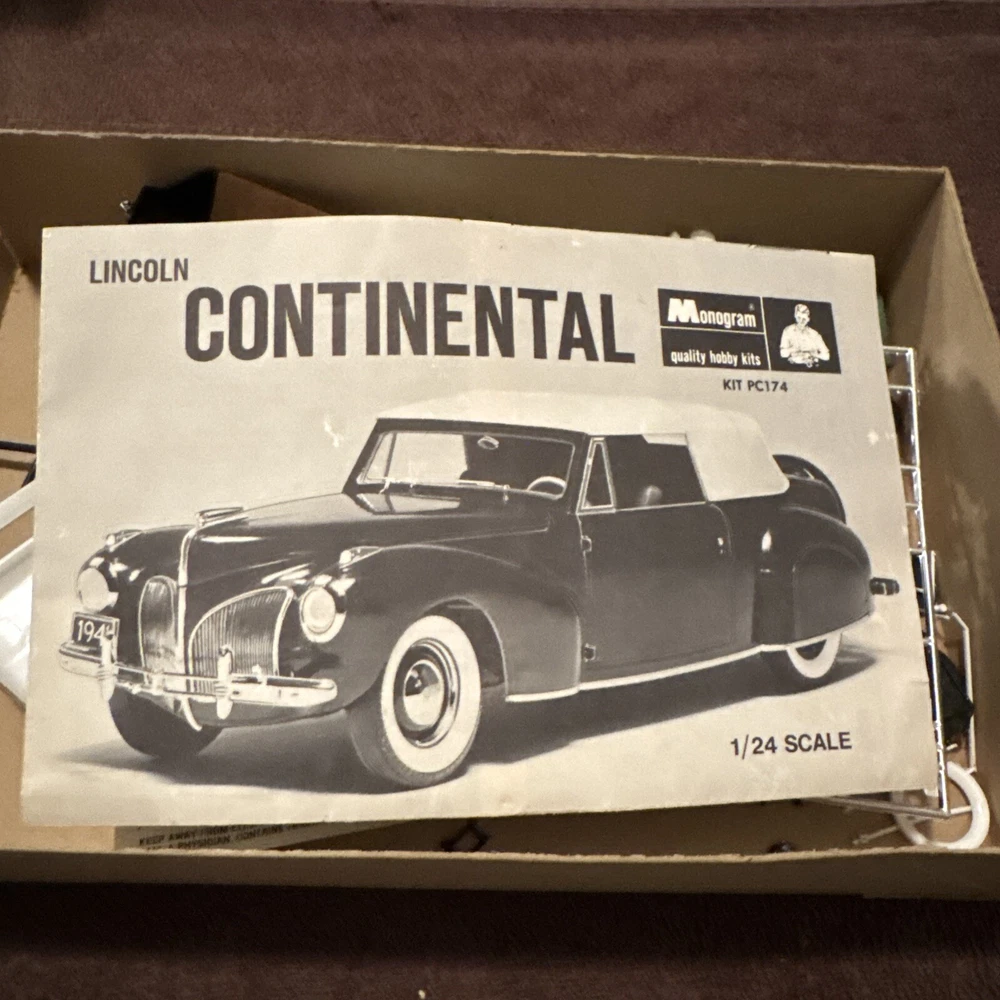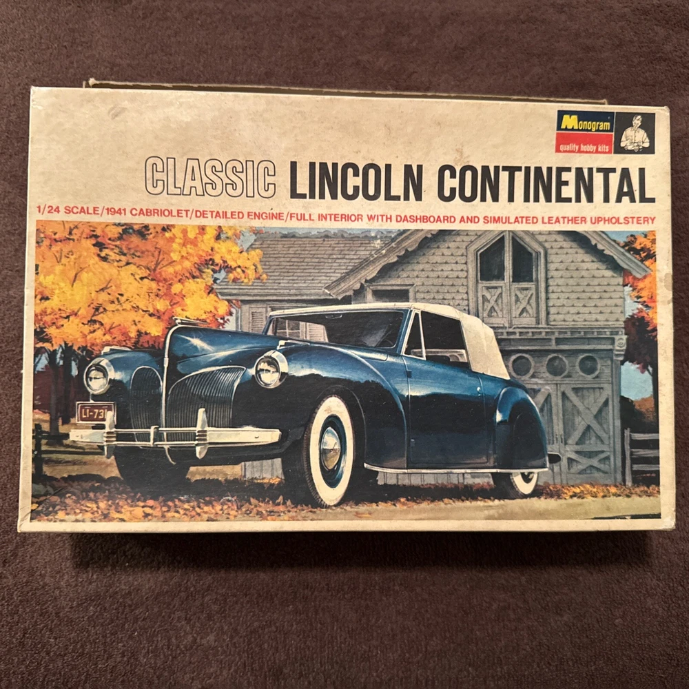 The Monogram Classic Lincoln Continental model kit in 1:24 scale is a vintage unassembled kit from 1967. Made of plastic in the United States, it includes parts to build a model car. This kit is a collectible item perfect for car enthusiasts. Car is partially built. For parts.