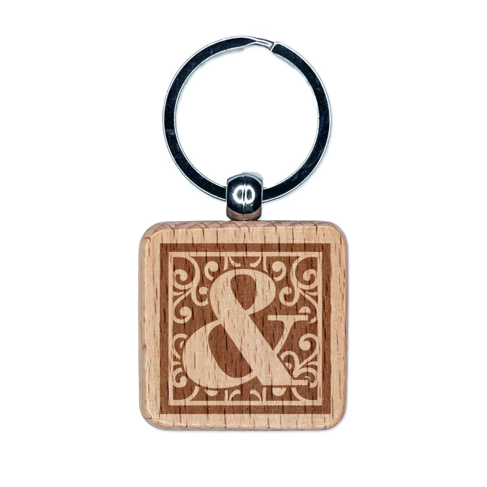 Monogram Swirls Ampersand Engraved Wood Square Keychain Tag Charm