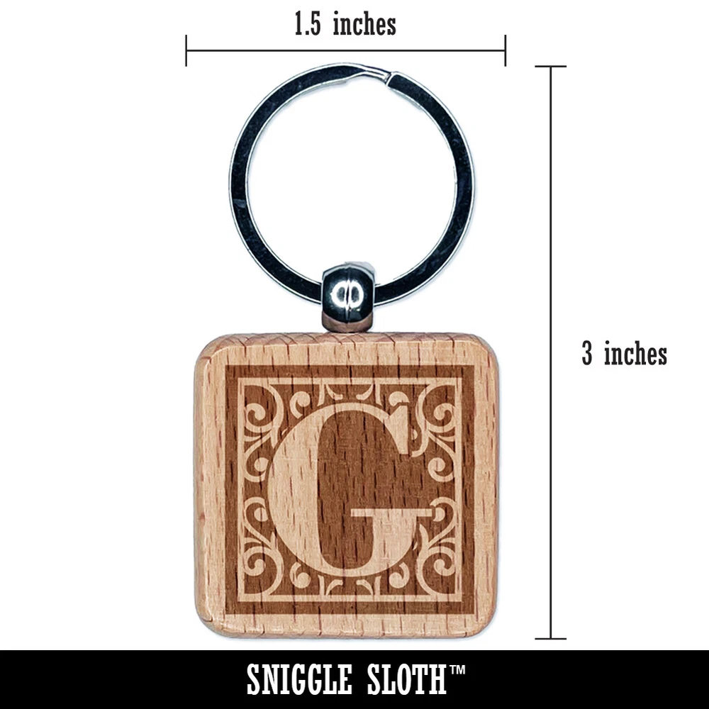 Monogram Swirls Capital Letter G Engraved Wood Square Keychain Tag Charm