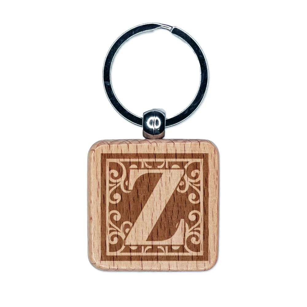 Monogram Swirls Capital Letter Z Engraved Wood Square Keychain Tag Charm