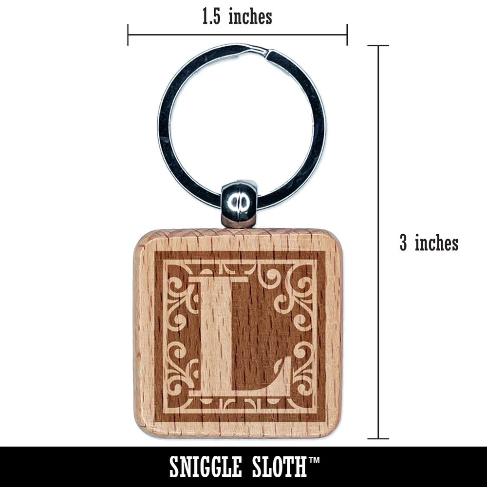 Monograma remolinos letra mayúscula L grabado madera cuadrado llavero etiqueta dije