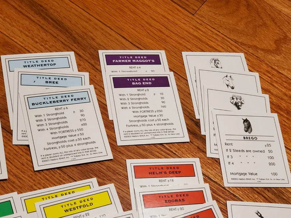 Brand:Parker BrothersGame Type:Board GameModified Item:NoGame Title:MonopolyTheme:FinanceGender:Boys & GirlsType:property cardsUPC:Does not applyAge Level:8-11 Years, 12-16 YearsNon-Domestic Product:Nogtin13:Does not applyRecommended Age Range:8+Custom Bundle:NoMin. Number of Players:2+Character Family:Lord of the RingsTitle:MonopolyYear:2003