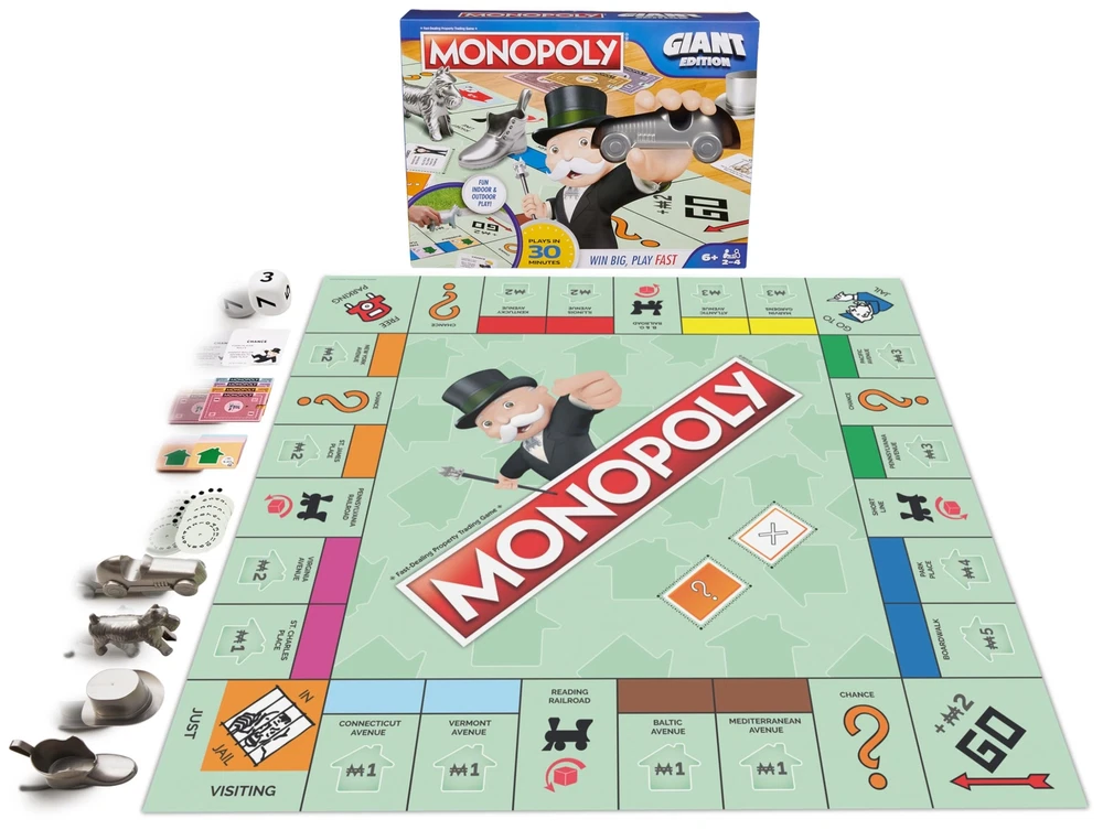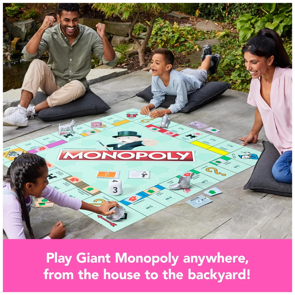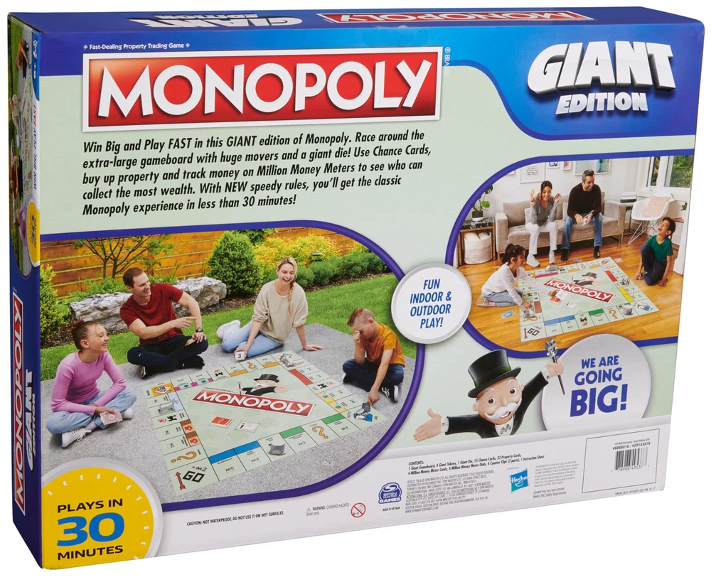 Trading property has never been more fun in the giant version of this iconic Hasbro board game. This classic Monopoly board game made big is perfect for an indoor and outdoor game. The rules to play this fun game are slightly different than the original game. Roll the Giant Die and move your Giant Token that number of spaces on the Giant Gameboard. If you land on an empty property space, you MUST buy it. Mark the space with the green side of your Property Card. When another player lands on the space, they pay you the amount with their Million Money Meter. The player with the most wealth at the end of the game wins! With these new speedy rules, you’ll get the classic Monopoly experience in less than 30 minutes! Find your newest favorite board game, beach games, & games for camp, plus amazing 12 year old girl gifts, 13 year old girl gifts & trending gifts for teens now. more board games for family night, games for 8-12, children's games, family games for and adults, board games for 5-7 year olds, family board games & more to make big fun family memories with Spin Master! GIANT SIZED & EXTRA FUN: Race around the extra-large Monopoly gameboard with huge movers and a giant die It’s simple, active gameplay in the GIANT version of the fast-dealing property trading game WIN BIG & PLAY FAST: Use Chance Cards, buy up property, and track money on Million Money Meters to see who can collect the most wealth. With NEW speedy rules, you’ll get the classic Monopoly experience in less than 30 minutes PLAY INDOORS OR OUTSIDE: You can play Giant Monopoly in the house, at school or in the park For 2-4 players, this board game made big is perfect for parties and yard games FAMILY GAME NIGHT: Make memories with board games for 4-6, board games for 6-8 & board games for 8-12 Take the fun outside with camping games & outdoor games for adults and family SPIN MASTER TOYS & GAMES: Looking for games, yard games & card games for grown ups, or teen? everything from family game night, travel games, puzzles for adults & family games Includes 1 Giant Gameboard, 4 Giant Tokens, 1 Giant Die, 15 Chance Cards, 32 Property Cards, 4 Million Money Meter Cards, 4 Million Money Meter Dials, 4 Counter Clips (2 parts), 1 Instruction Covered by the Spin Master Care Commitment. See below for full details