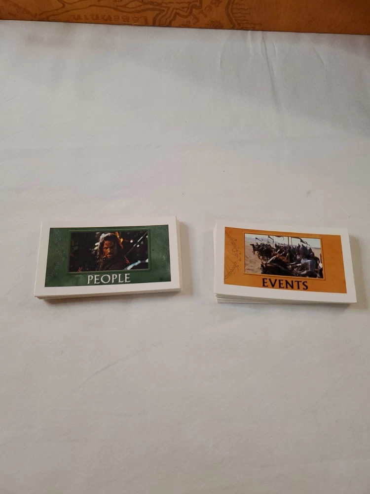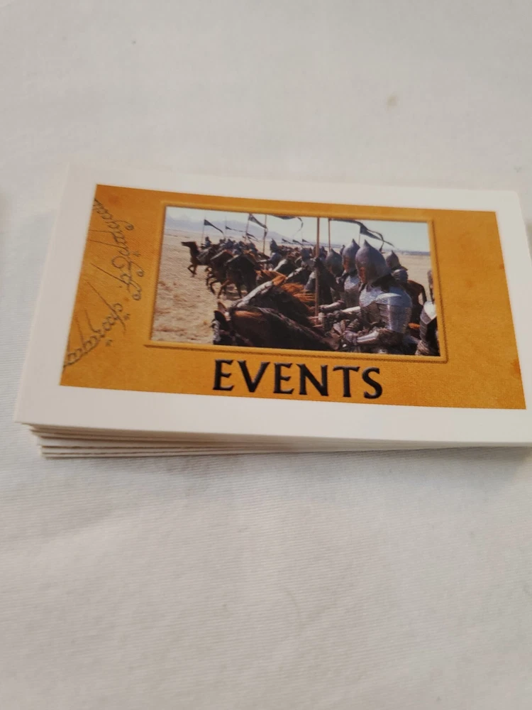 Replacement EVENTS and PEOPLE Cards for the Lord of the Rings Trilogy Edition. This set includes 15 PEOPLE CARDS 16 EVENTS CARDS WILL SHIP IN A STURDY BOX. WE WILL COMBINE SHIPPING ON MULTIPLE ITEMS IF POSSIBLE. PLEASE CHECK OUT OUR OTHER ITEMS. THANKS FOR LOOKING. We ship 6 days a week. Most shipping is done with 24 business hour. We strive for excellent customer service.