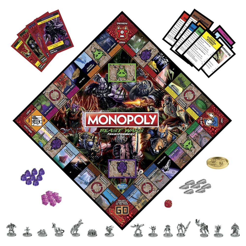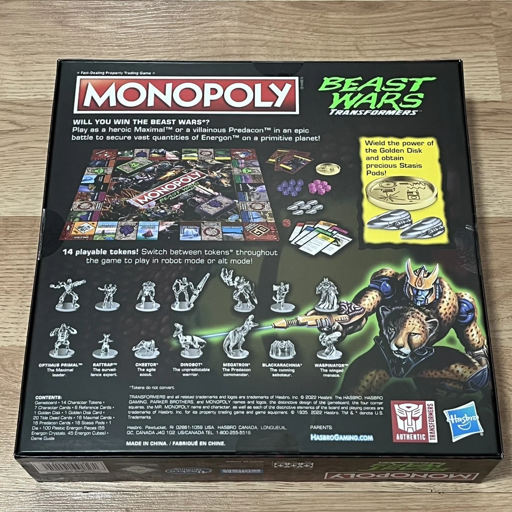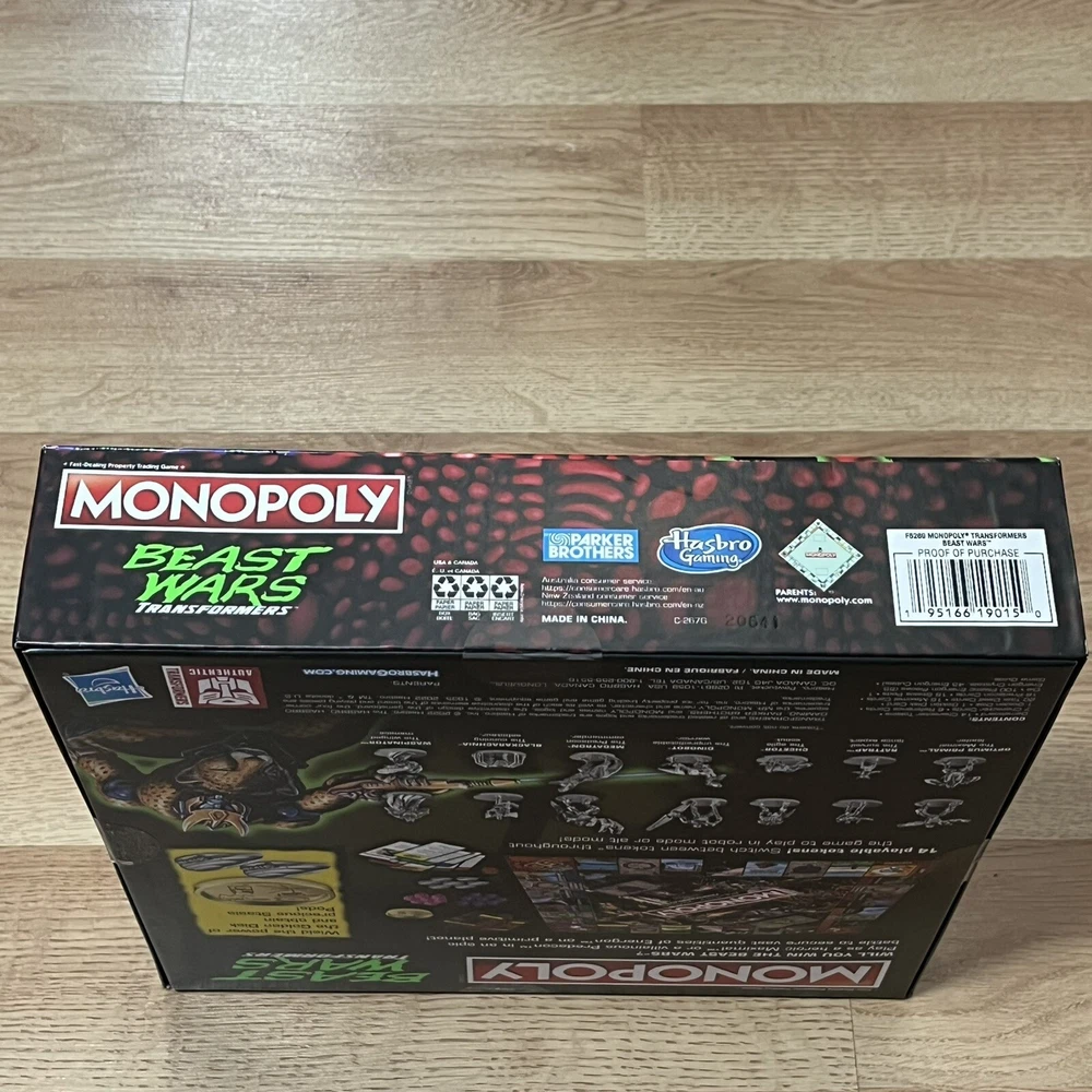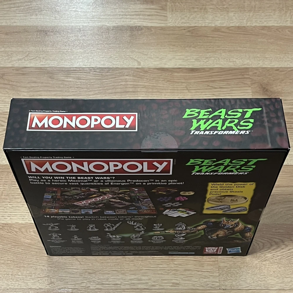 Monopoly Transformers Beast Wars Trading Board Game 14 Tokens Brand New Sealed. Condition is New. Shipped with USPS Ground Advantage. It’s Maximals vs. Predacons in a battle for the Golden Disk! The Monopoly: Transformers Beast Wars Edition board game for kids ages 8 and up is a must for Transformers fans. This 2-6 player game features gameplay inspired by the Transformers universe and iconic Transformers artwork. Race to take control of key locations and powerful spaceships, obtain Stasis Pods, and wield the Golden Disk! Properties include Bio-Dome, The Ark, and Floating Mountain, and instead of houses and hotels, this edition features Energon cubes and Energon crystals. The player with the most Energon wins the game! Includes gameboard, 14 character tokens, 7 character cards, 6 reference cards, 1 Golden Disk, 1 Golden Disk card, 20 Title Deed cards, 16 Maximal cards, 16 Predacon cards, 16 Stasis Pods, 1 die, 100 plastic Energon pieces (55 Energon Crystals, 45 Energon Cubes) and game guide. CELEBRATE 25 YEARS OF TRANSFORMERS BEAST WARS: This Monopoly: Transformers Beast Wars Edition game is a must-have collector’s edition with Transformers-themed gameboard, cards, and gameplay COLLECT PROPERTIES INSPIRED BY TRANSFORMERS: Players move around the board trying to take over locations around the Ancient planet using Energon, then installing Statis pods to charge more rent INCLUDES 14 ZINC TOKENS: Play as a favorite Transformers character in robot mode or alt mode -- players must swap modes throughout the game (Monopoly tokens do not convert.) BATTLE FOR THE GOLDEN DISK: In this Monopoly board game for Transformers fans, claim the Golden Disk for gameplay perks but watch out … another player can steal it at any moment PLAYER WITH THE MOST ENERGON WINS: This 2-6 player board game for kids ages 8 and up is an epic battle to secure vast quantities of Energon on a primitive planet