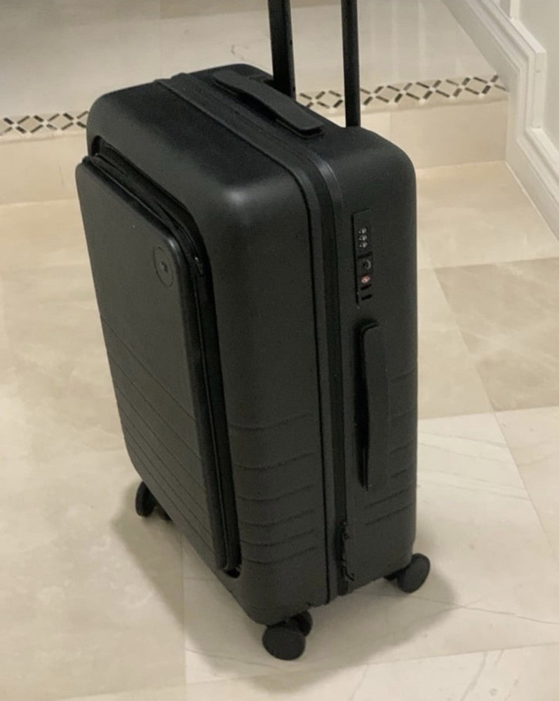 Monos 23-Inch Pro Plus Spinner Luggage This bag must be checked during air travel. Measurements include wheel and fixed handles. 23"H x 15"W x 9½"D. 8.38 lb. Pre owned in good condition. There are some minor scratches and spots, please see pictures.