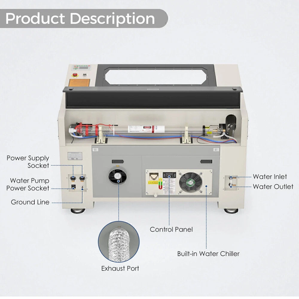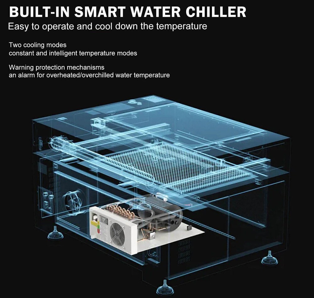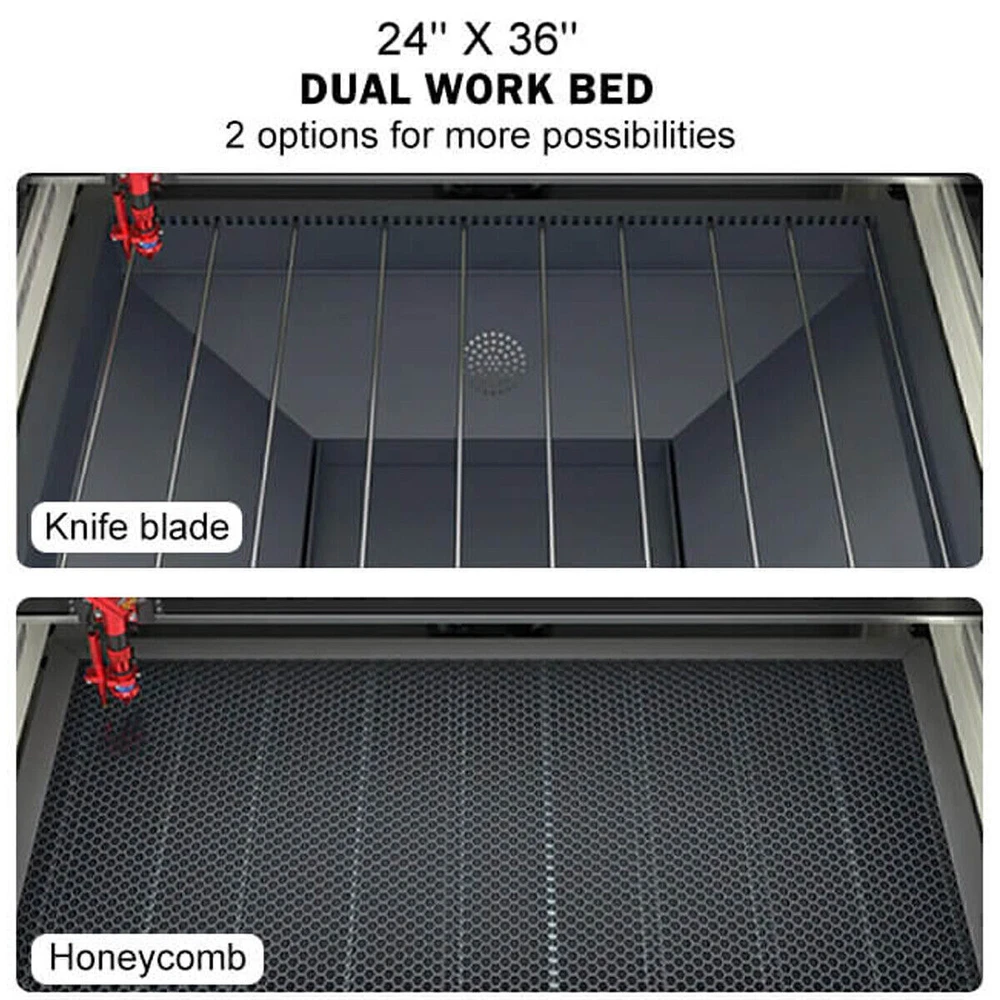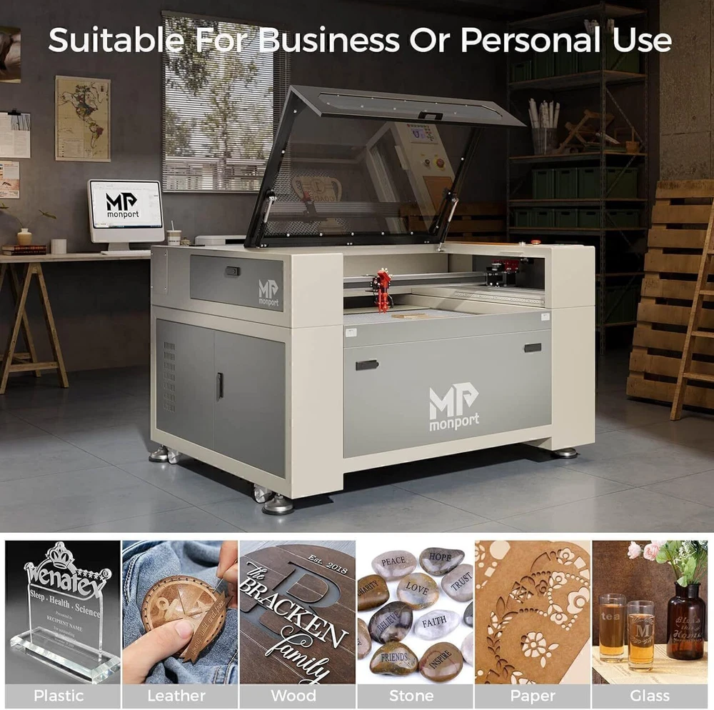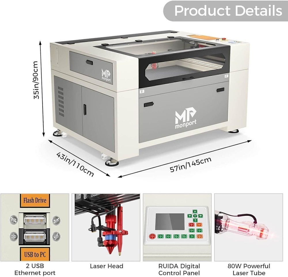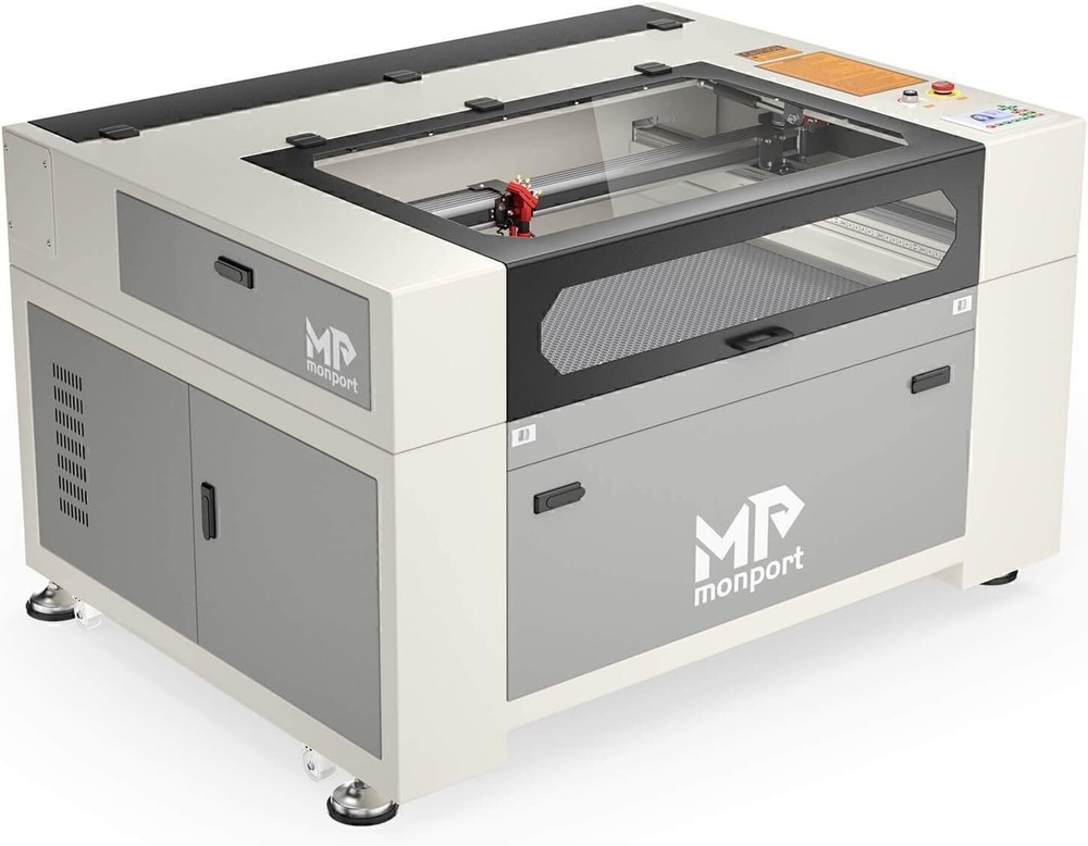 Monport 90W 36x24 Autofocus CO2 Laser Engraver Cutter Built-in Smart Chiller New Official Monport Upgraded 90W CO2 Laser Engraver&Cutter Built in Water Chiller, 24x36 Larger Working Area with Autofocus&Autolift, Digital Controls, Red Dot Pointer for Marker Wood Acrylic Glass More US STOCK CE & FDA Specification ⭐️ Dimension & Specifications Working Dimension: 24"x 40" ( 60 cm x 100 cm ) Pass-through Dimension:2.9'' x 43''(7.5cm x 109.5 cm ) Machine Dimension: 61'' x 43'' x 35'' ( 155cm x 110cm x 90cm) Max Engraving Speed: 800mm/s Max Cutting Speed: 30mm/s ( actual speed depends on material ) Max Engraving Depth: 19.05mm Min Engraving Depth : 0.01 mm Focal Lens Diameter: 18mm Mirror Diameter: 25mm Max Z-depth: 7" Package Dimension: 67.7" x 48.4" x 43.7" ( 172 cm x 123 cm x 111 cm ) Net Weight: 639.3 lbs ( 290 kg ) ⭐️ Material Capability Can safely engrave or cut any laser-compatible material Wood, glass, acrylic, fabric, leather, paper, cardboard, rubber Contact us with questions on specific materials not listed. If necessary, we can test it for you ⭐️ Software Works on Windows XP, 2000, Vista, WIN 7, 8, 10 & 11, both 64 & 32 bit MacOS (Version 10.11 and higher) ONLY with LightBurn software Compatible with Lightburn, RDWorks, Coreldraw, Auto-CAD Supported image formats: BMP, HPGL, GIF, JPG, JPEG, DXF, DST, AI and others ⭐️ Laser System Laser Wavelength 10640 nm; Rated at over 90 watt; Recommended engraving speed: 100 - 500mm/s Recommended cutting speed: 1 - 30mm/s (actual speed depends on the thickness of material) ⭐️ Mechanics Linear System — Enclosed aeronautical aluminum rails Motion — Equipped with stepper X, Y, Z axis, plus mechanical limit switches Cooling — Built-in 4L water chiller with two operating modes Air Assist — Built-in air assist with no external compressor required Ventilation — On-board exhaust fan, as well as an exhaust hose so you can vent the fumes to the outdoors Standard 110V , AC power connection 4-pin port connection for rotary axis devices Temperature-- Recommended Operating Temperature: 60-104 °F (16C-40C). Attention: the CO2 water temperature must be maintained at 60-70°F (16-21°C) Monport 90W Benefits ⭐️【FIREPROOF VIEWING WINDOW】 This viewing window is made from special fire-resistant polyester with iron frames. The melting point of this polyester ranges from 432° to 488° and the ignition temperature of it is over 1000°, which can dramatically decrease the possibility of fire accidents caused by the heat of laser burning the materials. ⭐️【BUILT-IN SMART WATER CHILLER 】 The built-in 3L water chiller is easy to operate and cools down the temperature without any other machines. To meet different needs, there are two cooling modes, constant and intelligent temperature modes. This professional water chiller has multiple warning protection mechanisms such as an alarm for ambient temperature, an alarm for overheated/overchilled water temperature, and so on. When the alarm occurs, the display will alternate between the water temperature and the error. ⭐️【ENCLOSED AERONAUTICAL ALUMINUM RAIL】 Equipped with X and Y stepper motors, this rail features efficient power transmission with high precision. The enclosed rail is designed to avoid smoke and debris and prolong the service time of rail units. ⭐️【LASER PROTECTIVE GLASSES FOR FREE】 Lasers emit radiation in the invisible form of light. This pair of laser protective glasses is certified to protect your eyes against radiation damage by looking at the class 4 laser in any way (directly, indirectly, or even looking at the laser dot on a surface can damage your eyes). ⭐️【RUIDA DIGITAL CONTROLLER】 Whether your chosen software is LightBurn, RDworks, AutoCAD, or CorelDRAW, this Ruida digital controller can support the given platform. The Ruida Controller with a digital display can control the laser head, start or stop projects, adjust laser power and speed settings and so on. 90W CO2 Engraver Features ⭐️ High Speed and Resolution The Engraving Speed is up to 800 mm/s; The Cutting Speed is up to 400 mm/s; The Resolution is up to 4500 dpi; 3 LED light strips above the work bed provide illumination for precision; 2.0" Focal distance provides high resolution and etching of tiny fonts ⭐️ Autofocus Use the control panel to correct the focus automatically at the touch of a button — no more manual testing and adjustment. ⭐️ Built-in Air Assist A built-in air assist system guides a pressurized air stream through the laser head nozzle to displace debris, heat, and combustible gases from the engraving surface and laser beam path, keeping engravings more precise. ⭐️ 3-ways to Connect with PC End Two USB ports provide options including flash drive connectivity and a USB-to-USB PC connection. In addition, one ethernet port is also available for connection. ⭐️ Red Dot Guidance The red dot shows the laser head position, marks the working path and frames the project sizes, assisting you with more convenience and guidance. ⭐️ Automatic Safety Sensor The safety shutdown sensor helps stopping the machine even if the window cover is on. Once closed, press the “Enter" button to continue operation. COMPATIBLE COMPUTER SYSTEMS ADVANCED FEATURES Buitl-in Smart Water Chiller The built-in 3L water chiller is easy to operate and cools down the temperature without any other machines. More space-saving and convenient Ruida Control Panel The RUIDA Motherboard and intuitive RD Control System is easy to use and offers advanced capabilities. Compatible with third party software like LightBurn and AutoCAD. Enclosed Aeronautical Aluminum Rail & Autofocus The enclosed rail is designed to avoid smoke and debris and prolong the service time of rail units. Use the control panel to correct the focus automatically at the touch of a button — no more manual testing and adjustment. Autolift Platform Raise or lower the workbed easily using the control panel's Up & Dow