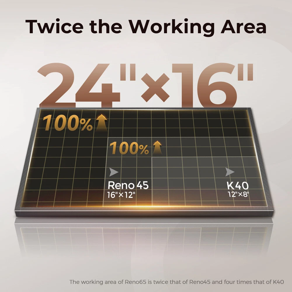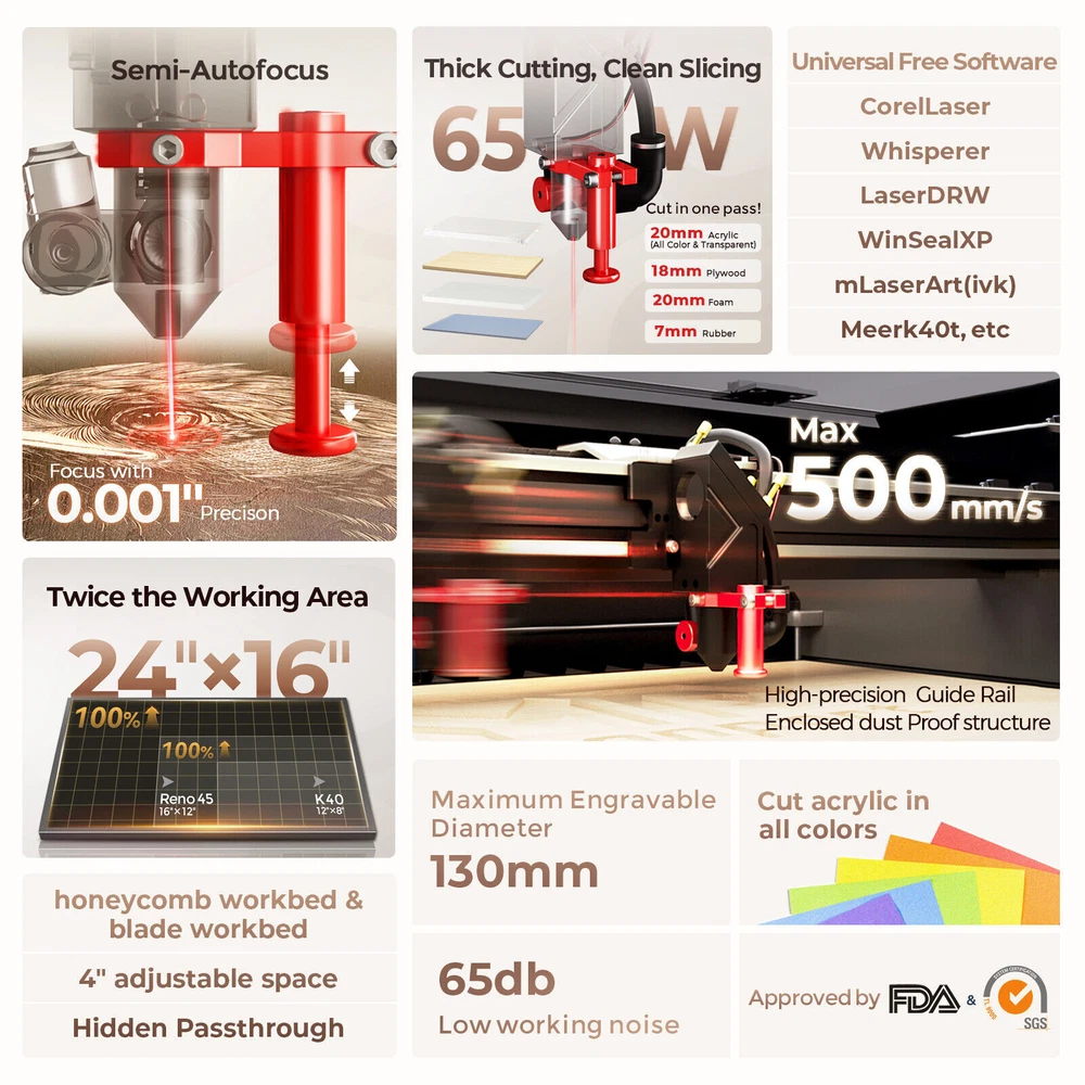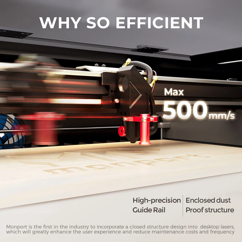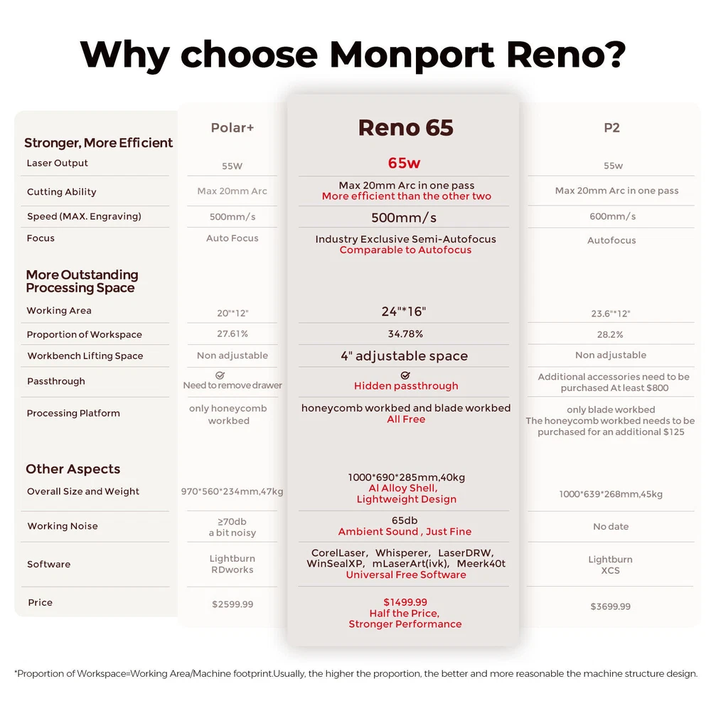Monport Reno65 65W Desktop CO2 Laser Engraver Cutter (24" X 16") Semi-Autofocus New Official Monport Reno65 65W Desktop CO2 Laser Engraver & Cutter (24" X 16") with Brand New Semi-Autofocus Dimension & Specifications Working Dimension: 600 x 400mm Machine Dimension: 1000 x 690 x 285mm Product Weight:64kg Z-Axis Movement: 4''(100mm) Max. Engraving Speed: 500mm/s(19.7ips) Focus: Semi-Autofocus Compatible Software: CorelLaser, Whisperer, LaserDRW, WinSealXP, mLaserArt(ivk), Meerk40t Compatible Material: Rubber, acrylic, coated metal, tin, special steel, anodized aluminum, cork, cardboard, glass, leather, marble, plastics, wood and more Reno65 CO2 Laser Features 【REVOLUTIONARY BRAND-NEW LASER CUTTER & ENGRAVER】 It took 18 months for Monport to develop the Reno series products, which are suitable for most enthusiasts and professionals.Referring to the shortcomings of desktop product in the market, Monport continuously innovates and improves products , ultimately achieving high performance and easy to use while ensuring a reasonable price. 【TRULY POWERFUL】 Compared to the Reno45, the Reno65 has a more powerful 65W laser power while still maintaining a compact body size(600 * 400mm working area, 2 times Reno45, 4 times K40).Of course, with the support of high-quality reflective and focusing lenses, Reno65's cutting ability is further enhanced, and it can easily cut through 20mm acrylic at once. 【TRULY EFFICIENT】 Why can the Reno65 achieve a processing speed of 500mm/s, comparable to top products in the industry? Because Monport has independently designed a brand new mechanism, including lightweight design, high-precision slides and customized motors. This is what makes the Reno65 so efficient and stable. 【OUTSTANDING SPATIAL PERFORMANCE】 Considering the processing limitations of desktop products on the market, Monport has achieved a working area of 600 * 400mm (2 times Reno45, 4 times K40) while maintaining a small body size. At the same time,the Z-axis has a maximum adjustment range of 100mm (none of the existing desktop products on the market have this feature), and additional dual working platforms are provided: blade flat platform and honeycomb; Finally, there is a hidden front passthrough design. All of this is to give Reno stronger processing space. 【INDUSTRY EXCLUSIVE SEMI-AUTOFOCUS】 The engineers at Monport have designed an extremely clever focusing method that is efficient, convenient, and maintains high cost-effectiveness.Even if you are a beginner, you can complete focusing in just a few seconds.Magnetic feedback makes you love it once you use it. 【ADJUSTABLE AIR ASSIST】 Usually, carving or cutting different materials requires different air blowing amounts to ensure optimal results, but the air assist amount of all desktop products on the market cannot be adjusted, resulting in yellowing of the carving or inability to cut through the thick material. Therefore, Monport has upgraded its air assist system to achieve adjustable airflow, allowing carving or cutting to achieve the most ideal results. 【MULTIPLE OPERATING SOFTWARE OPTIONS AVAILABLE】 Considering most users who have been using K40 for a long time, Reno65 also chose the easy-to-use Lihuiyu M3 motherboard; It is compatible with many free carving software on the market, including K40 Whisperer, LaserDRW, WinSealXP, Meerk40t, CorelLaser, and more. There is always one that suits you. Finally, Monport has always believed that technology shouldn't be superior, but serves the public. Monport will publicly disclose all Reno series patents for free to peers, accelerating the progress of the laser industry and eliminating all unreasonable product premiums. Package Contents 1x 65W CO2 Laser Engraver 1x Water Pump 1x Exhaust Pipe(2 meters) 2x Pipe Clamp 1x USB Cable(2 meters) 1x Power Cord(1.5 meters) 1x USB Flash Drive 1x Focus Strip 1x Hexagonal T-shaped Wrench 1x User Manual 1x Protective Glasses 1x Roll of Dimming Paper 1x Wrench Set 1x Dongle Warranty & Certifications 2-Year Warranty (6 Months for Parts) CE, FDA, IEC60825-1(SGS) Product Unique Features TRULY POWERFUL Compared to the Reno45, the Reno65 has a more powerful 65W laser power while still maintaining a compact body size(600 * 400mm working area, 2 times Reno45, 4 times K40).Of course, with the support of high-quality reflective and focusing lenses, Reno65's cutting ability is further enhanced, and it can easily cut through 20mm acrylic at once. Outstanding Spatial Performance Considering the processing limitations of desktop products on the market, Monport has achieved a working area of 600 * 400mm (2 times Reno45, 4 times K40) while maintaining a small body size. At the same time, the Z-axis has a maximum adjustment range of 100mm (none of the existing desktop products on the market have this feature), and additional dual working platforms are provided: blade flat platform and honeycomb; Finally, there is a hidden front passthrough design. All of this is to give Reno stronger processing space. Truly Efficient(processing speed of 500mm/s) Why can the Reno65 achieve a processing speed of 500mm/s, comparable to top products in the industry? Because Monport has independently designed a brand new mechanism, including lightweight design, high-precision slides and customized motors. This is what makes the Reno65 so efficient and stable. Industry Exclusive Semi-autofocus The engineers at Monport have designed an extremely clever focusing method that is efficient, convenient, and maintains high cost-effectiveness.Even if you are a beginner, you can complete focusing in just a few seconds.Magnetic feedback makes you love it once you use it. Unique Z-direction Adjustable Platform Hidden Pass Through 130mm Maximum Rotary Engraving Shipping Policy Shipping will always be Fast & Free. Whereas any payment upon the item was made, your item will be very well packed and sent within 1 to 3 business days (It's usually 1, and we put 3 just in case) , and it should be