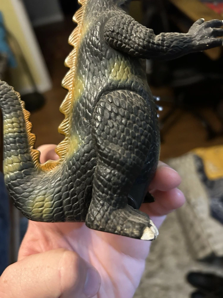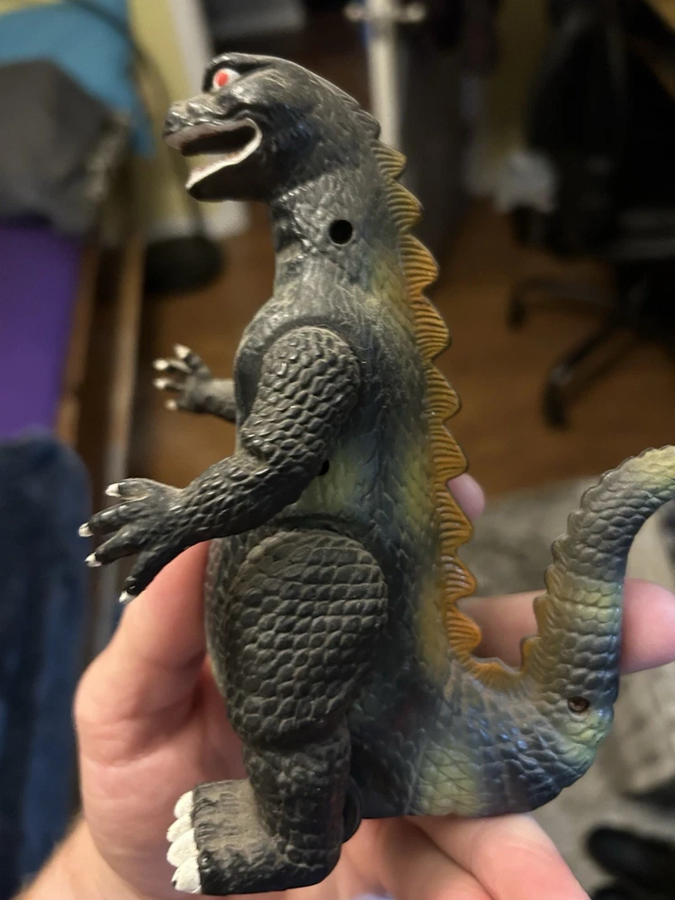 This vintage, Godzilla pull toy, pull action figure is a rare and hard to find peace. I do not have the original box, but everything on the toy does still function. The pullback function does still work and it does show normal signs of where for vintage age and does have a few spots of color loss on the white fingertips and white tips of the toes, but other than that, it is still in great shape. This would be an excellent addition to any collection. Please zoom in on photos and please ask any questions that you might have before purchasing. Payment is due at time of purchase, all items are sold as is and all sales are final. No returns accepted.