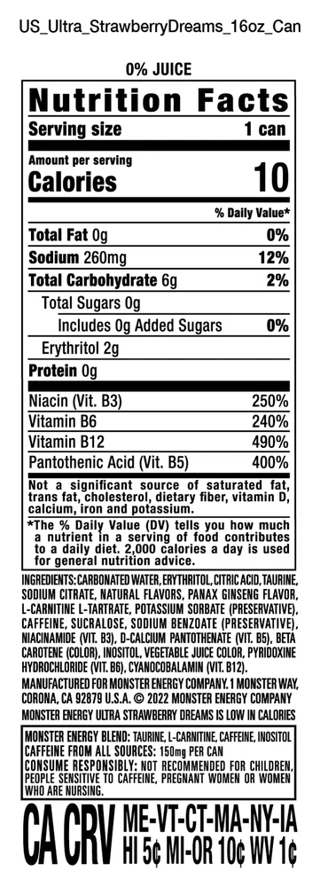 Monster Energy Ultra Strawberry Dreams, Sugar Free Energy Drink, 16 Ounce (Pack of 15) FULL FLAVOR. ZERO SUGAR I Monster Energy Ultra Strawberry Dreams has zero sugar but with all the flavor you’re accustomed to and packed with our sugar-free Monster Energy blend. TASTE WITH A PASSION: Savor this aphrodisiac. One sip and you’ll be crazy for Ultra Strawberry Dreams. UNLEASH THE ULTRA BEAST. Some people swear that strawberries are aphrodisiacs. They say if you share a double-strawberry with someone then they’ll catch feelings for you. All we know is the heart-shaped fruit makes the perfect flavor for our new zero sugar Ultra. Wonderfully sweet while slightly tart, this easy-drinking Ultra tastes like a dream. Passionately crafted with the Monster energy blend you crave; take one sip and you’ll be crazy for Ultra Strawberry Dreams. STOCK UP WITH A 15 PACK I Time to stock up. For those looking for a Monster that’s lighter tasting, has zero sugar, and contains the fill Monster Energy Blend, Monster Energy Ultra Strawberry Dreams is available in a convenient pack of 15. Product labels may vary from those pictured Some people swear that strawberries are aphrodisiacs. They say if you share a double-strawberry with someone then they’ll catch feelings for you. All we know is the heart-shaped fruit makes the perfect flavor for our new zero sugar Ultra. Wonderfully sweet while slightly tart, this easy-drinking Ultra tastes like a dream. Passionately crafted with the Monster energy blend you crave; take one sip and you’ll be crazy for Ultra Strawberry Dreams. Unleash the Ultra Beast! Shipping We offer FREE shipping on all orders! We ship within Three business days of payment, usually sooner. We use a selection of shipping services such as UPS, FedEx, USPS etc. We only ship to the lower 48 states, no APO/FPO addresses or PO Boxes allowed. Local pickups and combined shipping options are not provided at this time. Return You can return a product for up to 30 days from the date you purchased it ONLY if it's in the original condition. The product cannot be used or open. Any product you return must be in the exact same condition you received it and in the original packaging. Please keep the receipt. Feedback Customer satisfaction is very important to us. If you have any problem with your order, please contact us and we will do our best to make you satisfied. Contact Us If you have any queries, please contact us via ebay. We usually respond within 24 hours on weekdays. Please visit our eBay store to check out other items for sale! Thank you for shopping at our store.
