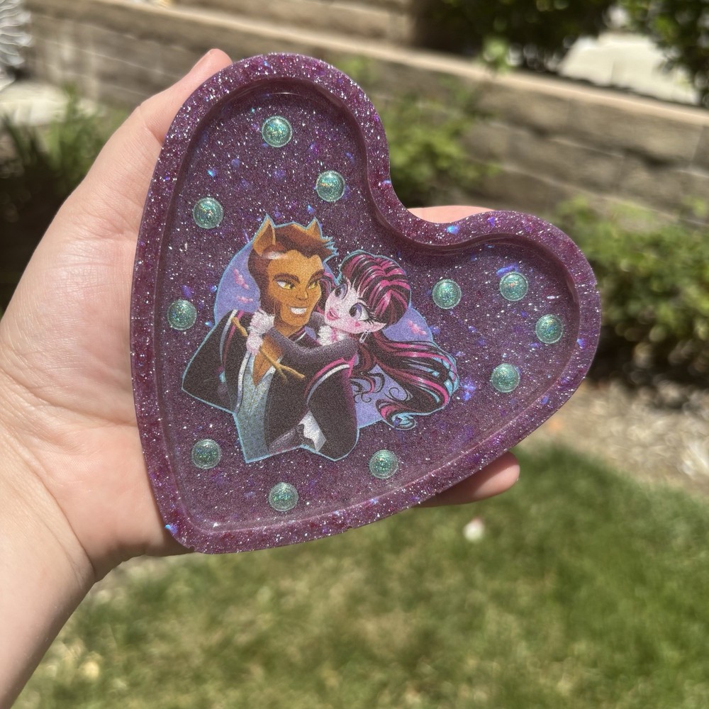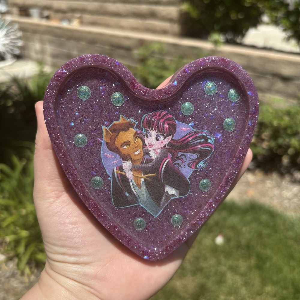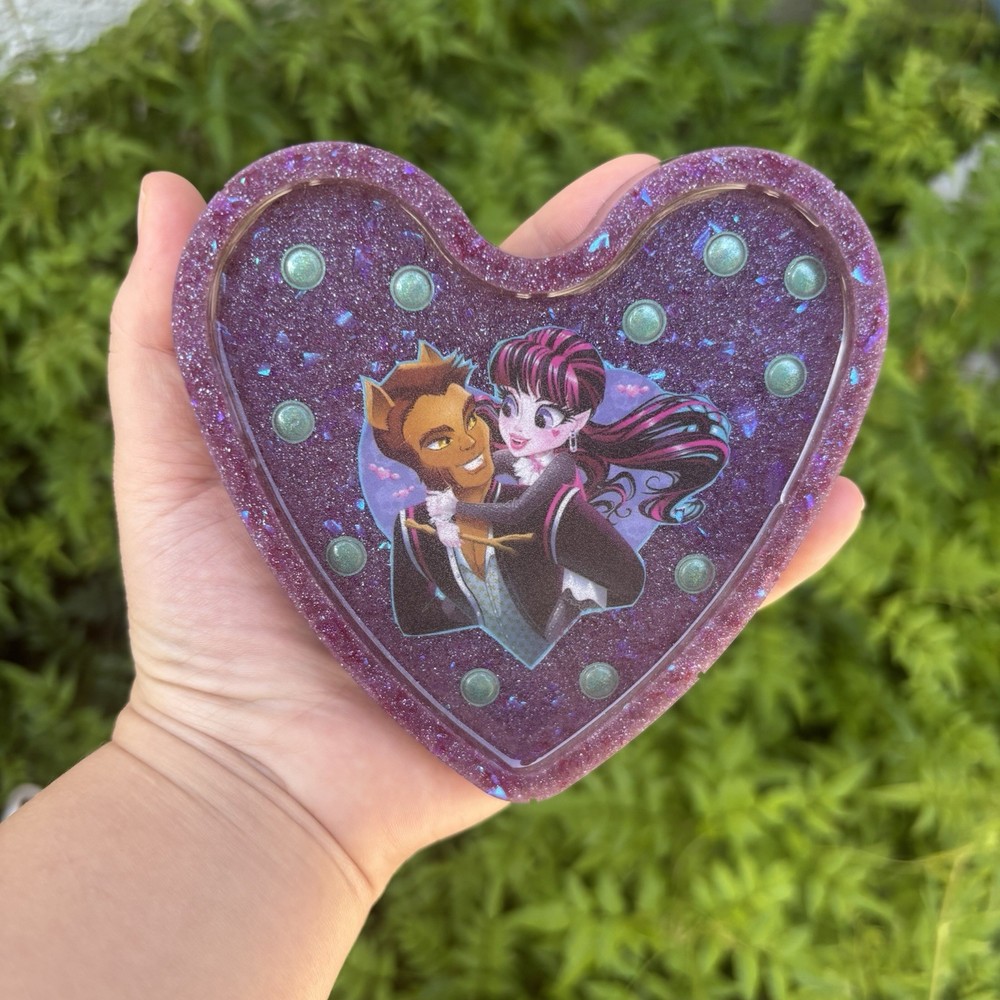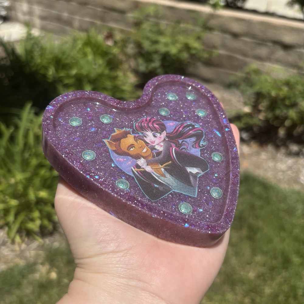 ‘Lovers and Friends’ Monster High Draculaura and Clawd Wolf Inspired Sparkly Purple Rainbow Holographic Turquoise Dotted Heart Shaped Resin Coaster Handmade by Shop EarthySmurf. *Please note, resin is an imperfect art. Craters, holes, sharp edges, bubbles and more may be present in your piece. Please examine all pictures*