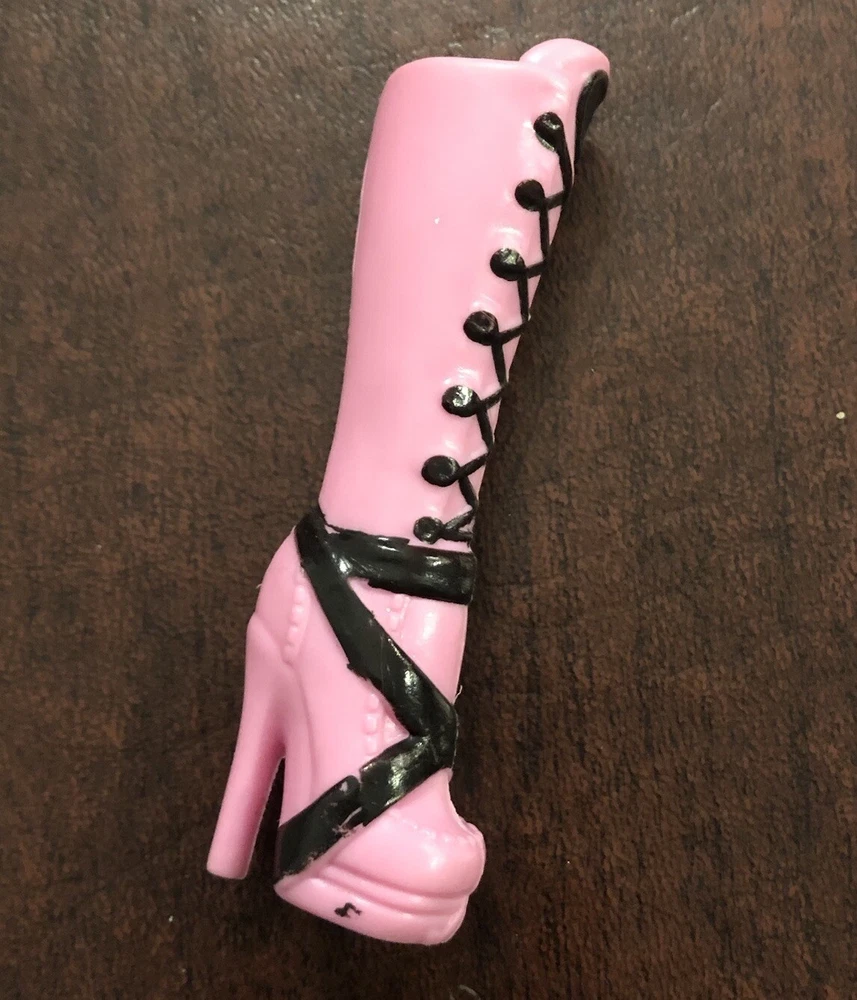 Step up your Monster High collection with the Frightfully Tall Draculaura boots! These striking pink and black shoes are the perfect accessory for your favorite fashion doll, designed to fit 17-inch Monster High dolls like Draculaura Fang. Crafted from durable plastic, they capture the essence of the goth-inspired style that fans adore. The boots feature an original design from Mattel's popular Monster High product line and are an ideal addition for collectors and enthusiasts alike. Whether dressing up for a special occasion or adding to a display, these shoes bring a touch of spooky-chic to any Monster High character's wardrobe. Single replacement boot. Right boot. Preowned