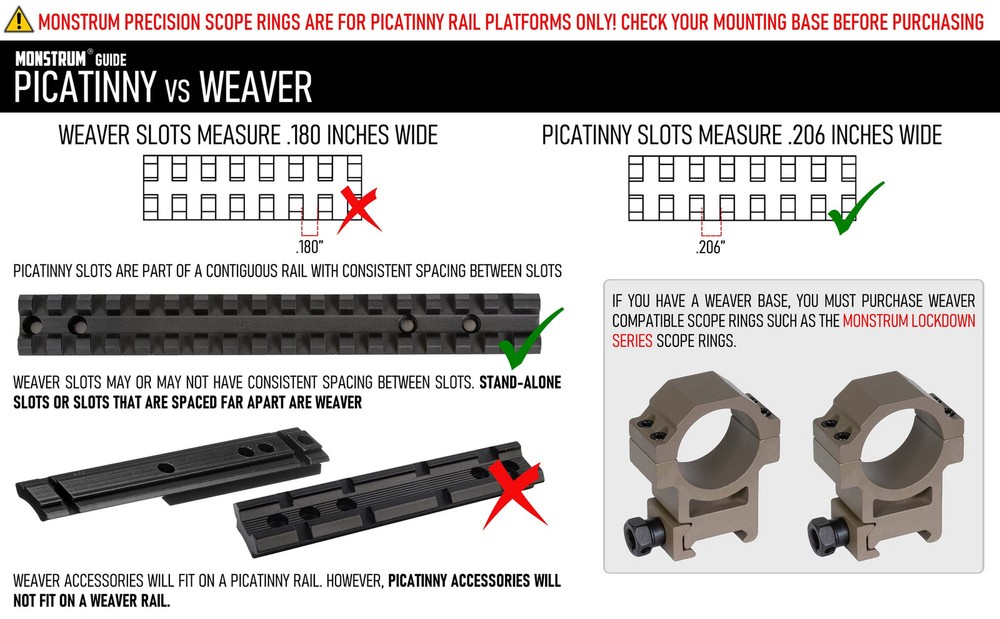 Monstrum Next Level Series Scope Rings offer the same ruggedness and reliability as our previous generation Precision scope rings but with an integrated anti-cant level bubble to check for level alignment of your rifle before each shot Imperfect vertical alignment of your scope when shooting introduces scope cant error - horizontal drift of your shots due to cant. An anti-cant level bubble corrects for this issue, allowing you to quickly ensure for proper alignment of your rifle. Scope base has integrated locking bolts that slot seamlessly into rail slots with zero wiggle for maximum gripping surface. Available in both Picatinny and Weaver versions. Available in four different heights to match the needs of any shooter: 0.85 inch, 1.00 inch, 1.20 inch, and 1.35 inch. Height is measured from the center of the rifle scope tube to the bottom plane of the scope ring base. Rings are crafted from lightweight 6061 grade aluminum, with heavy duty steel mounting hardware for extreme tolerance. The torx locking screw system allows for quick yet powerful tightening while protecting from the screws from stripping.