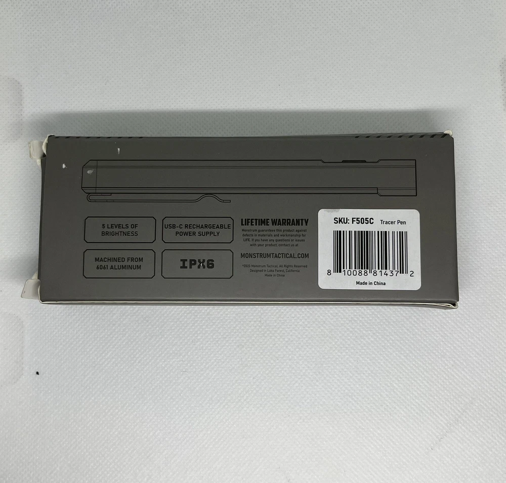 The Monstrum Tactical Tracer Pen is a slim pocket flashlight with a brightness of 1000 lumens. Its compact design makes it easy to carry and use for various outdoor activities such as camping and hiking. The flashlight is coyote brown in color and weighs 0.24 pounds, making it lightweight and portable. Message me with any questions
