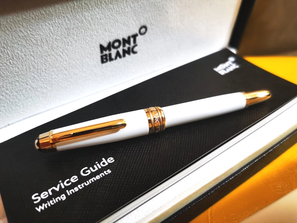 Now THIS is an amazing writing utensil for that successful, special person. Presented here is this Authentic Montblanc Meisterstuck White Gold Classique Trim 163 Rollerball mini 4.5"Pen Made In Germany This luxury writing instrument is created with a Precious Resin Barrel and Cap with Platinum Plated Rings, Fittings and Clip. The pen measures 4.5" in length and has a Silver document proof ink cartridge. One platinum-plated ring is engraved with a serial number while another is engraved with "Montblanc Meisterstuck Pix" with "Made In Germany" under the clip. This pen will be shipped in its Montblanc gift box with its Service Guide booklet.