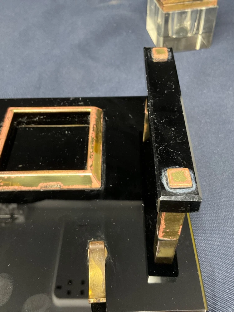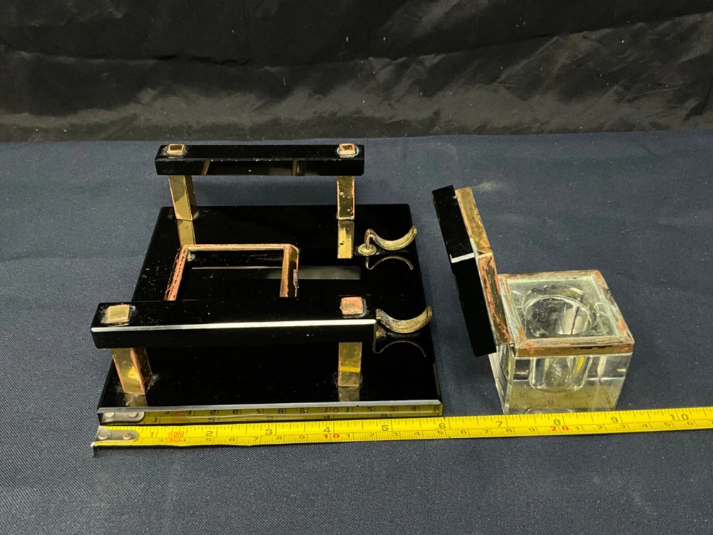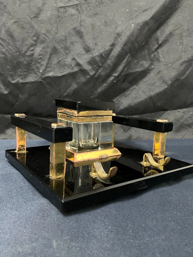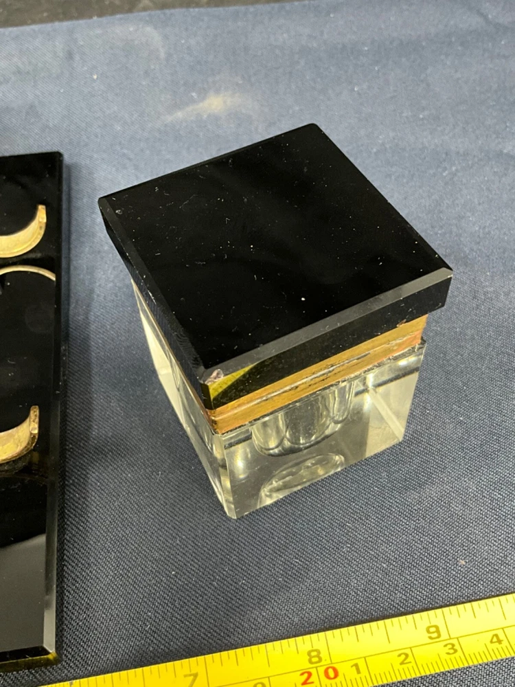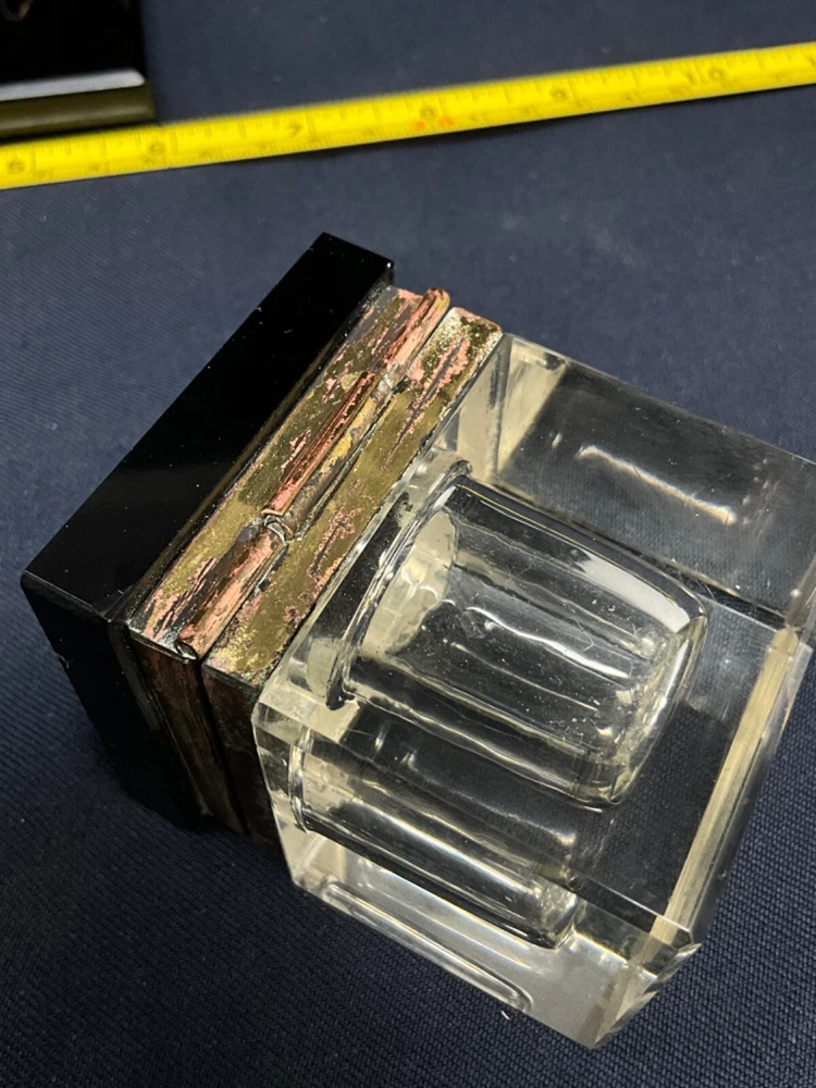 Black onyx crystal inkwell. Piece came from retired Pen Shop. Inkwell appears to be in made by Montblanc. There are no makers marks present (only GERMANY ). Therefore in style of Montblanc. Piece shows wear. Oxidized brass can be seen. Crystal inkwell shows 2 spots with chips (see pictures). Onyx lid also shows 2 chips, some haziness can be seen on the surface. Measures approx 6.25” x 5.75” x 3.5”. Marked on the brass “Germany”. Great Christmas present for any collector , gift for lawyer attorney , young student , father , husband.