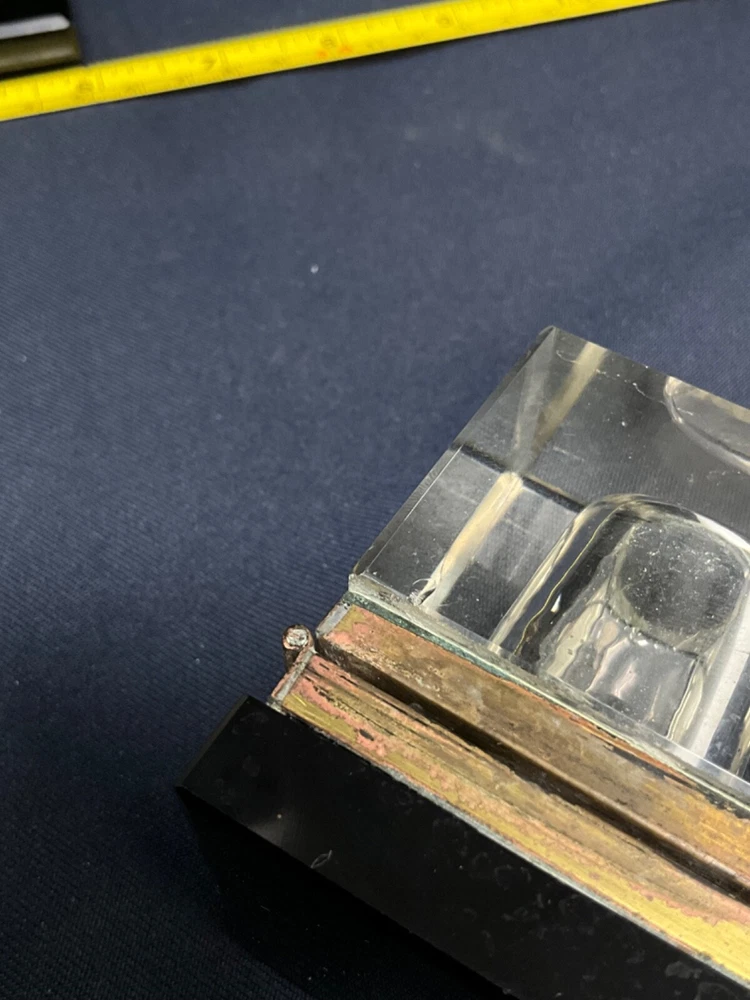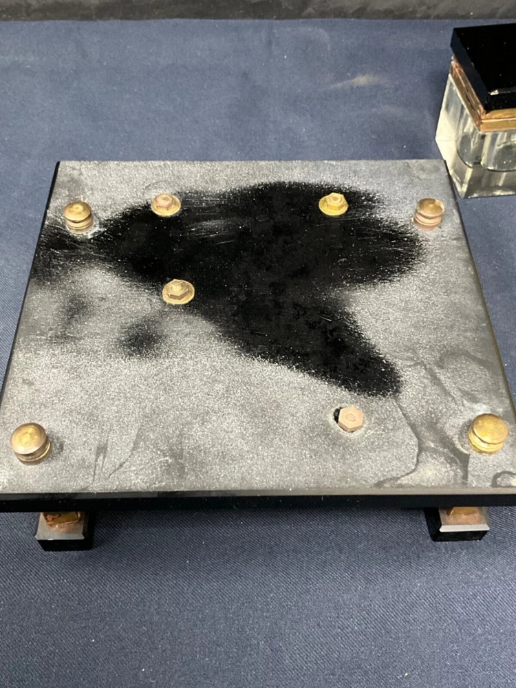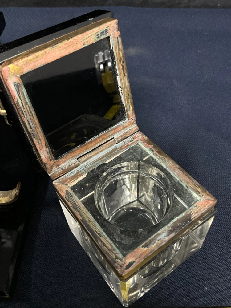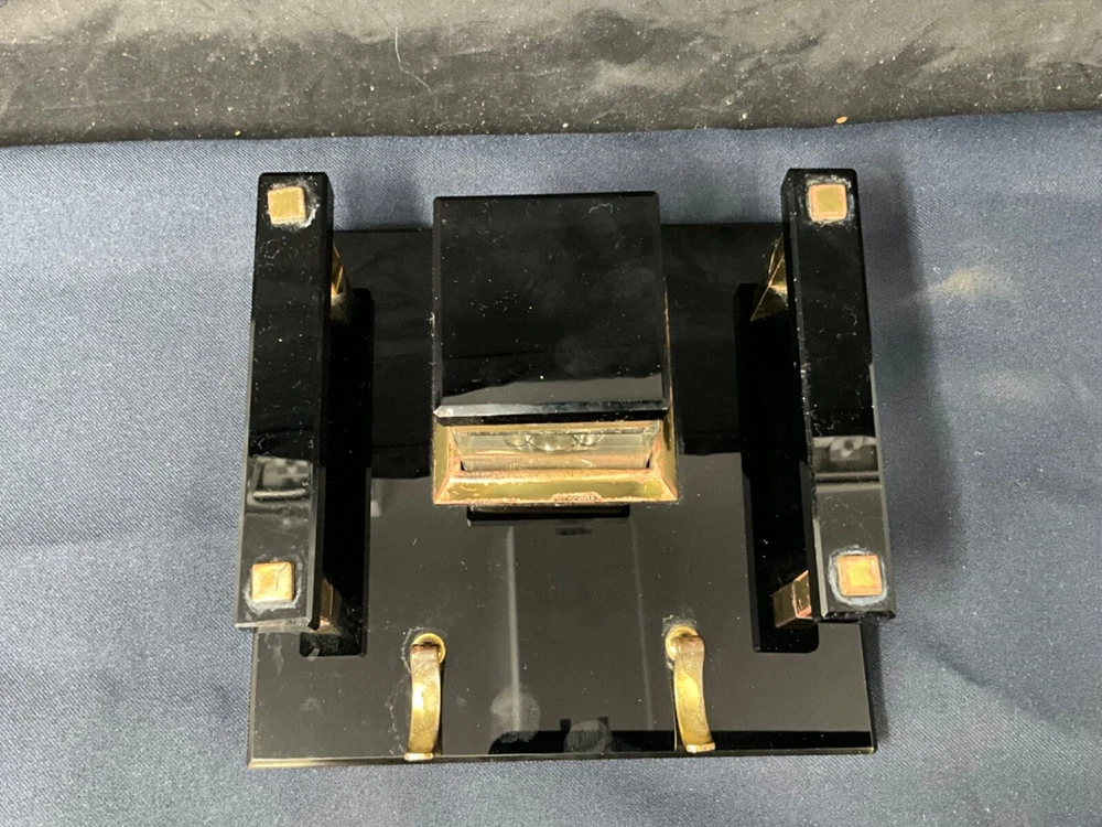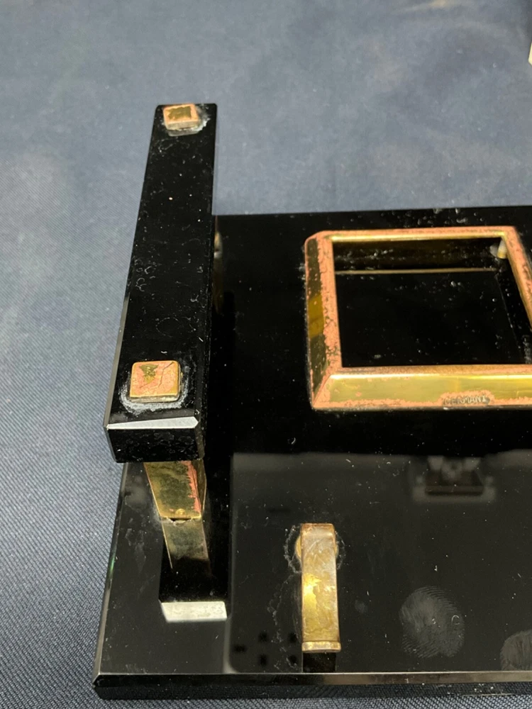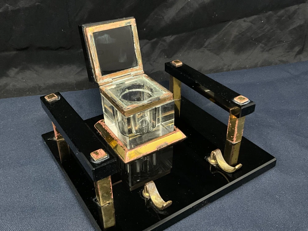 Black onyx crystal inkwell. Piece came from retired Pen Shop. Inkwell appears to be in made by Montblanc. There are no makers marks present (only GERMANY ). Therefore in style of Montblanc. Piece shows wear. Oxidized brass can be seen. Crystal inkwell shows 2 spots with chips (see pictures). Onyx lid also shows 2 chips, some haziness can be seen on the surface. Measures approx 6.25” x 5.75” x 3.5”. Marked on the brass “Germany”. Great Christmas present for any collector , gift for lawyer attorney , young student , father , husband.
