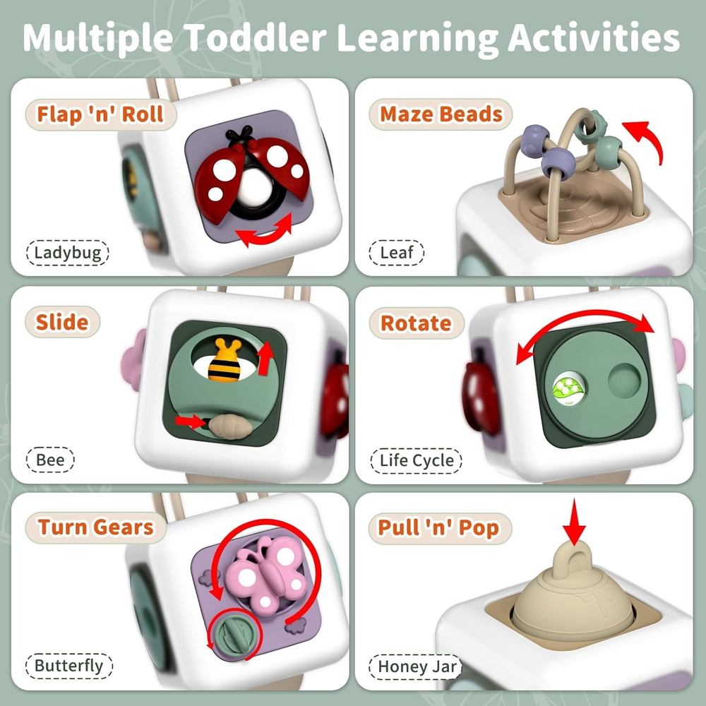 6-in-1 Cognitive Toy: This FunQuest Busy Cube features six special learning activities. With cute images of butterfly, bee and ladybug, the 6 sides exercise different fine hand movements respectively. Very well made montessori toys for 1 year old Develop Skills: This activity cube strengthens parent-child bonds and enhances skills like hand-eye coordination, concentration and problem-solving. It's designed with 6 different motor skill activities, inspired by montessori principles, supports focus and sensory development Compact and Travel-Friendly: This sensory busy toy is robust and impact-resistant, incredibly convenient for road trips and airplane travel. This brain-boosting activity game will keep your kids engaged and entertained for hours on the go Well Made with Quality Care: The insect busy cube is crafted from non-toxic, BPA-free materials with sanded edges to ensure your child's safety during hours of engaging play. Please keep it clean by wiping with mild Gift-Worthy Choice: The lightweighted and portable Busy Cube toy is a versatile gift choice. It's great for newborns, birthdays, Christmas, Thanksgiving, Easter, travel, and as a teaching aid. This makes it a great toddler travel companion and one of the best gifts for both little girls and boys Product Description The video showcases the product in use. The video guides you through product setup. The video compares multiple products. The video shows the product being unpacked. Busy Garden Cube Merchant Video