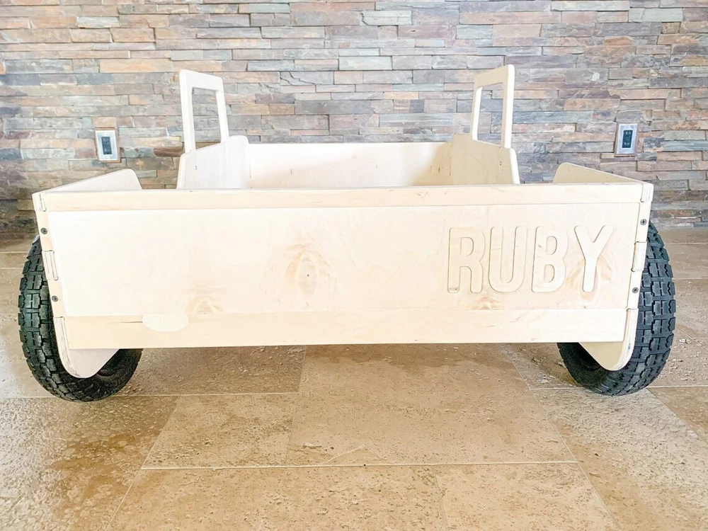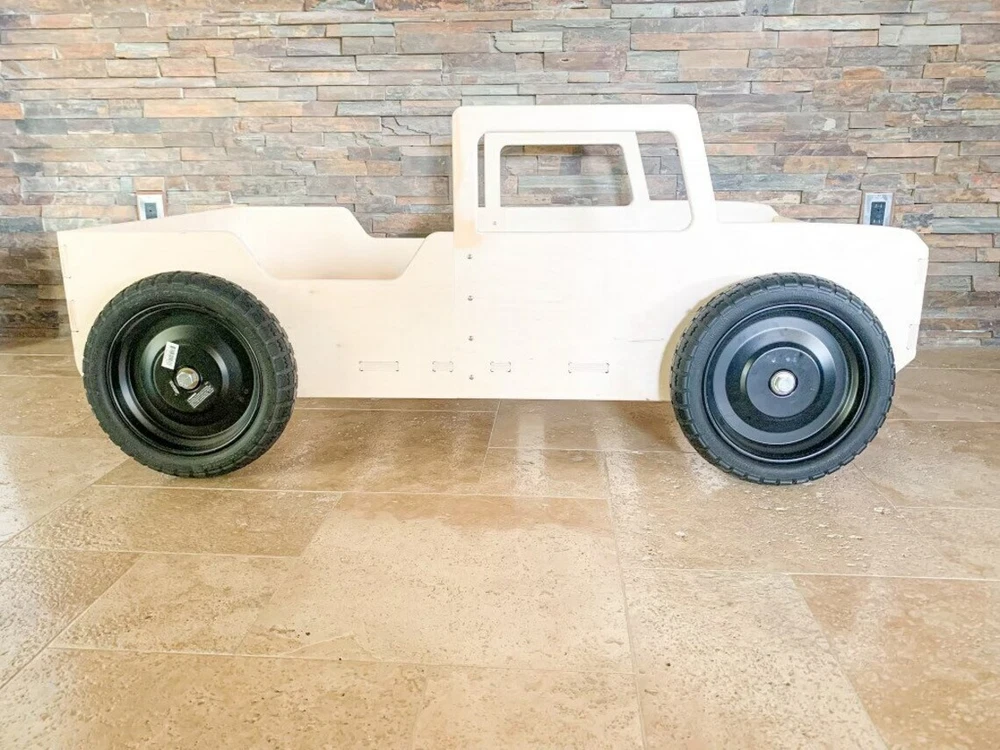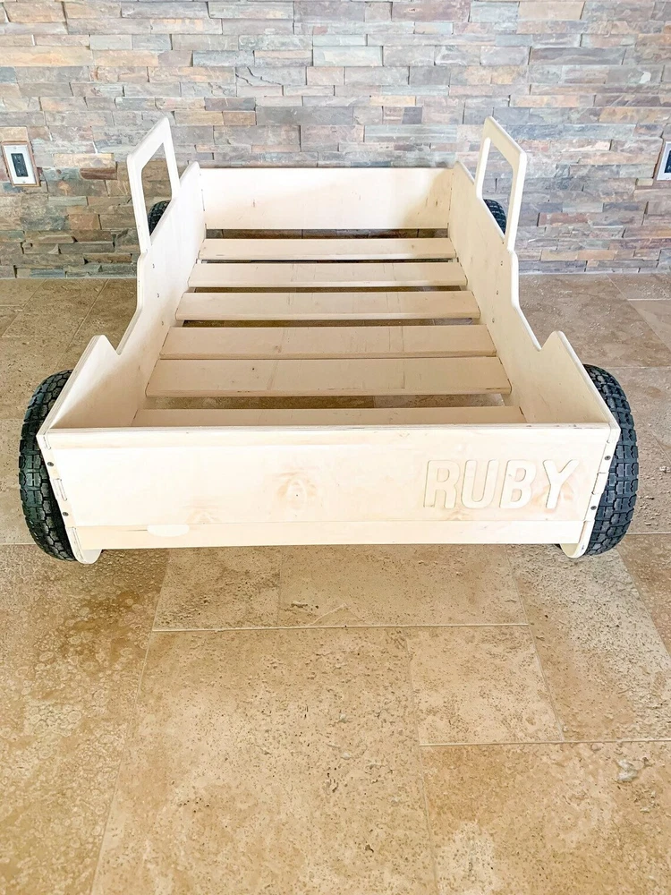 MONTESSORI TODDLER VEHICLE BED with ROLLING WHEELS MATTRESS NOT INCLUDED ★ Very Solid & Strong design | Made from 5/8" USA Baltic Birch plywood ★ This product comes pre-sanded. ★ The wood is untreated and beautiful left as-is, but can also be stained, painted or sealed should you chose to do so! ★ Bed is 53.5” long , 10" tall, and 32" wide. Fits most crib mattress’ including Ikea. ★ Assembly required - Very very easy to put together. All pieces slot together, hardware and detailed instructions included. ★ Tools Required: Philips Screwdriver and a Rubber Mallet (or a hammer wrapped in a t-shirt- Wood Joints can be tight depending on humidity levels) ★ Made to order with pride in the USA HOW DO I PERSONALIZE MY PRODUCT? Easy by clicking on the "Message to Seller" Section on Checkout and adding the customization information there. (10 Characters Max) GENERAL INFORMATION/DISCLAIMERS: -Wood is a natural material. Variations in color, knots, texture and grain may occur. -This product is made with Baltic Birch Plywood- a decorative hardwood plywood with a veneer core. -This product is both TSCA VI and CARB II compliant. -This product is manufactured in Las Vegas, NV. -This product comes pre-sanded. All products are wiped down prior to packaging, however, some wood dust may be present upon opening. -This wood product is untreated. It can easily be stained or painted once assembled. -Given that the wood is untreated, excessive exposure to the sun and/or water and other liquids may cause warping and/or staining over time. We suggest sealing your product if you plan to use it outdoors or around water/liquids.