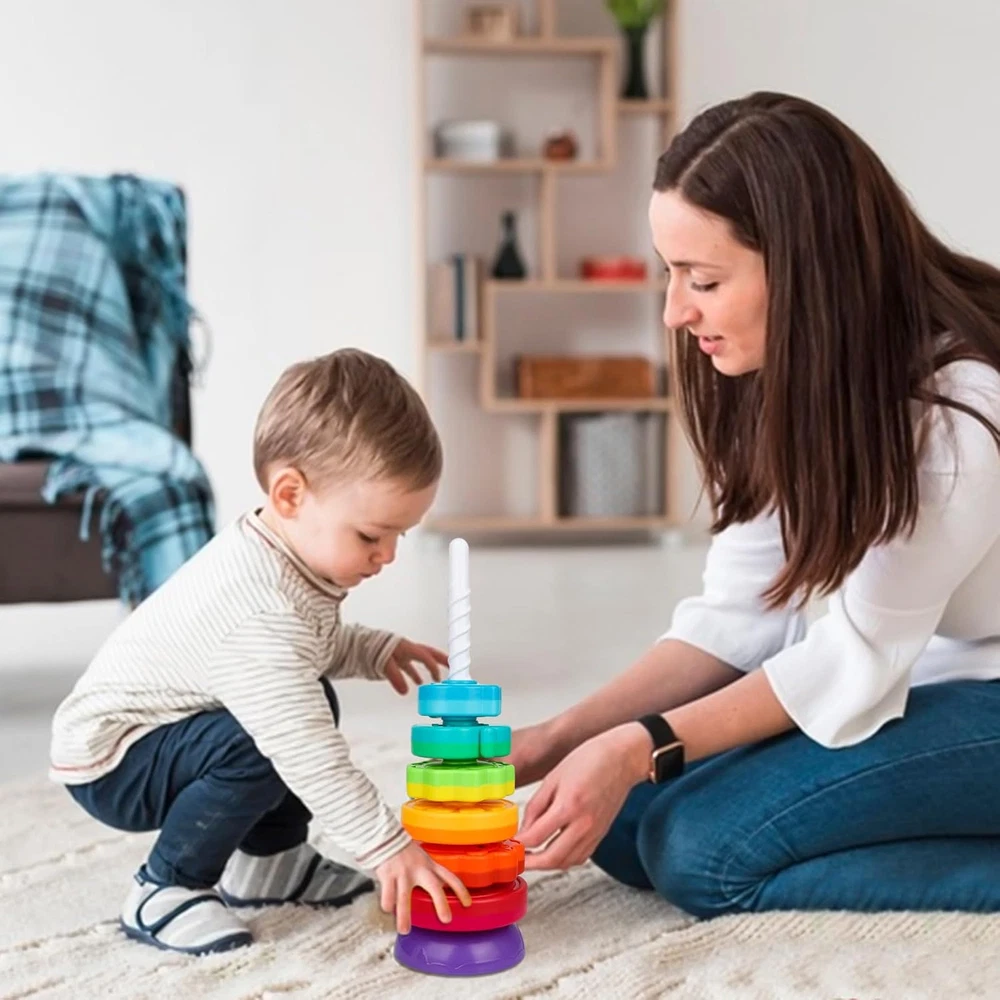 EDUCATIONAL BABY TOY: It is an upgraded version of the stacking ring baby toy. Incorporating fruit and animal themed shapes, it can be flexibly stacked in any way, with dual different base designs, swinging or sturdy. Baby can sort the discs by color, shape and size. PREMIUM SAFETY MATERIAL: Suitable for children over 1 year old, made of sturdy and durable ABS plastic, BPA free.Passed rigorous laboratory safety tests to ensure that every detail is safe for your baby. MONTESSORI BABY TOYS: Encourages babies to learn color and shape recognition, cause and effect relationships, classification skills, fine motor skills, hand-eye coordination, dexterity, and triggers their desire to explore. SENSORY EXPLORATION TOYS: Textured discs and bright colors work well to attract children's attention and stimulate their curiosity, visually and tactilely, helping to trigger sensory exploration. It is also a sensory toy for children with autism. BEST GIFT FOR BABY: Loved by thousands of families. It is perfect for toddler gifts for both boys and girls, ideal gift choice for occasions such as birthdays, Easter, Christmas, Children's Day and New Year's Day. Product Description Colorful and Diverse Rings Covering themes such as fruits & animals & flowers, each ring is double-colored and more attractive. Dual Base Design One side is stabilized to stay upright, the other side is wobbly for added fun. More than a toy-sorting, stacking, spinning-it's also a mark of growing up!