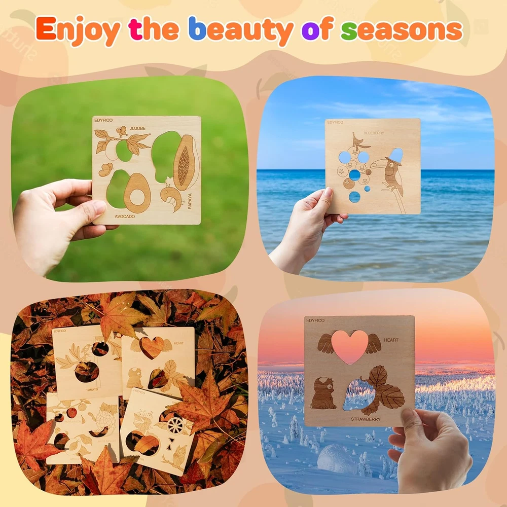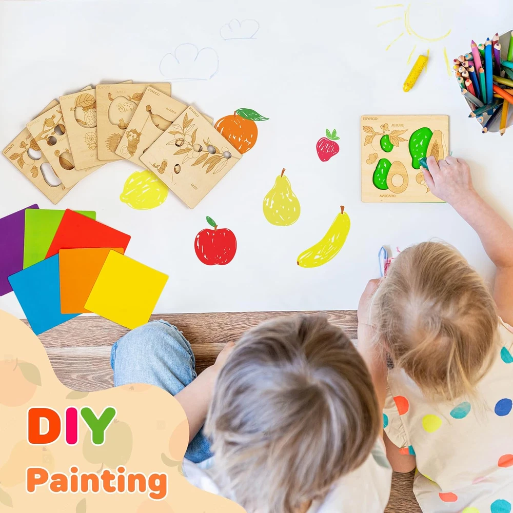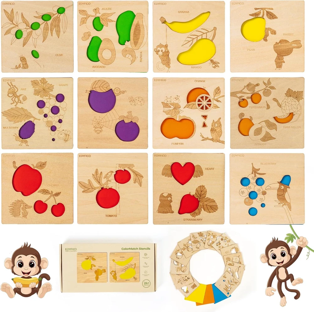2-IN-1 EARLY CHILDHOOD MONTESSORI TOYS -These montessori toys for 2 year old include 12 smooth, polished wooden boards, each printed with 20 common fruit patterns and cute little animals, along with 3 colorful cardboard pieces. These colorful sensory toys will help children learn to recognize fruits and match colors during play! MULTIPLE DIY FUN -With the wooden shape color sorter, kids can engage in simple matching of fruit patterns and color cards. They can also utilize the unique hollow design of the wooden boards to explore the fun of light and shadow. Additionally, kids can use a paintbrush at home to trace the fruits and draw their favorites, or enjoy DIY painting to color the fruits with their favorite hues! TODDLER'S FRUIT PARADISE -The fruit-themed learning toys feature 20 common fruits found in daily life, such as apples, bananas, blueberries, oranges, strawberries, and mangoes. The open ended toys can fully capture children's attention, and parents can interact with their children to find colors in everyday life, promoting the relationship and communication between parents and children FUNNY OUTDOOR TOYS -Designed for playing and learning color recognition, shapes, classification, and analysis both indoors and outdoors, whether at home or on the go. This set of travel toys is suitable for children aged 1 to 3 years old. The set is small and lightweight, making it easy to carry and store, so children can enjoy it anywhere—perfect for home, school, parks, or travel BUY WITH CONFIDENCE -Made with non-toxic, high-quality materials, featuring rounded corners and a smooth, burr-free finish. Our STEM toys offer exceptional quality for your toddler's early education! Matching instructions and game ideas are always available via the QR code in the instruction booklet Product Description