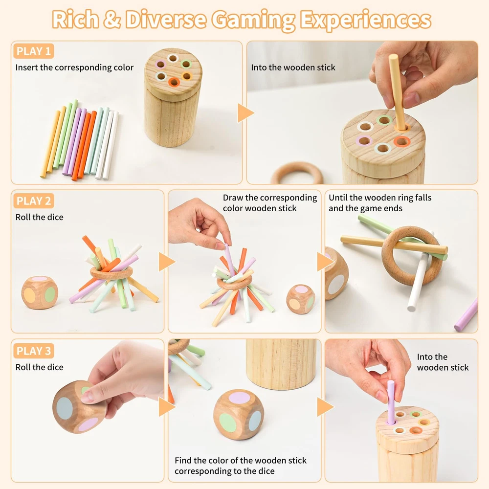 Montessori Toys for Babies 6 Months to 3 Year Old,Fine Motor Skills Toys for Toddlers 1-3,Wooden Color Sorting Games Sensory Educational Learning Infant Toys,Developmental Toys Gifts for 6 Month Old 【MONTESSORI TOYS FOR 6 MONTHS TO 3 YEARS】This toy design is inspired by the Montessori philosophy and is perfect for infants and toddlers from 6 months to 3 years old. Toddlers are obsessed with inserting objects into slots or holes and enjoy doing so. This improves their fine motor skills, color sorting, size perception, pincer grasp, hand-eye coordination and problem solving, making it a perfect brain-building activity. 【RICH AND VARIED GAME MODES】 Play 1: you can guide the baby to grasp the wooden stick, according to the color of the stick to match the same color of the hole and insert it; Play 2: you can roll the dice, so that infants aged 1-3 years old to find the corresponding color of the stick and put it into the corresponding hole; Play 3: according to the color of the dice rolled out, the corresponding color of the wooden stick, when the stick makes the When the drawn stick makes the circle fall, the game ends, and the one with the highest score wins! 【QUALITY MATERIALS AND SAFETY FIRST】This sensory educational learning toys are made of natural high quality wood, the wooden toys use safe and non-toxic environmentally friendly water-based paint, the surface of the toys are smooth and rounded, no burrs, won't cause any harm to your baby. What's more, the upgraded size of the wooden cylinder is 5.2 inches in length, the wooden stick is upgraded to 4 inches in length, the wooden ring is 2.2 inches in diameter, and the dice is 1.4 inches in diameter, which avoids the risk of swallowing for babies from 6 months to 3 years old. 【STORAGE POCKET FOR EASY STORAGE AND TRAVEL CARRY】Our fine motor training wooden cylinder toy comes in baby's favorite size and shape with a canvas drawstring pouch that's perfect for small hands to hold. Its design and included storage bag make it easy to store after play and travel with, perfect for home, school or long car rides, allowing toddlers to enjoy the toy at home, in the classroom, or even on the go. 【PERFECT GIFT FOR BABIES AND TODDLERS】If you're looking for an amazing gift for boys and girls ages 6 months to 3 years old, then you'll love our Fine Motor Training Wooden Cylinder Wooden Stick Toys.Toddler Sensory Toys for 1-3 years old make the perfect adorable Christmas, Children's Day, Birthday, and any Holiday Gift for Preschoolers. The color sorting toys are designed with vibrant hues and interactive elemental tactile designs, making them the perfect preschool toys for parents and teachers to promote learning and development through play. 【MONTESSORI TOYS FOR 6 MONTHS TO 3 YEARS】This toy design is inspired by the Montessori philosophy and is perfect for infants and toddlers from 6 months to 3 years old. Toddlers are obsessed with inserting objects into slots or holes and enjoy doing so. This improves their fine motor skills, color sorting, size perception, pincer grasp, hand-eye coordination and problem solving, making it a perfect brain-building activity. 【RICH AND VARIED GAME MODES】 Play 1: you can guide the baby to grasp the wooden stick, according to the color of the stick to match the same color of the hole and insert it; Play 2: you can roll the dice, so that infants aged 1-3 years old to find the corresponding color of the stick and put it into the corresponding hole; Play 3: according to the color of the dice rolled out, the corresponding color of the wooden stick, when the stick makes the When the drawn stick makes the circle fall, the game ends, and the one with the highest score wins! 【QUALITY MATERIALS AND SAFETY FIRST】This sensory educational learning toys are made of natural high quality wood, the wooden toys use safe and non-toxic environmentally friendly water-based paint, the surface of the toys are smooth and rounded, no burrs, won't cause any harm to your baby. What's more, the upgraded size of the wooden cylinder is 5.2 inches in length, the wooden stick is upgraded to 4 inches in length, the wooden ring is 2.2 inches in diameter, and the dice is 1.4 inches in diameter, which avoids the risk of swallowing for babies from 6 months to 3 years old. 【STORAGE POCKET FOR EASY STORAGE AND TRAVEL CARRY】Our fine motor training wooden cylinder toy comes in baby's favorite size and shape with a canvas drawstring pouch that's perfect for small hands to hold. Its design and included storage bag make it easy to store after play and travel with, perfect for home, school or long car rides, allowing toddlers to enjoy the toy at home, in the classroom, or even on the go. 【PERFECT GIFT FOR BABIES AND TODDLERS】If you're looking for an amazing gift for boys and girls ages 6 months to 3 years old, then you'll love our Fine Motor Training Wooden Cylinder Wooden Stick Toys.Toddler Sensory Toys for 1-3 years old make the perfect adorable Christmas, Children's Day, Birthday, and any Holiday Gift for Preschoolers. The color sorting toys are designed with vibrant hues and interactive elemental tactile designs, making them the perfect preschool toys for parents and teachers to promote learning and development through play. Shipping from the USA All of our products are shipped from the USA, ensuring quick delivery to your destination. Payment We offer the following payment methods: PayPal, credit card, bank transfer, and eBay's secure payment system. Free Shipping & Free Returns Shipping within the USA is FREE. Additionally, any return is absolutely free for you. Risk-Free Purchase You have the option to return an item within 30 days without any justification. We cover the return shipping costs! Fast Shipping We ship immediately upon receipt of payment. Generally, the package is delivered within 2-3 days in the USA. If it takes longer, we will contact you. Quality and Costs Made in Europe, USA, China No customs fees or ad
